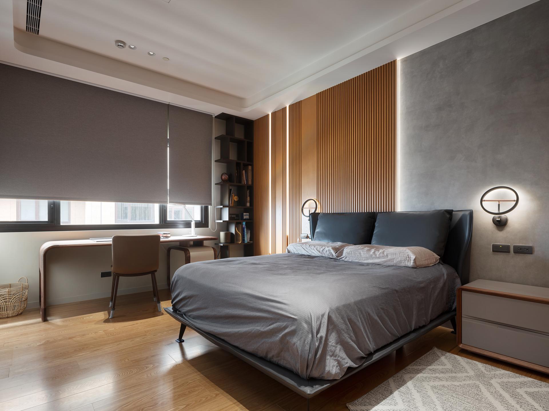 Transitioning from the vibrant public spaces to the more intimate private domains, one will see that the master bedroom envelops one in a tranquil ambiance. A cohesive backdrop is established through gray-scale specialty coatings and elegant wooden lattice facades, while soft, low-interference lighting fosters an atmosphere of peaceful relaxation. In contrast, the secondary bedroom features minimalist furnishings paired with textured relief wall panels, where geometric undulations come to life, enriching the visual experience as light and shadow play across the surfaces.