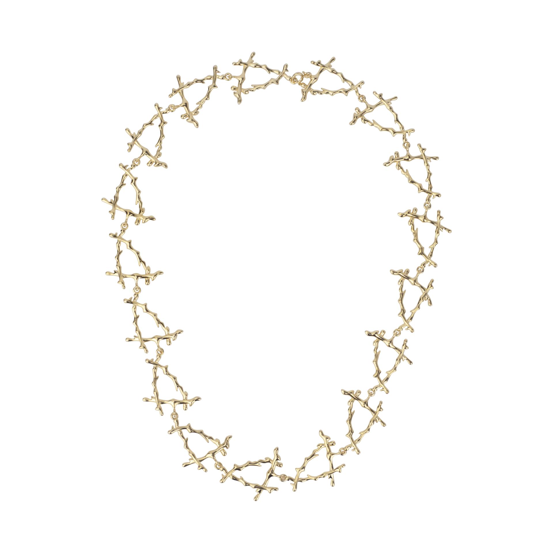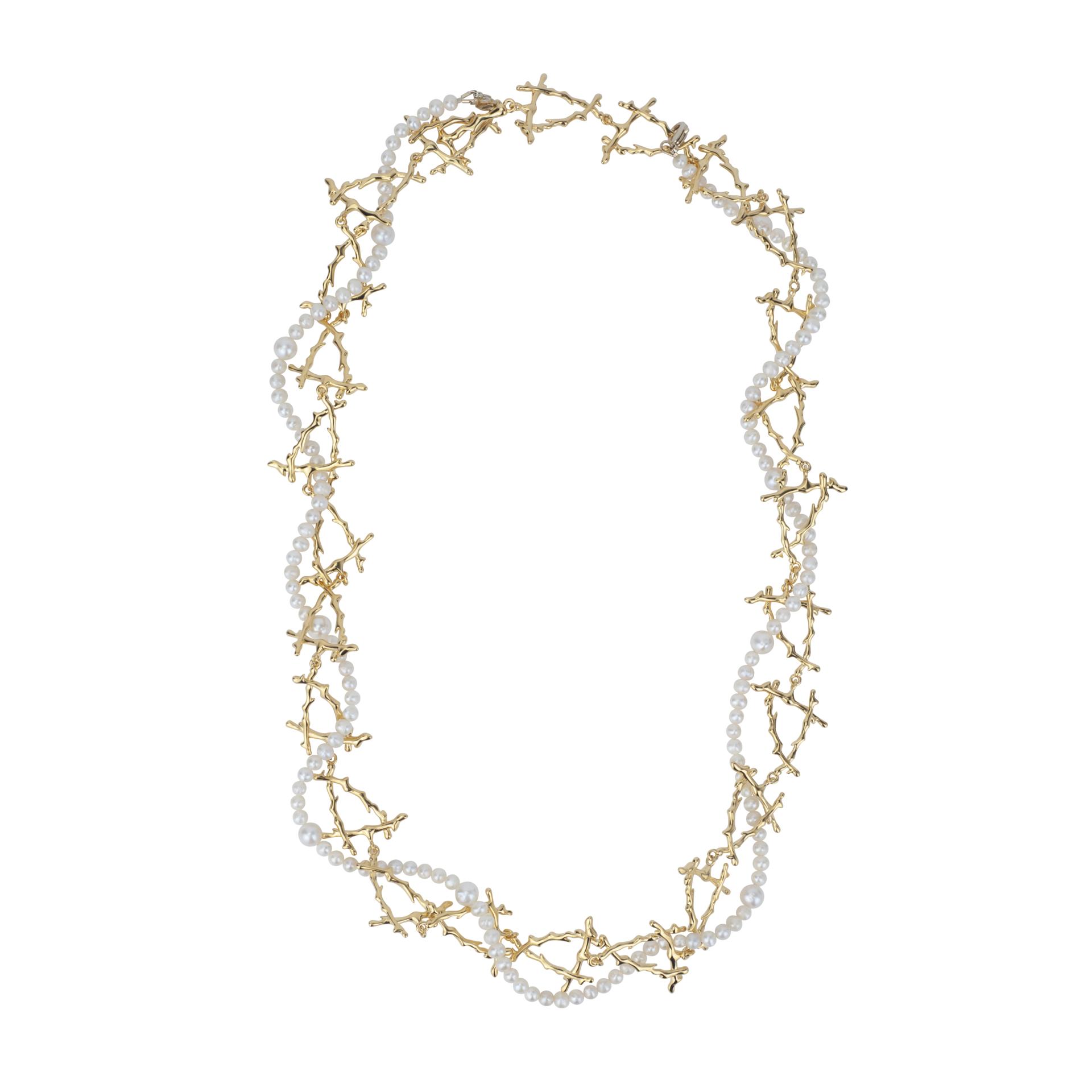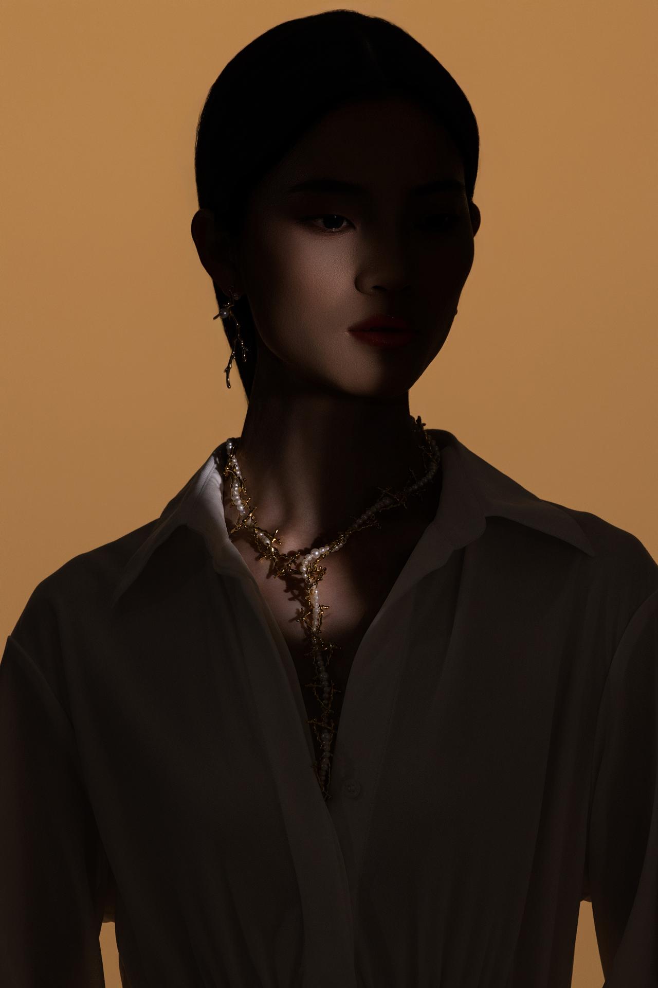 Thistles and Thorns necklace celebrates modern women who uphold resilience, strength and grace while embracing their multiple life roles. It draws inspiration from thorns in the natural world, blending bold, unyielding lines with smooth, lustrous natural freshwater pearls to resemble a delicate fruit nestled amidst a bed of thorns. Thorns stand for challenges in life and a shield of protection, while pearls embody the softness and radiance refined through trials. This contrast—striking yet delicately balanced in design—binds flexibility and fortitude together, capturing the belief that light still lingers even along a path tangled with thorns.