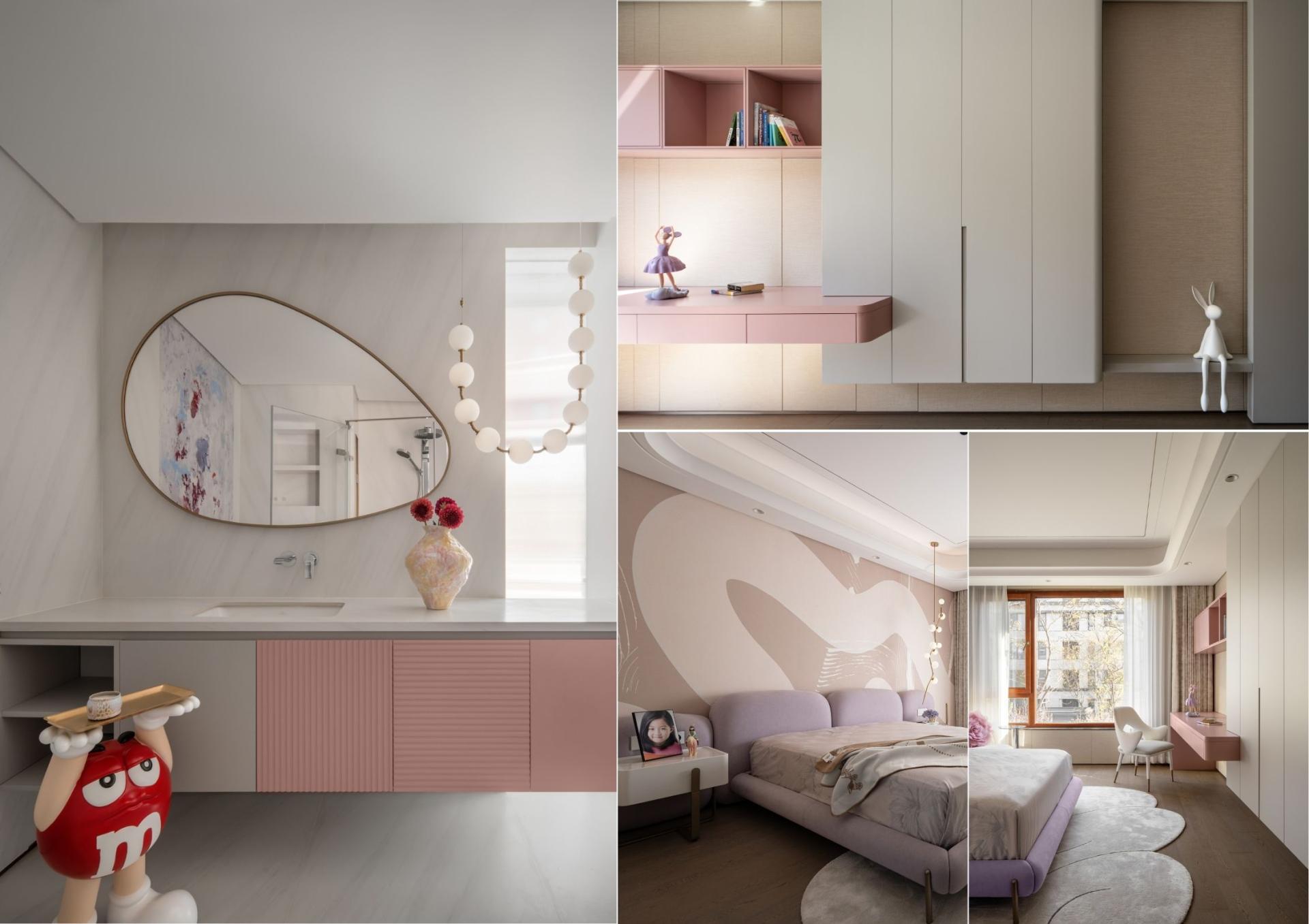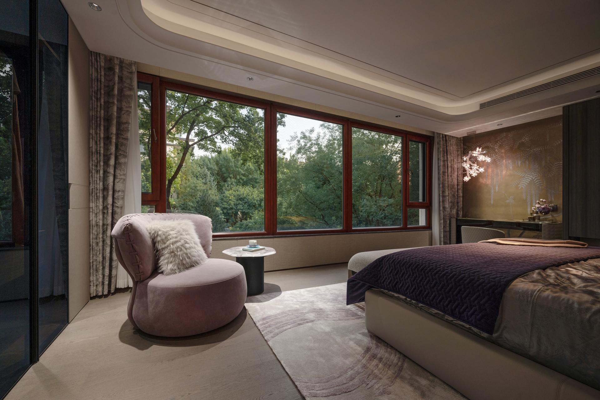 The private quarters balance meticulous detail with warmth. An end-scene painting in the corridor alleviates its length, and an extensive storage system is discreetly integrated within walls. The daughter's room is softly defined by curved lines and shares a flexible storage space with the master suite. The master bedroom's reconfigured layout prioritizes the window-framed scenery as a daily morning tableau. The son's room cultivates a crisp, handsome character through defined volumes and textured materials, while the study invites light through glass partitions, with walnut wood enveloping the space to form a serene vessel for contemplation.