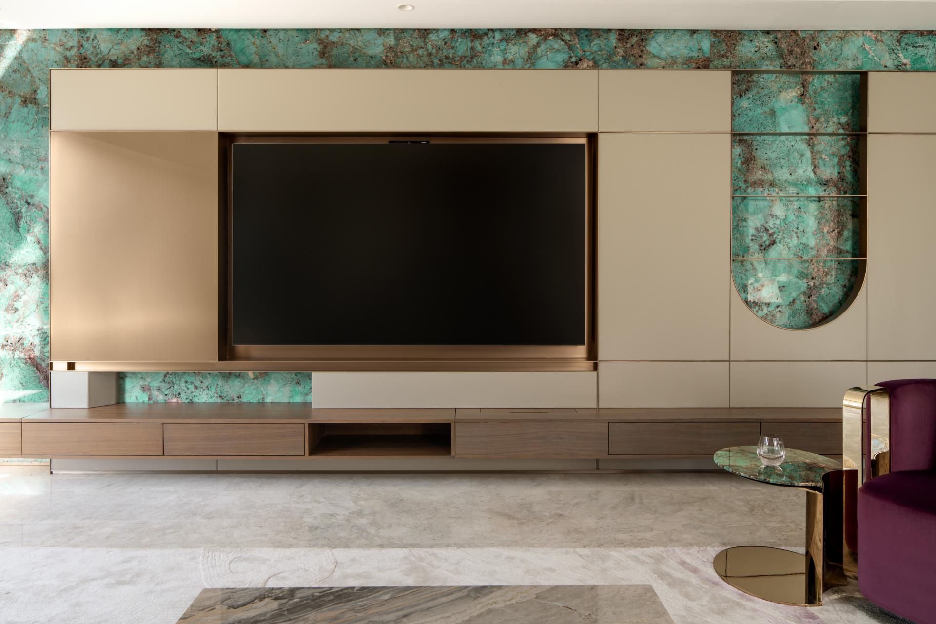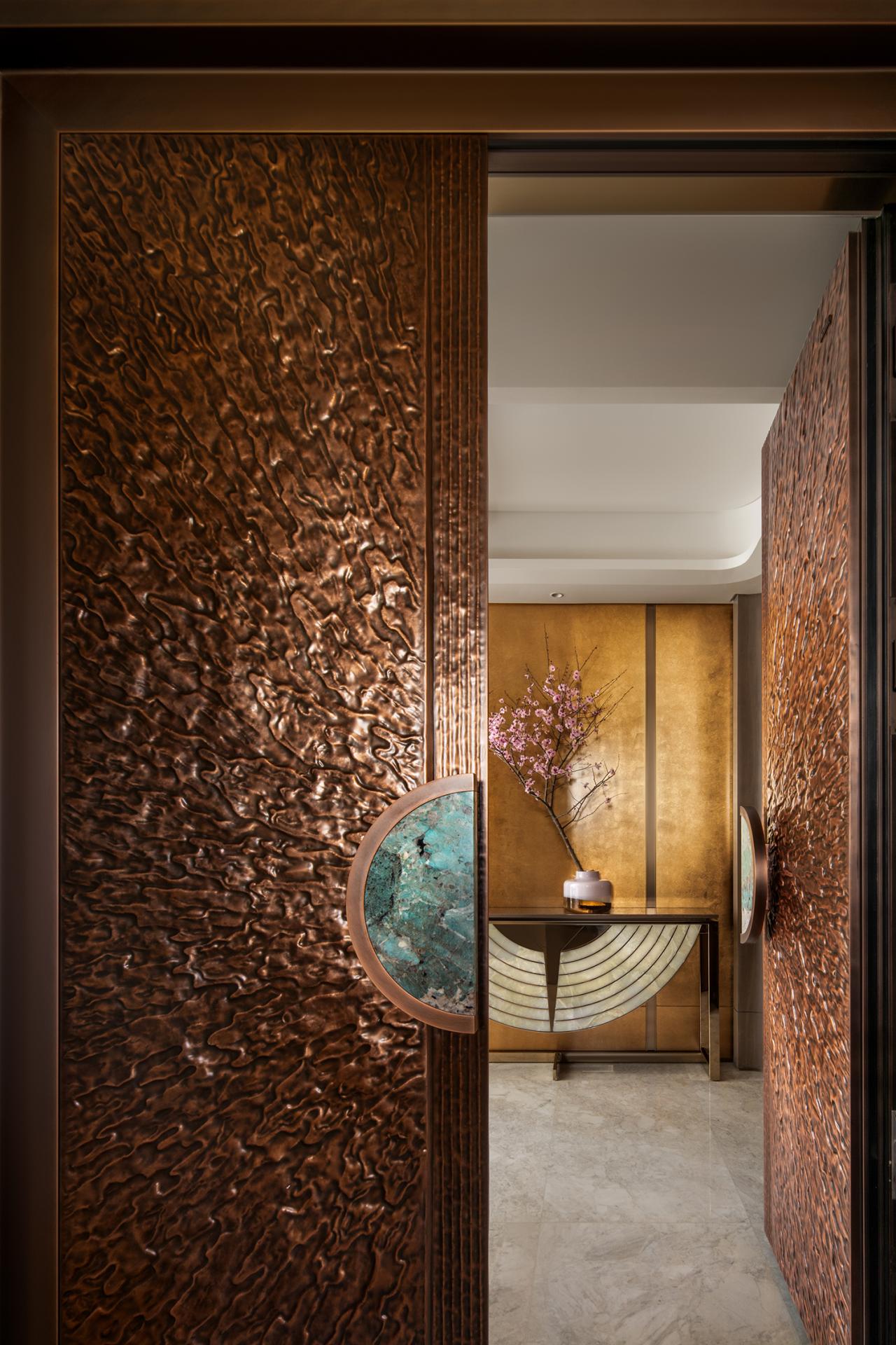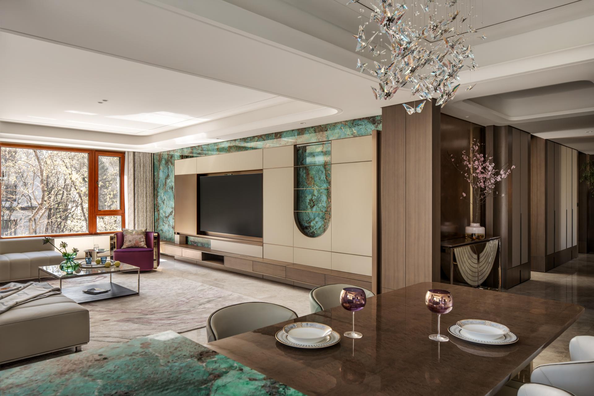 The spatial narrative begins with an intangible cultural heritage engraved copper door and a traditional screen, heralding a poetic dwelling. The living room, grounded in walnut wood and Amazon Green luxury stone, frames and captures shifting mountain vistas and drifting clouds. Accents of purple, cherished by the hostess, engage in a lively dialogue against the deep green backdrop. The dining area features a multifunctional island, becoming the heart of family interaction, while concealed storage maintains visual purity.
