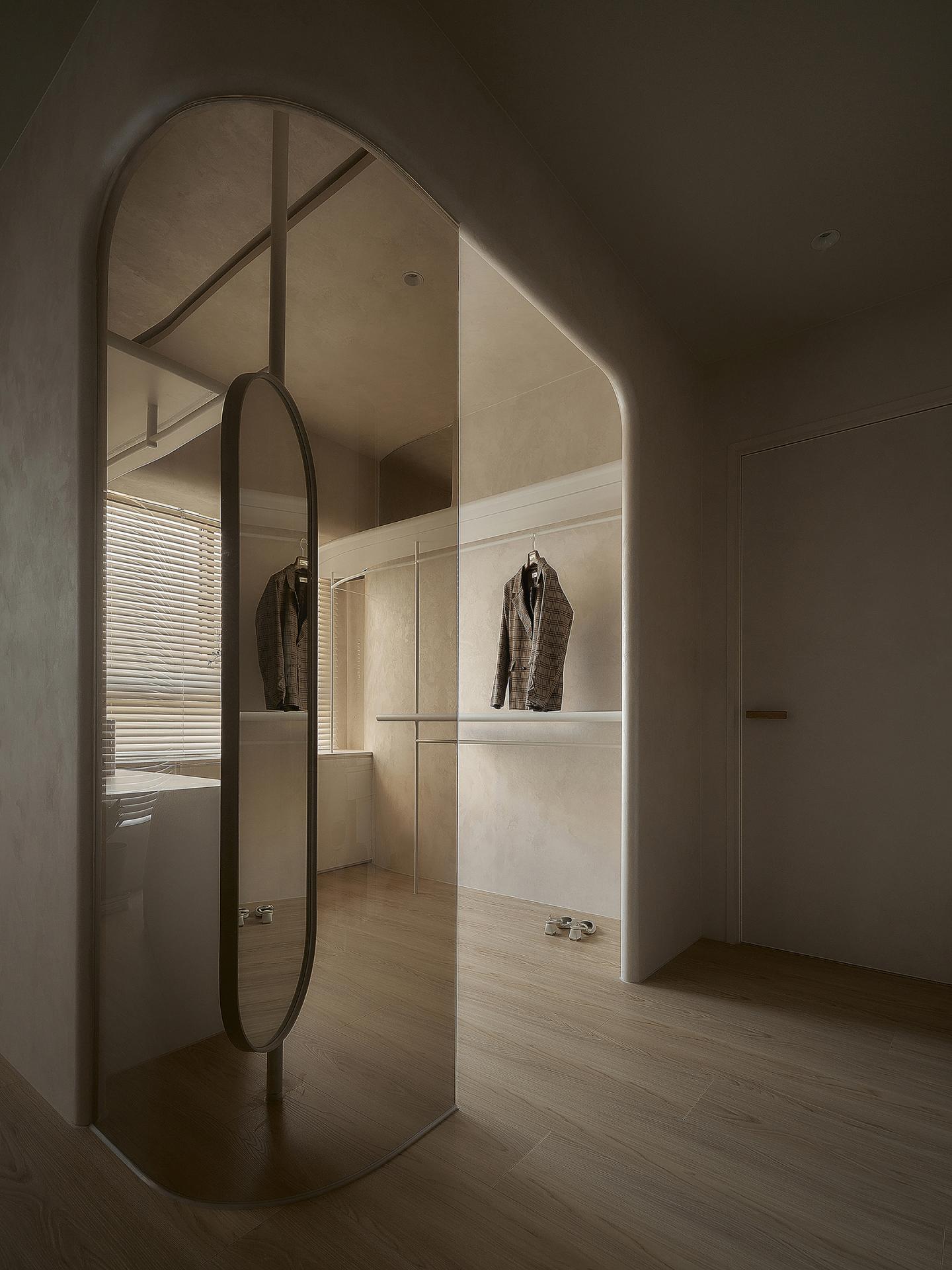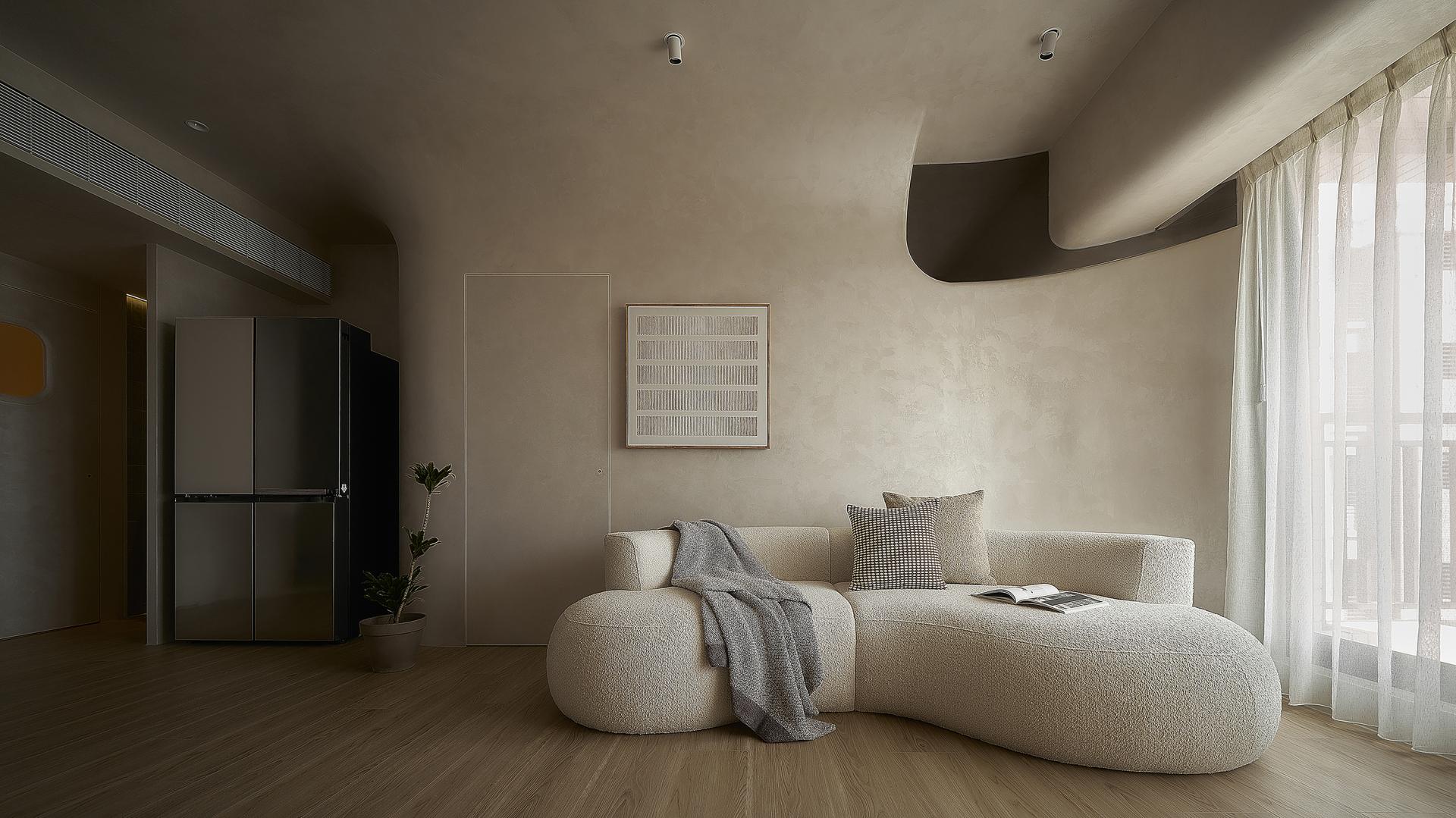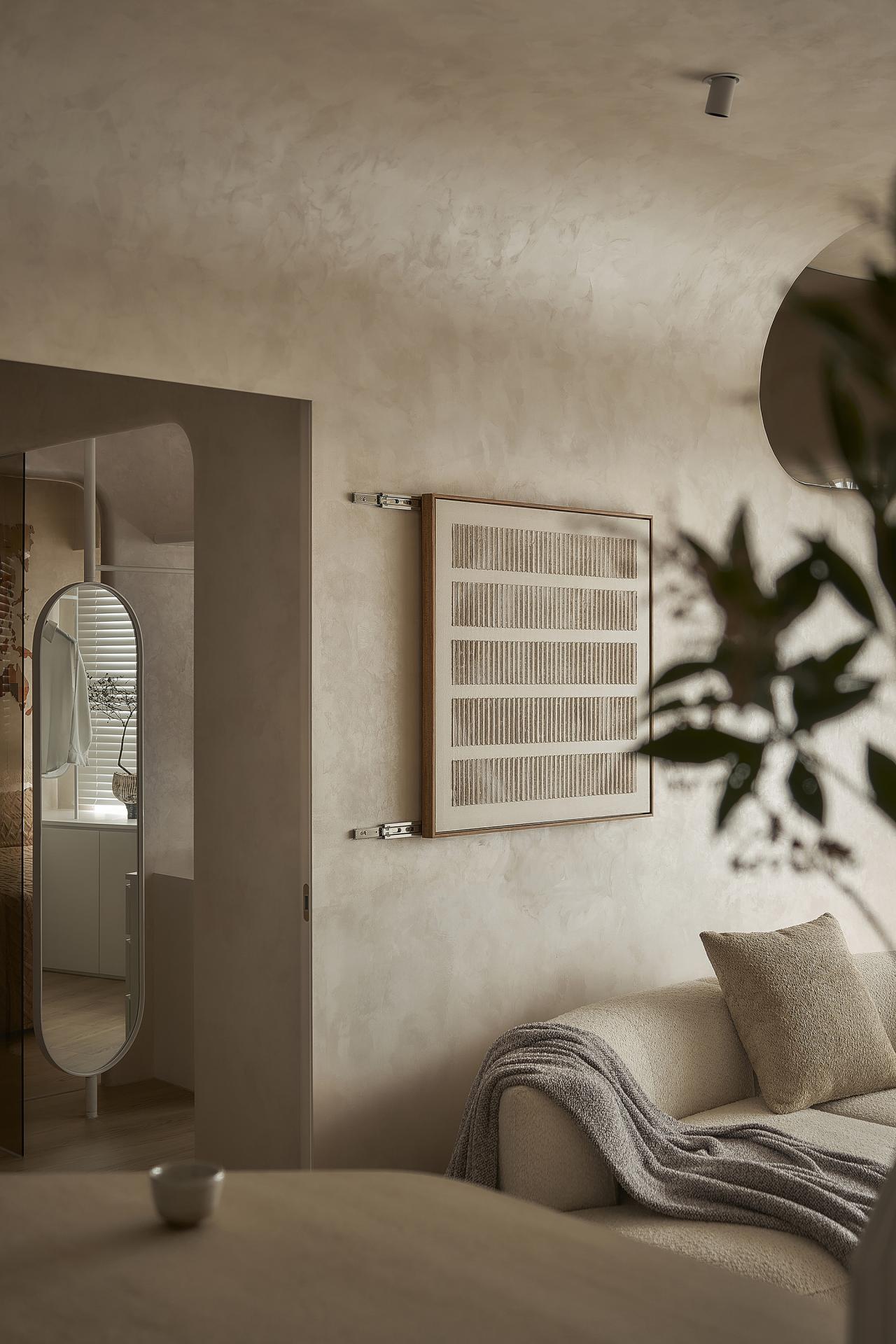 Faced with a massive structural beam spanning across the living room window, the designer chose not to conceal it with conventional methods, but to transform it into a design highlight. A graceful curve extends from the ceiling, linking to a glass opening in the side wall, creating a cocoon-like, cave-inspired sense of enclosure and a subtle sense of voyeurism. This structural beam thus becomes a clever spatial mediator, connecting the living room to the dressing area and subtly delineating zones with layered depth.