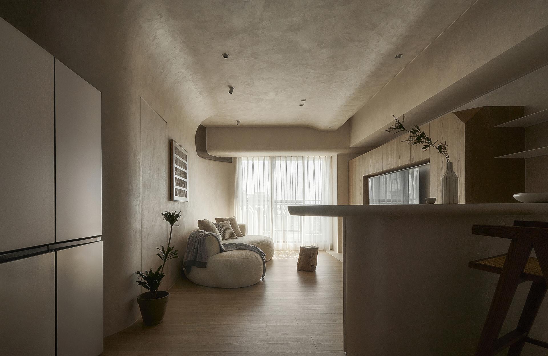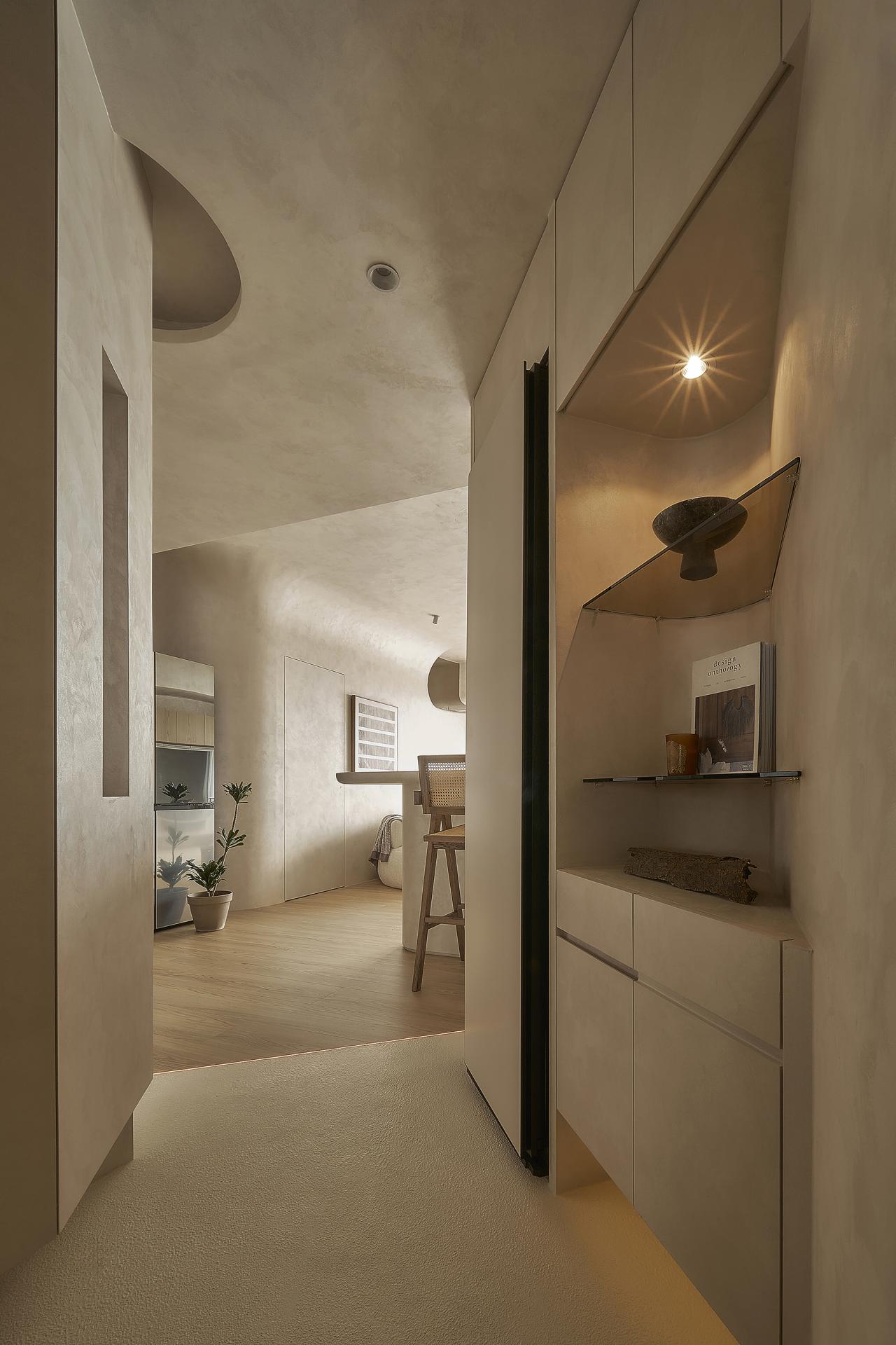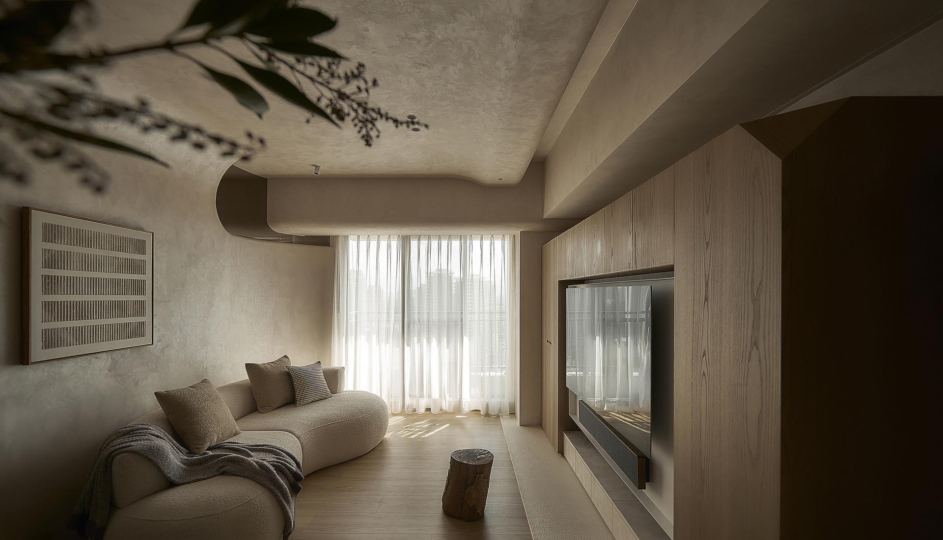Faced with a massive structural beam spanning across the living room window, the designer chose not to conceal it with conventional methods, but to transform it into a design highlight. A graceful curve extends from the ceiling, linking to a glass opening in the side wall, creating a cocoon-like, cave-inspired sense of enclosure and a subtle sense of voyeurism. This structural beam thus becomes a clever spatial mediator, connecting the living room to the dressing area and subtly delineating zones with layered depth.