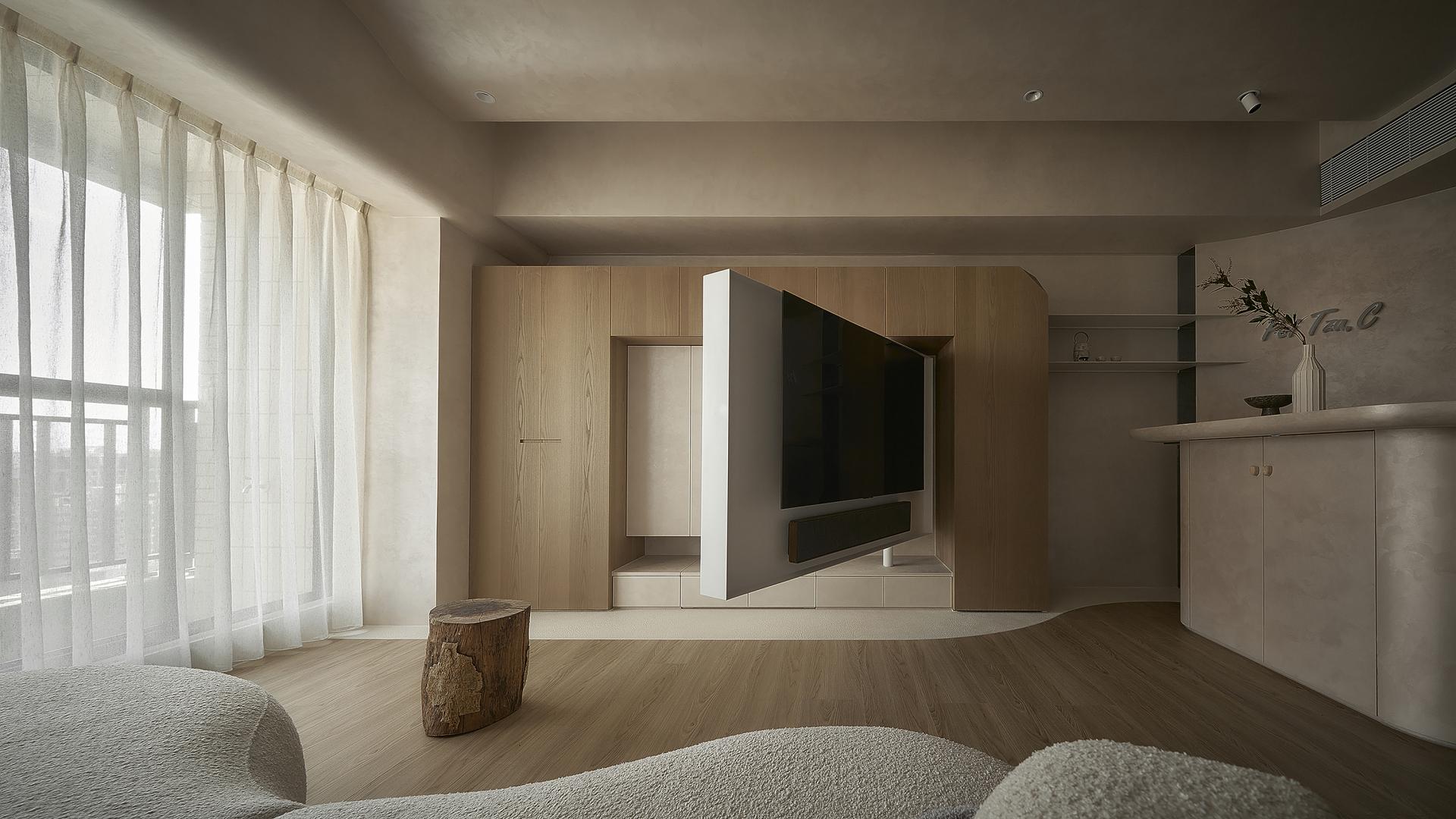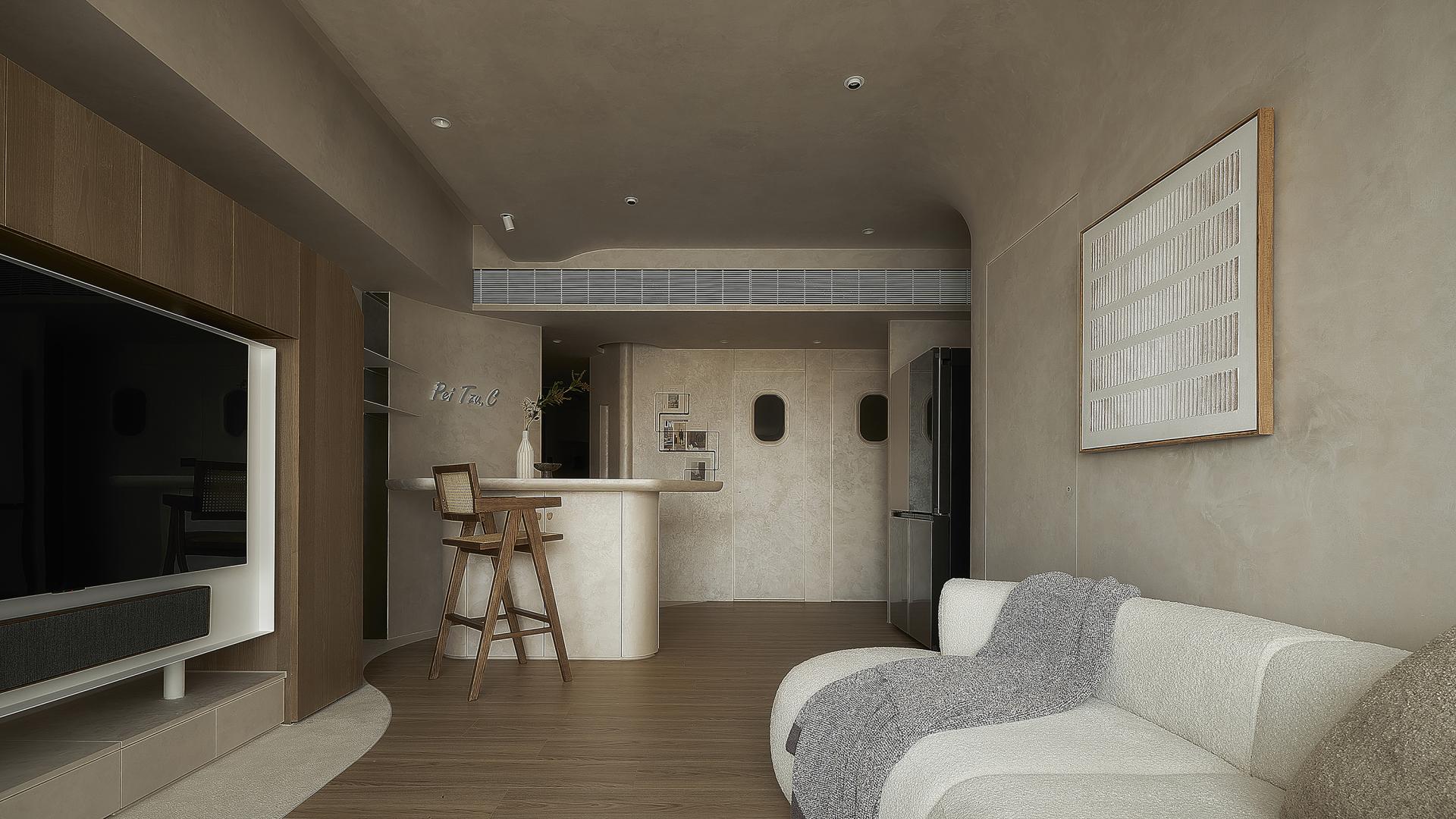 The interior layout follows a 2+1 bedroom configuration, with an expanded living area that integrates versatile storage functions. In the public space, the main TV wall features a rotating, built-in storage system that adapts to various living scenarios. Nearby, the dining area replaces the traditional table with a multifunctional island. Its stone-clad façade and segmented lines subtly evoke the image of an airplane wing, echoing both the precision of aircraft engineering and the refined aesthetic sensibility of the space.