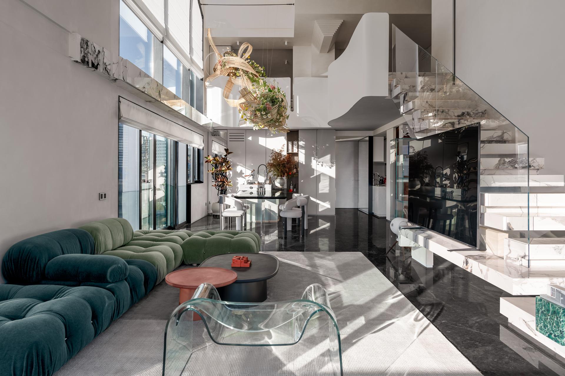 The reception area spans two levels with an open ceiling that connects the upper and lower floors, amplifying the spatial experience. At the heart of the reception area is a large floral installation, named "Growth," which symbolizes the company’s ethos of grounding itself while reaching new heights. This installation is not just a visual centerpiece but also serves as a metaphor for the company's philosophy: design that is rooted, yet full of dynamic energy.