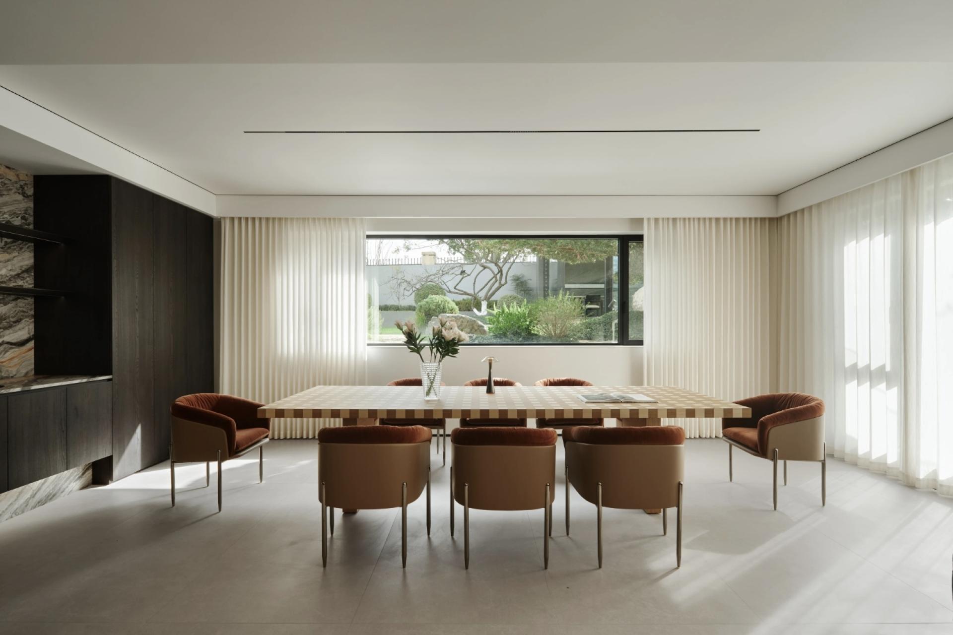 The interior space continues the minimalist tone of the building, with off-white and dark brown as the base, and builds an open and transparent sense of field through the design of no main lights, floating ceiling and natural stone. the integrated layout of open guest, dining and kitchen meets the social needs of contemporary families; The caramel modular sofa serves as the visual center, balancing the coolness of the space with the warm texture of suede. The tea room space is implanted with oriental slow life scenes with wooden Bogu frames, plain gauze curtains and framed green plants, achieving a balance between modern functions and traditional artistic conception.