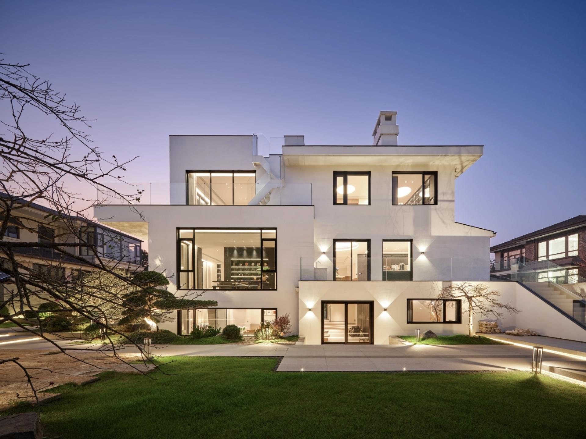 The exterior of the building is stacked in a staggered manner with pure white blocks, and the boundaries between indoors and outdoors are dissolved through a large glass curtain wall, allowing the natural light at dusk and the indoor heating lights to intertwine into a flowing canvas of light and shadow. In the courtyard, black pine, lawn and linear lighting form a simple and elegant landscape layer, creating a quiet and relaxed sense of homecoming ceremony.