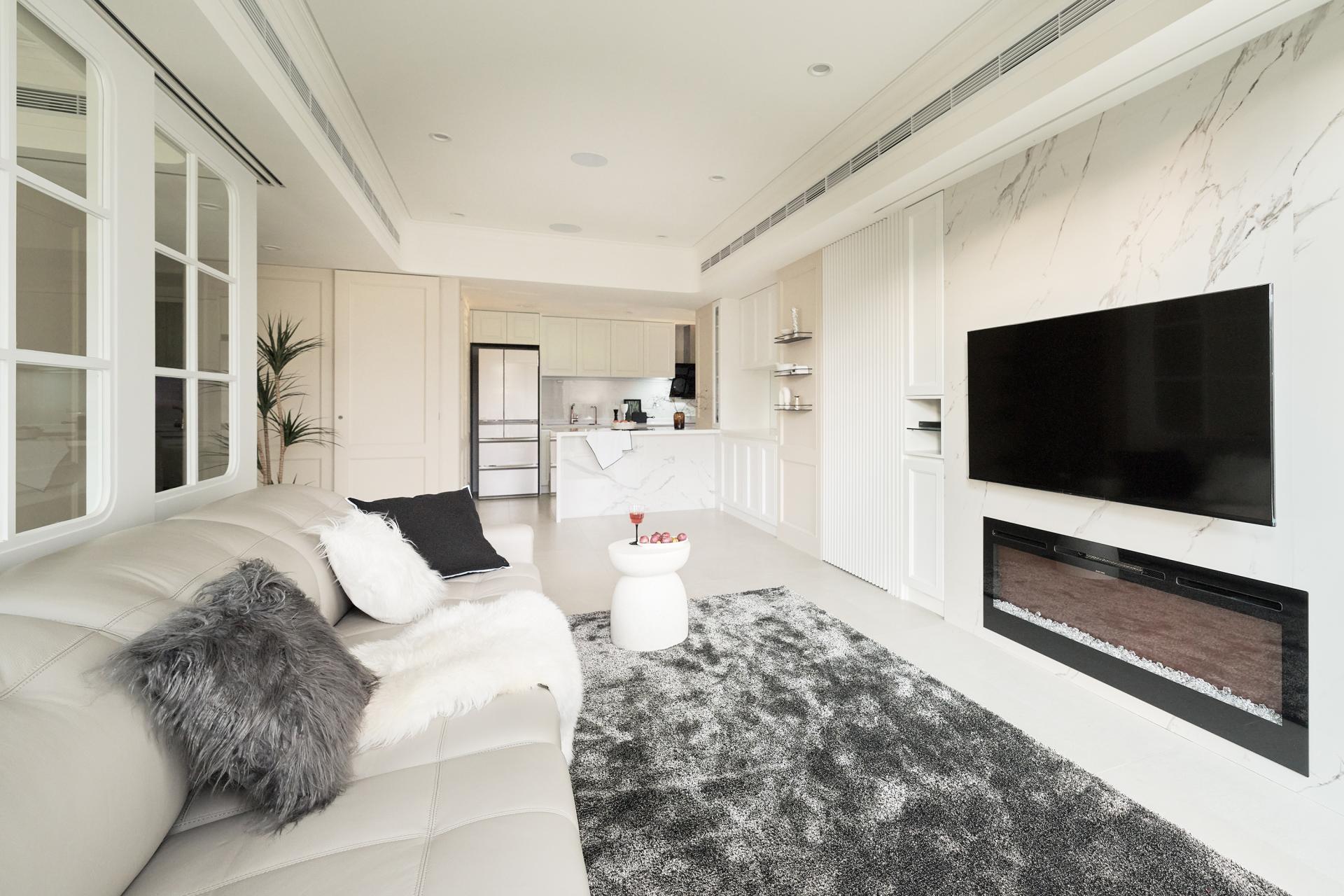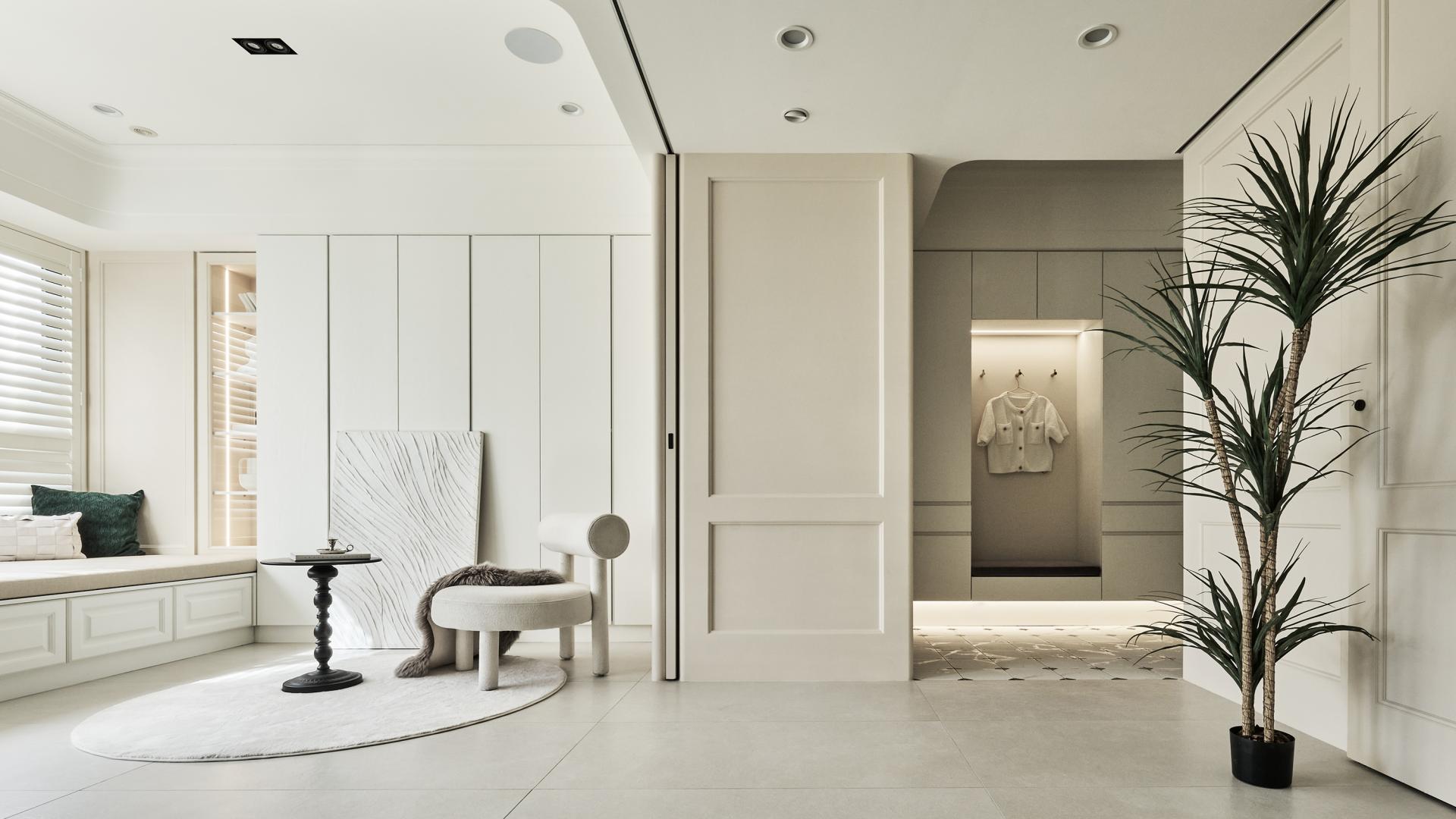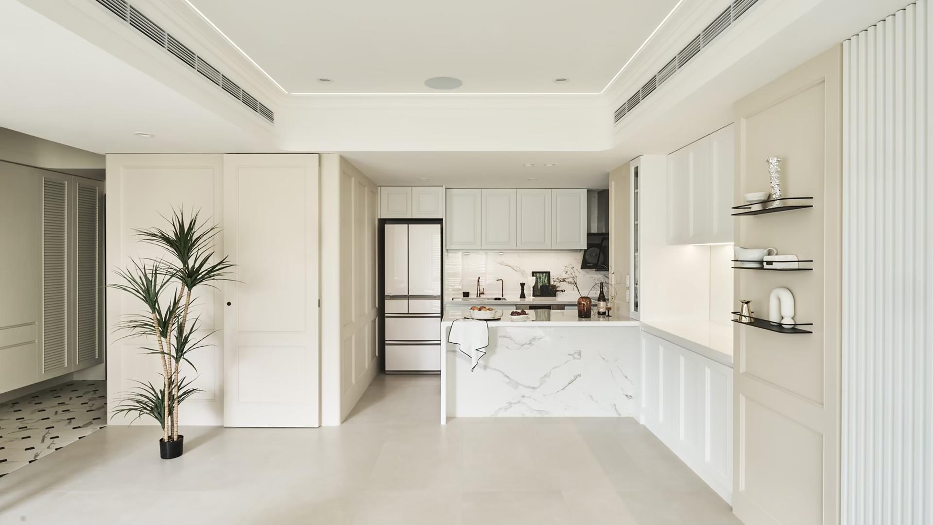 Across the public areas, the designer flanked expanses of crisp white walls and cabinetry by beige-painted moldings, carefully delineated to introduce Symmetrical but expressive contrasts. The gentle shift between white and beige defines balanced visual blocks without monotony, while the warm gray floor tiles positioned between the two hues further enrich the gradation of light tones. Within this serene backdrop, lightweight metal elements replace heavier wooden shelving, allowing the gaze to rest on the large-format tiled TV wall, whose understated elegance serves as the visual anchor of the space. Together, these choices shape a neo-classical residence that balances traditional American refinement with contemporary minimalism—restrained in expression yet rich in detail.