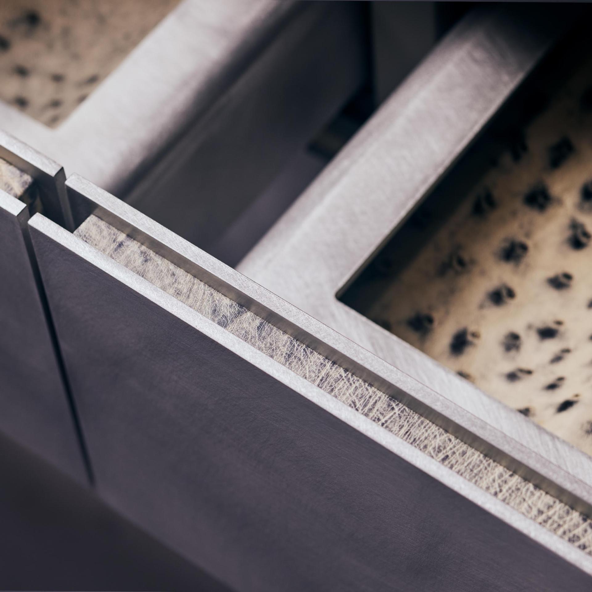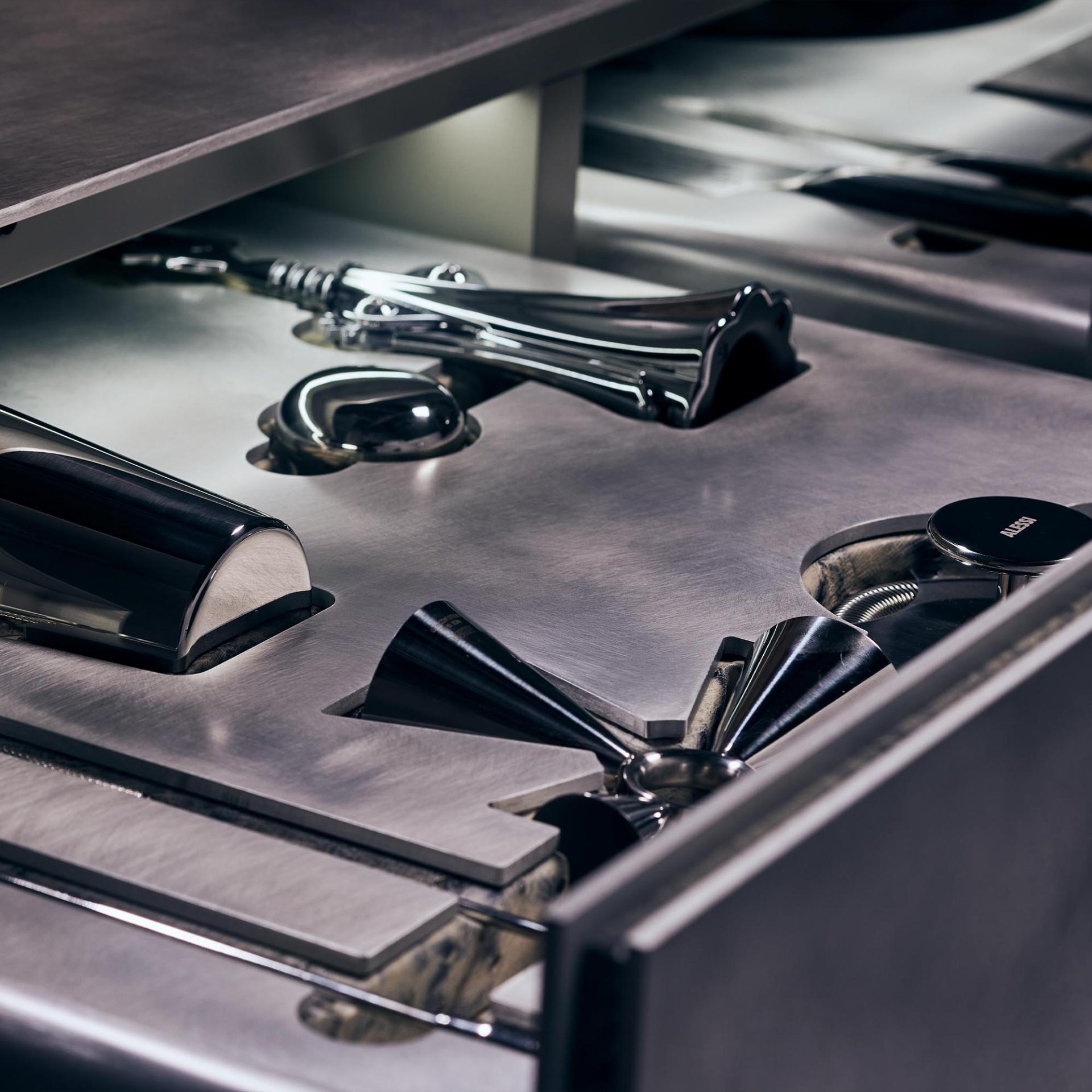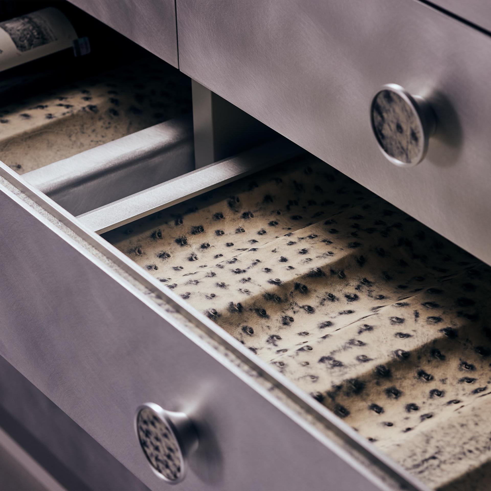 Two integrated wine cooler drawers ensure optimal storage conditions for white wine and champagne, while additional drawers offer space for bar essentials. Each drawer is meticulously lined with genuine ostrich leather, including leather-wrapped handles, adding a tactile richness and a sense of exclusivity.