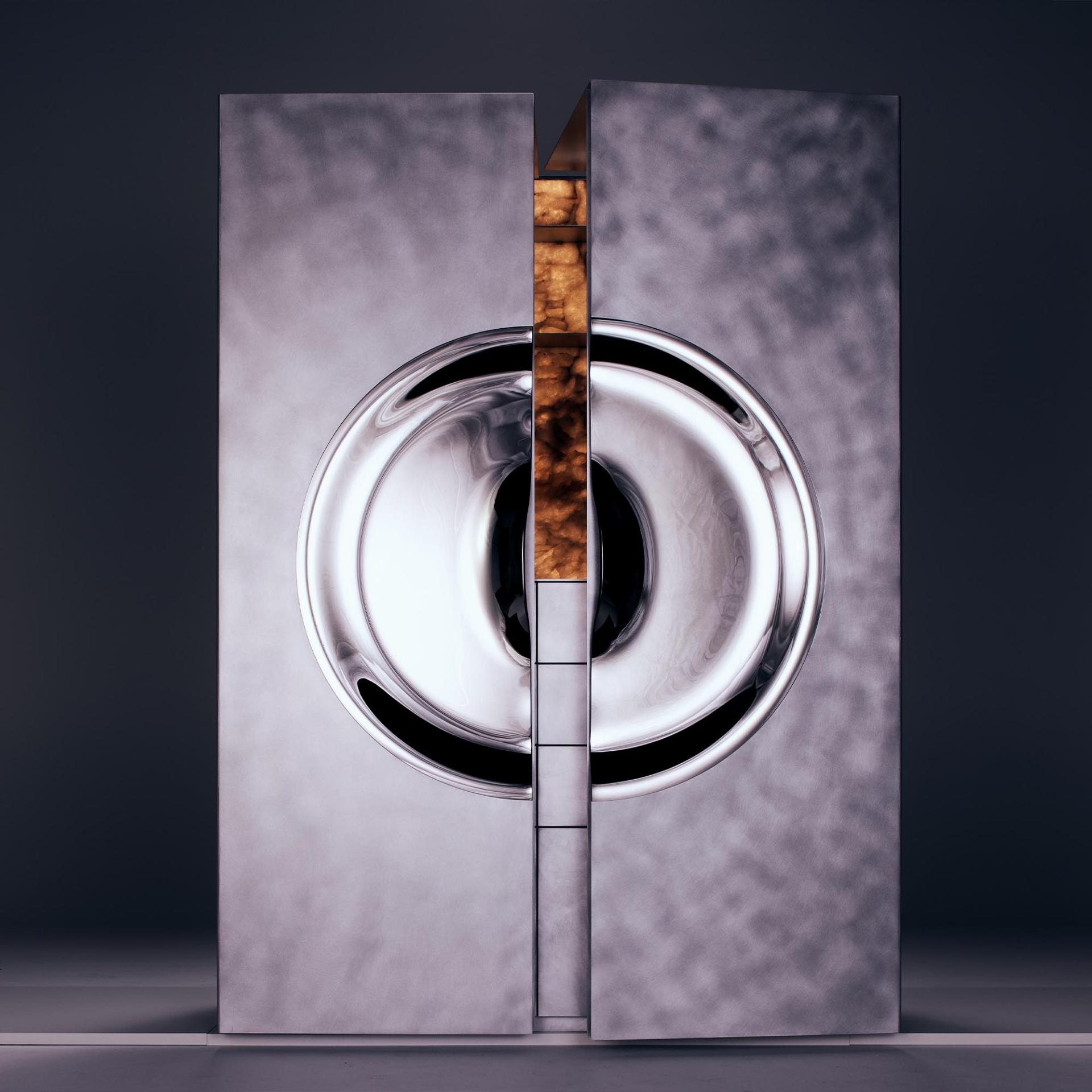 Inspired by celestial geometry and the quiet mystique of the Orion constellation, the cabinet presents a monolithic silhouette crafted from brushed aluminium in a refined silver tone. Its clean architectural planes frame a luminous circular centerpiece: a hand-formed art-glass handle, designed and created by Artis Nīmanis. The handle functions as both a practical element and a jewel-like focal point, reflecting light and adding depth to the cabinet’s sculptural façade.