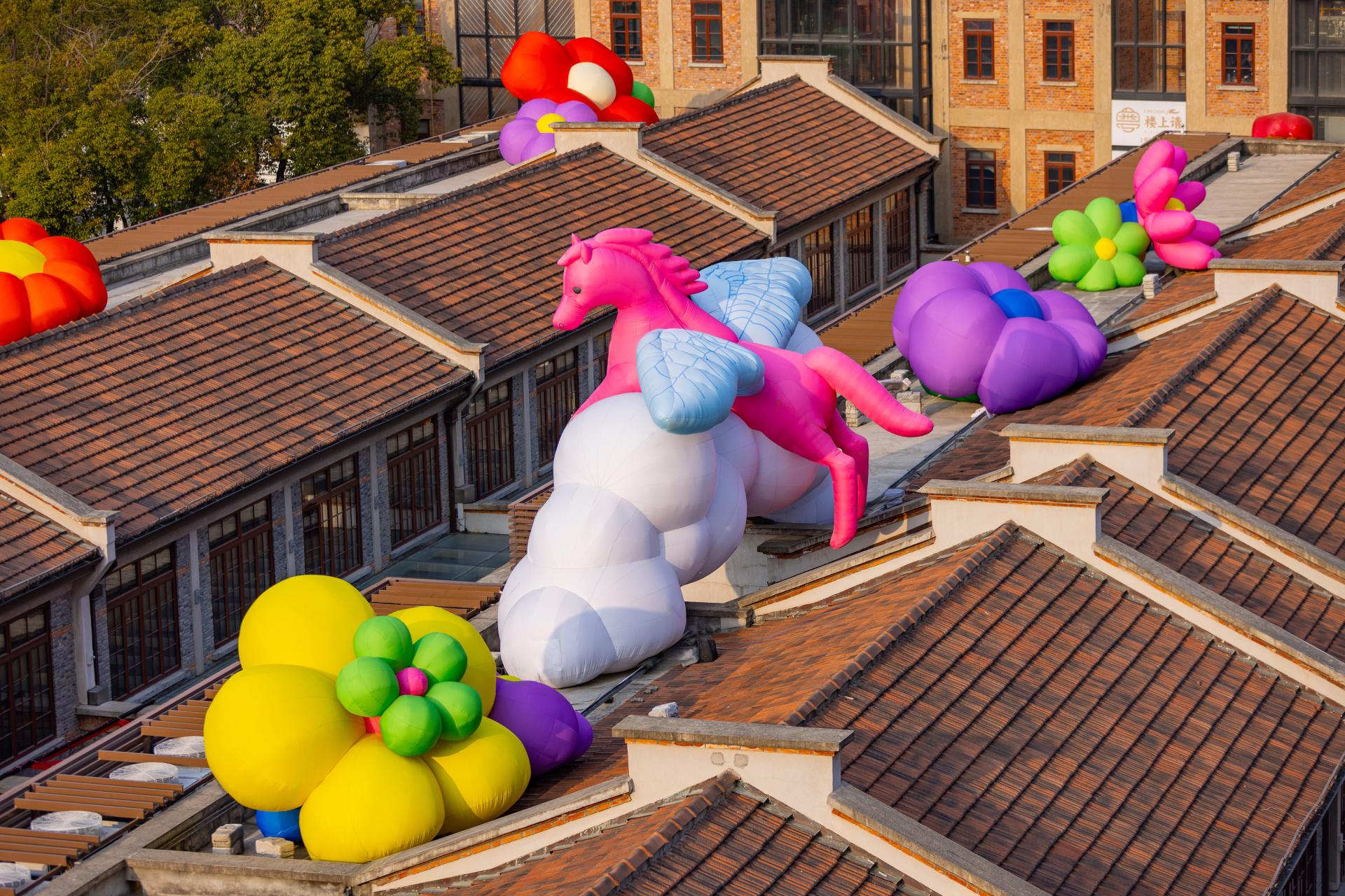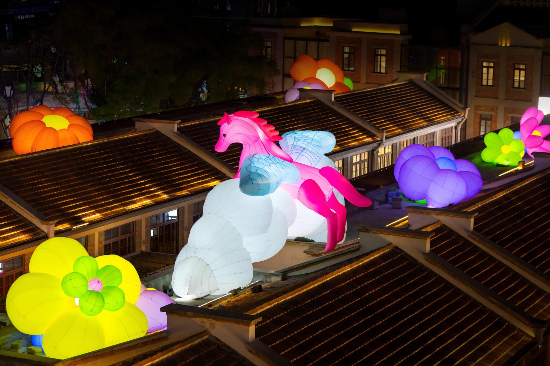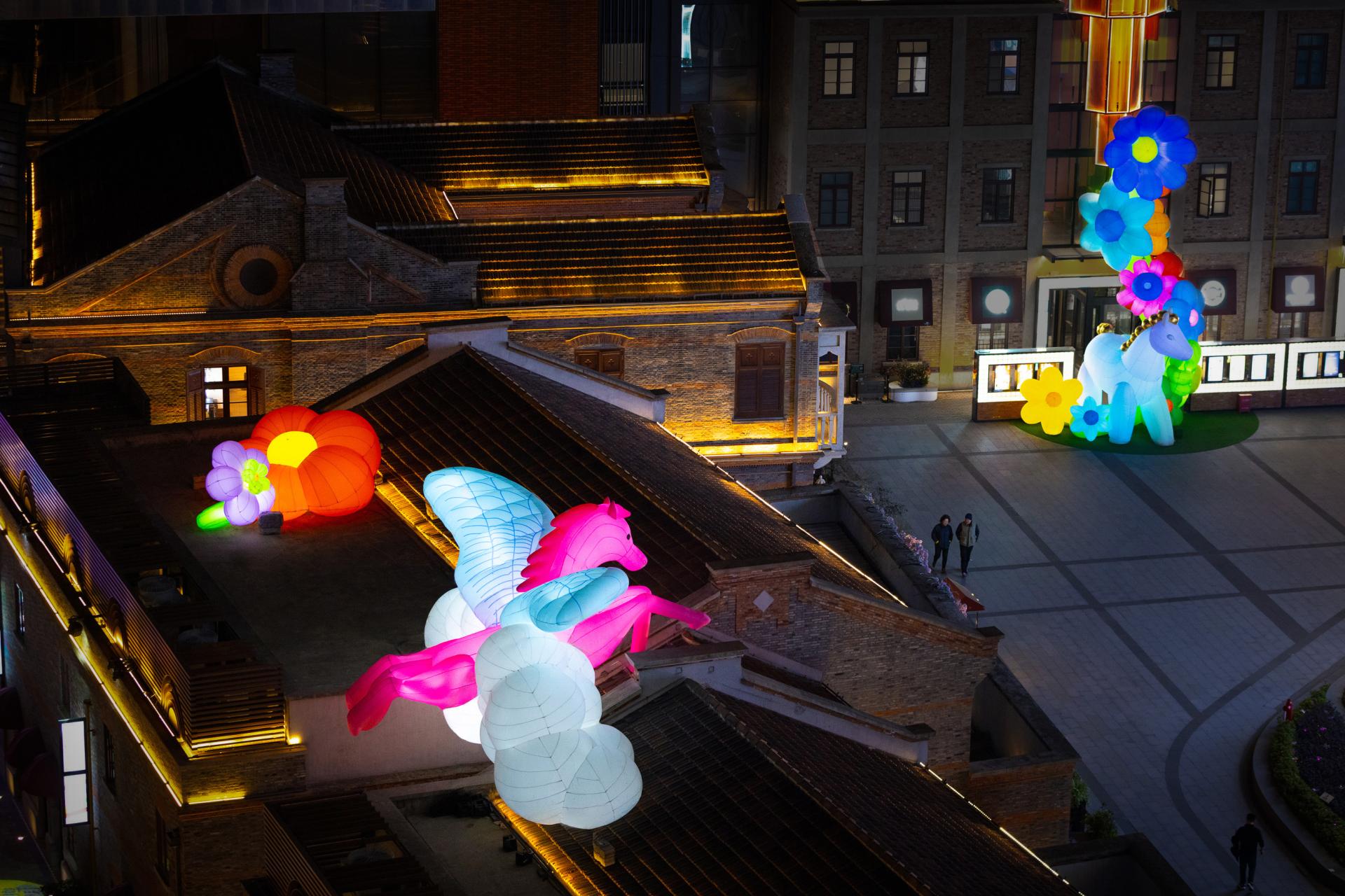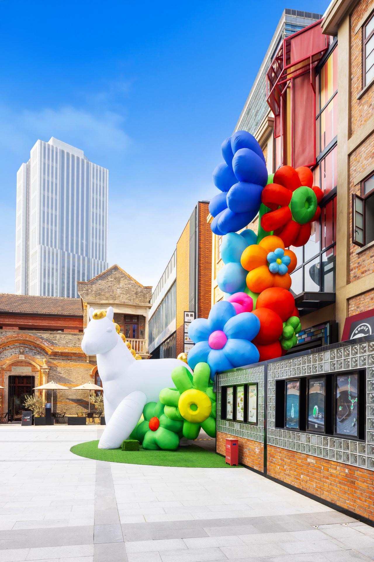 At the South Plaza of Life Hub @ Bund Central, two abstract playful white steeds, sculpted in a playful balloon‑art style, roam freely in the sea of blossoms. It is a celebration of color and a fresh, vibrant interpretation of festival spirit through contemporary aesthetics.