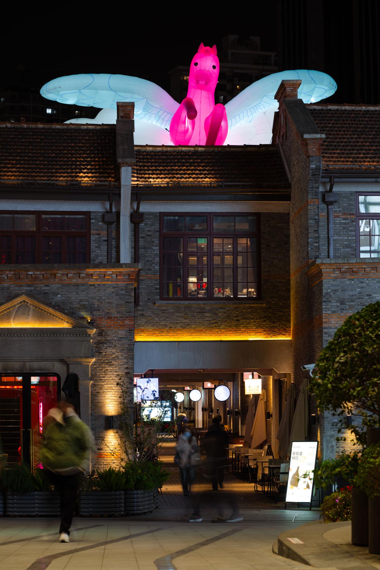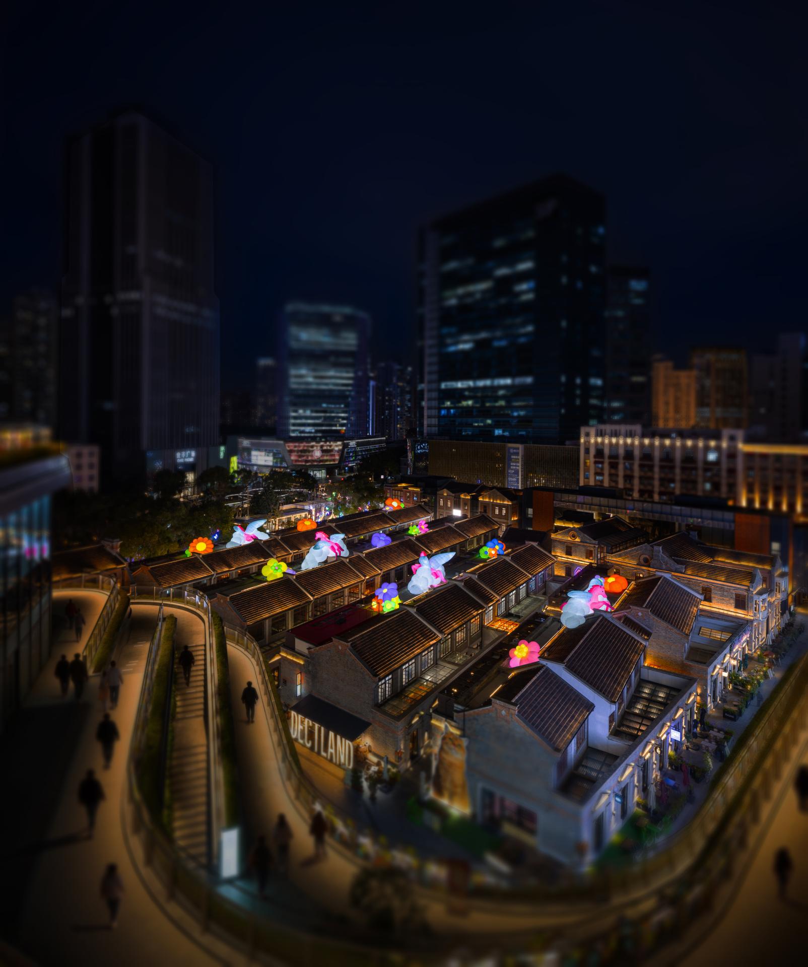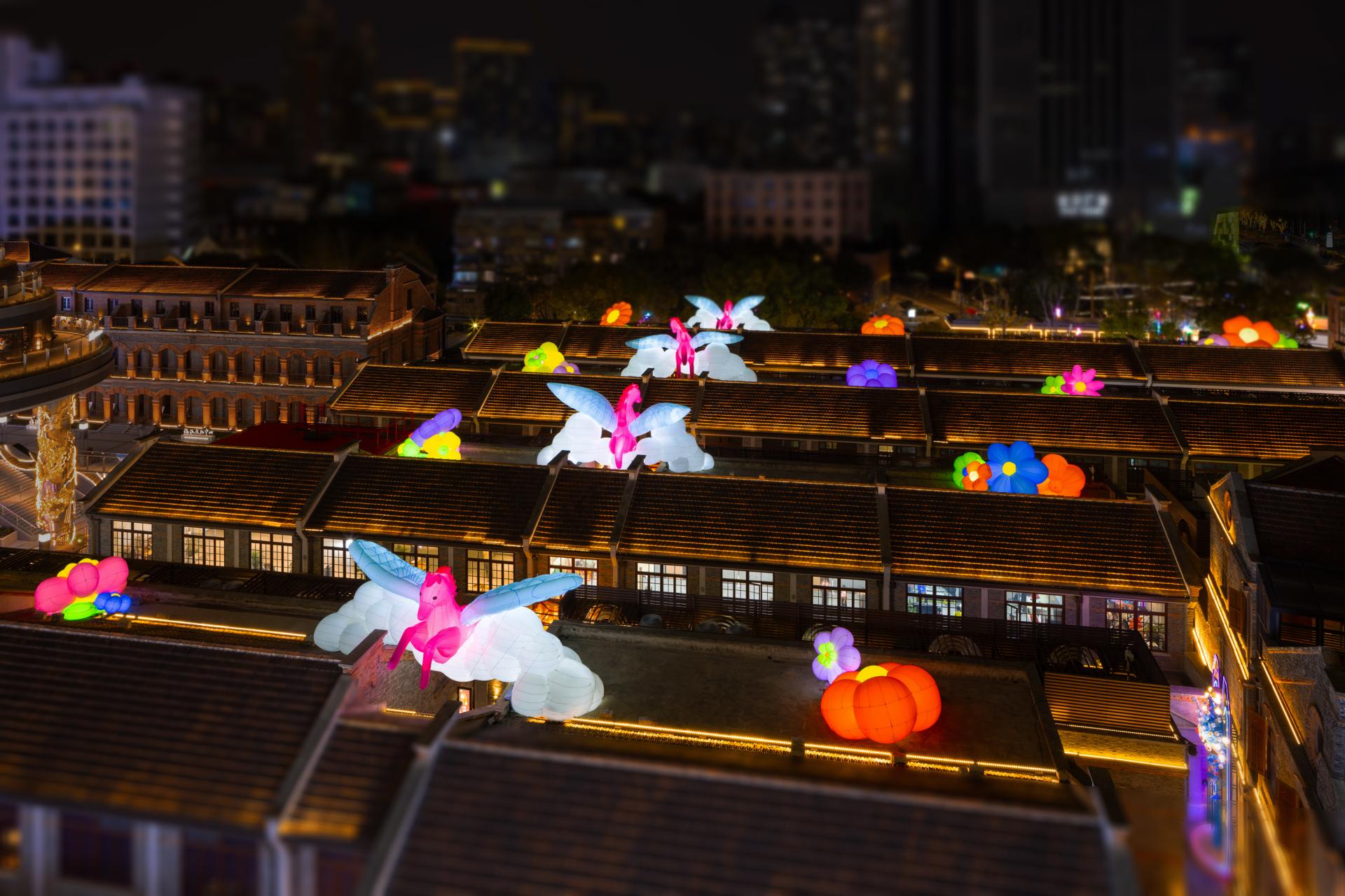 On the rooftops of The Inlet`s traditional alleyways, PHAIdesign reinterprets classic mythological imagery with four figurative Tianma (Heavenly Horse) descending from clouds, surrounded by the sea of blossoms. Its graceful form pays tribute to traditional auspicious symbolism while resonating aesthetically with the timeless charm of the historic architecture.