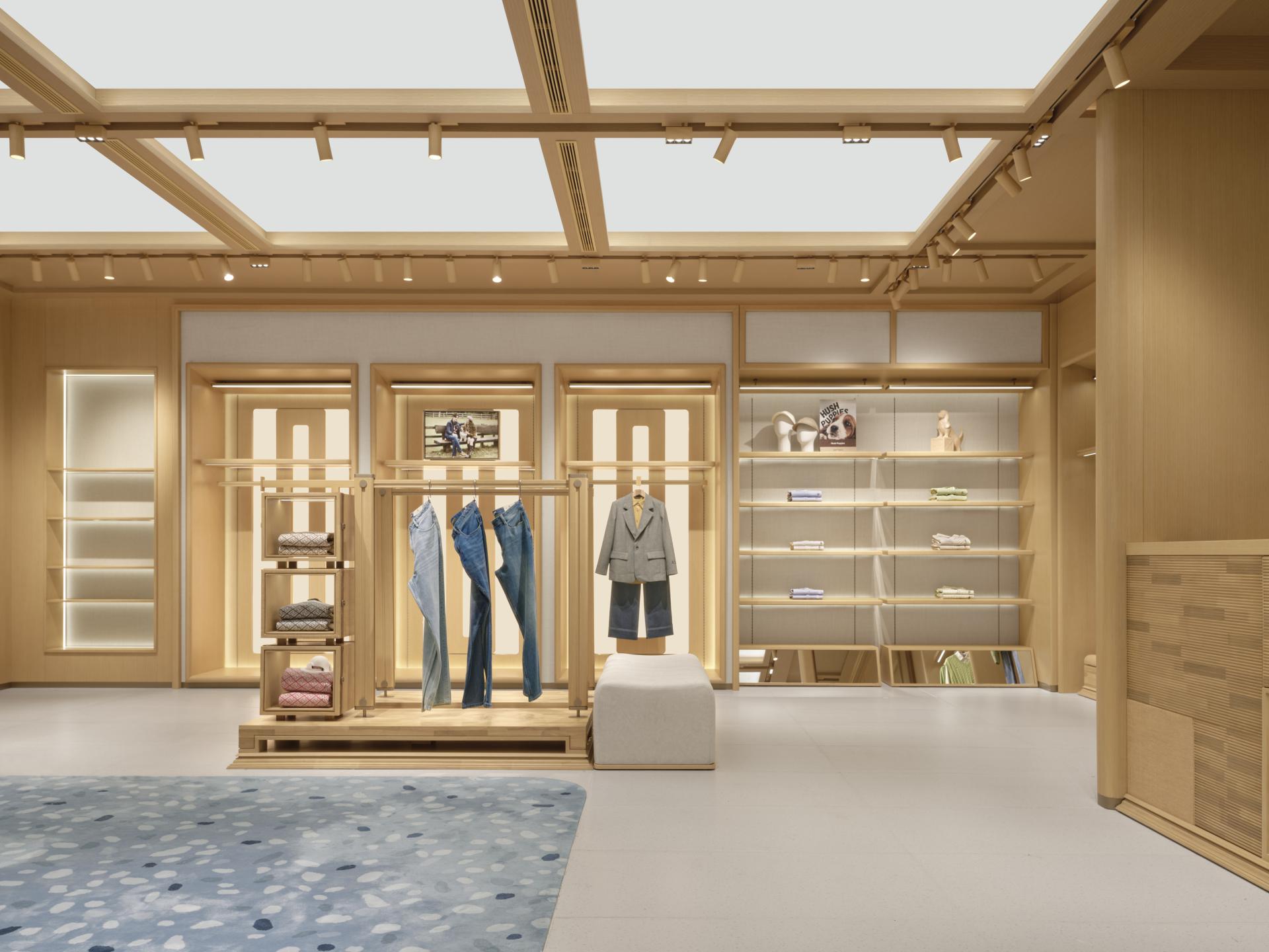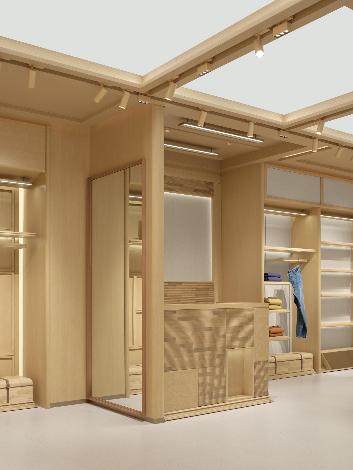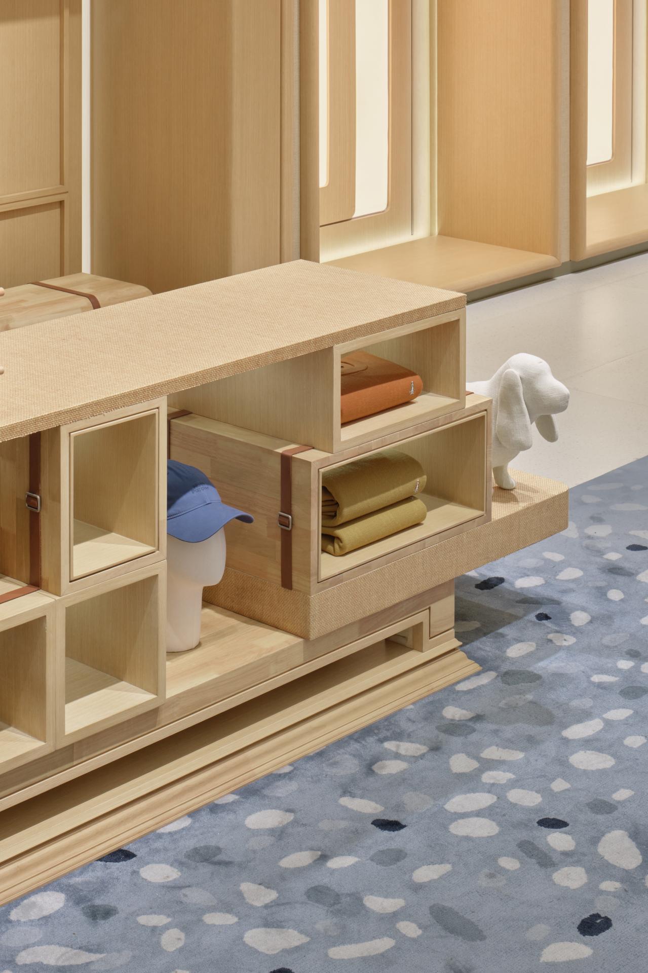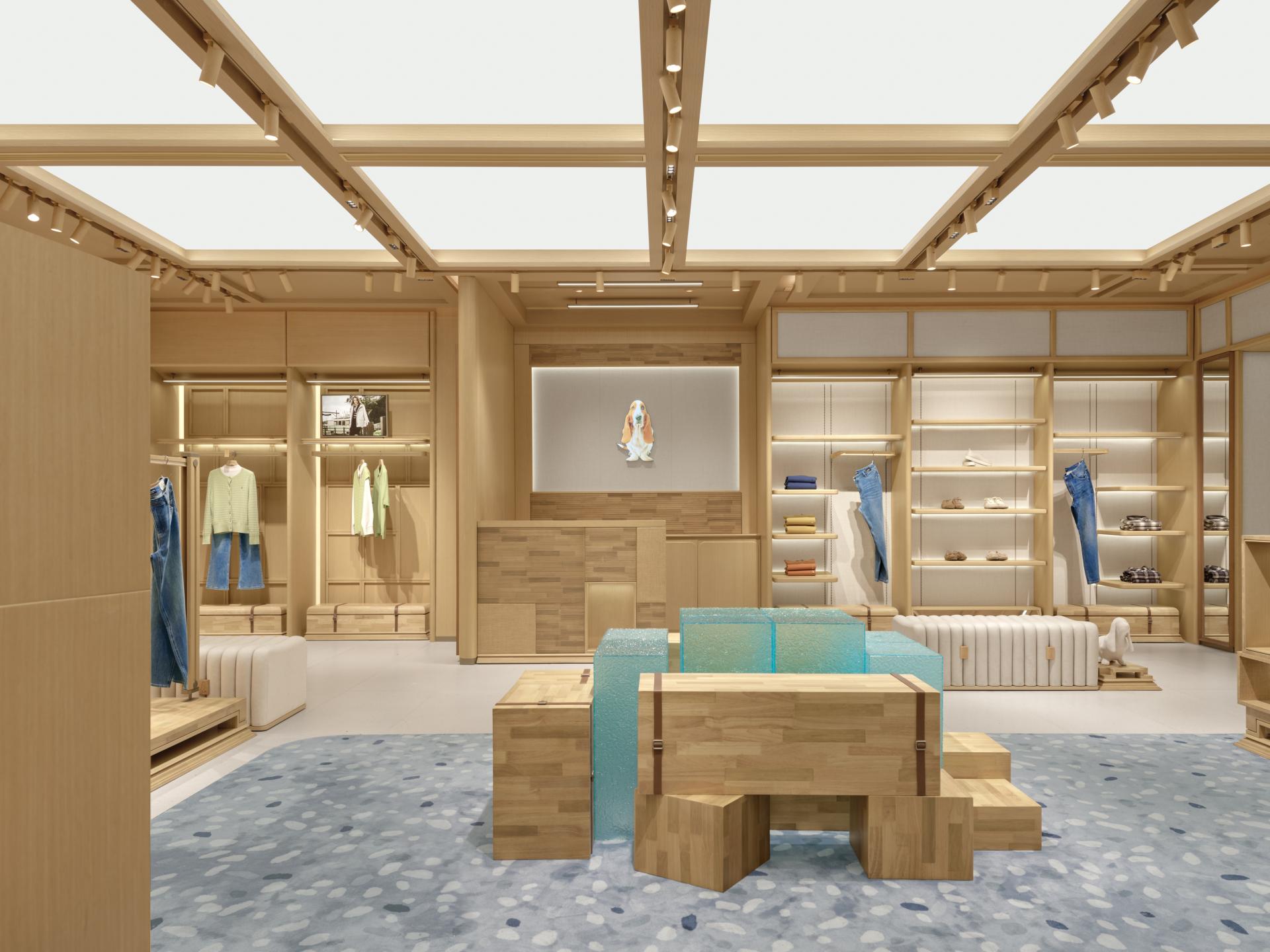 The space is grounded in warm wood tones, with clean lines defining a clear sense of order. A daylight-simulating lighting system softens boundaries, evoking the relaxed comfort of home and the unhurried ease of a vacation. The motif of “suitcase” becomes a narrative cue, integrated into window displays and the central island in stacked compositions that recall travel memories. At the entrance, a carpeted zone symbolizes a “courtyard,” topped with a translucent blue acrylic installation that symbolizes a tranquil resort pool—a poetic visual anchor that deepens visitors’ emotional connection with the brand.