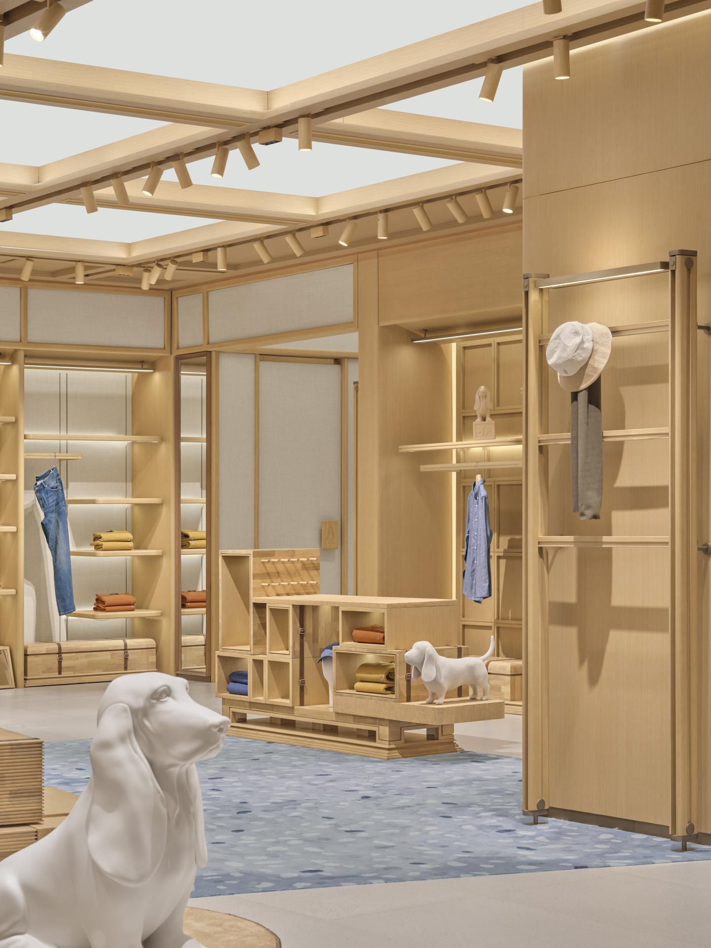 Modular square volumes establish the spatial framework and visual rhythm, transforming product displays into poetic reflections of everyday life. Their modularity allows the retail environment to evolve and refresh over time. The iconic Basset Hound—Hush Puppies’ beloved symbol—appears throughout the space as a gentle emotional anchor, conveying trust, warmth, and a sense of home. Horizontal woven textures and warm wood grains across the walls invite tactile engagement, expressing a lifestyle rooted in natural comfort and human warmth.