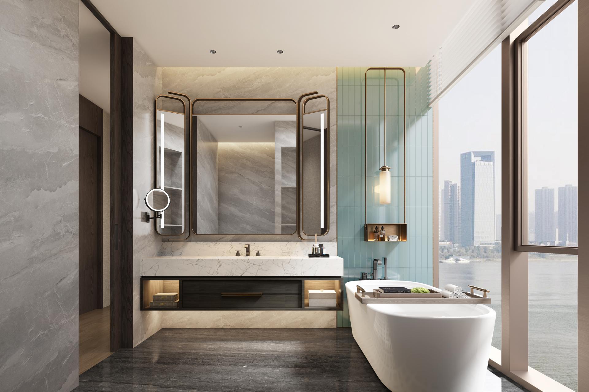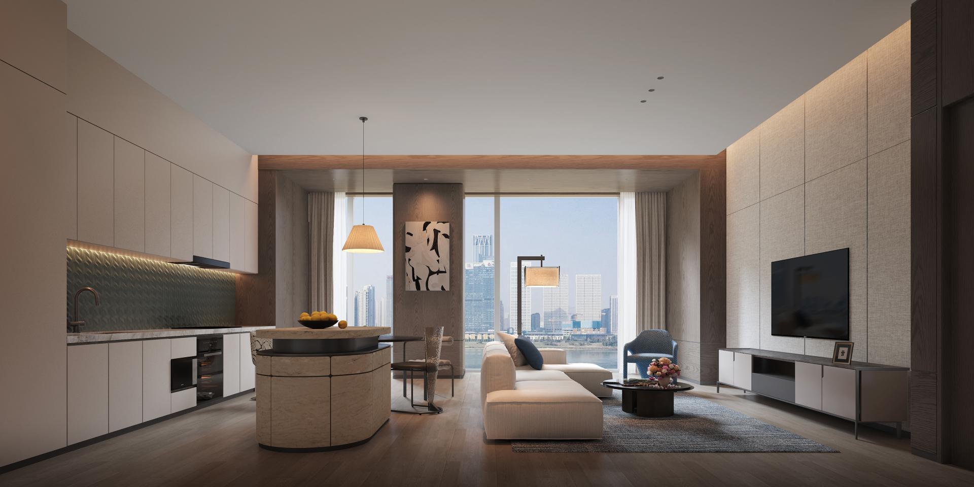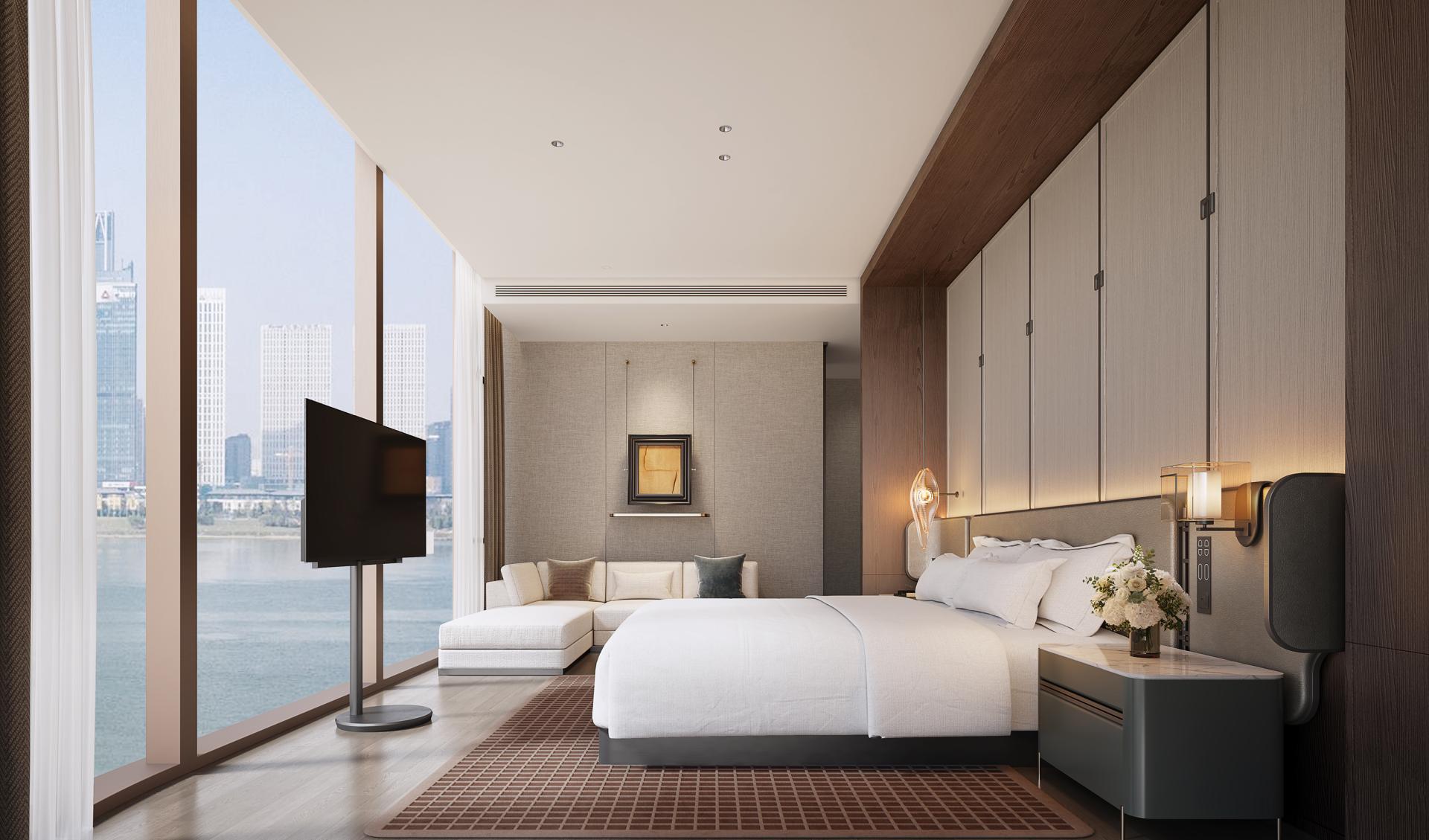 Local cultural elements from Changsha City are artfully woven into the hotel. An art glass screen resonates with the restaurant's wall of vintage photographs, delicate rattan partitions, and classic patterned tiles, enhancing both brand recognition and thematic continuity. Private dining rooms feature expansive abstract paintings that introduce compelling visual contrast, fostering a subtle yet powerful dialogue between tradition and contemporary expression. Guest rooms are grounded in a neutral color scheme and organic materials. Floor-to-ceiling windows draw in the scenery of the Xiangjiang River and abundant natural light, while artificial lighting at night complements the daylight, cultivating an airy and warmly inviting ambiance.