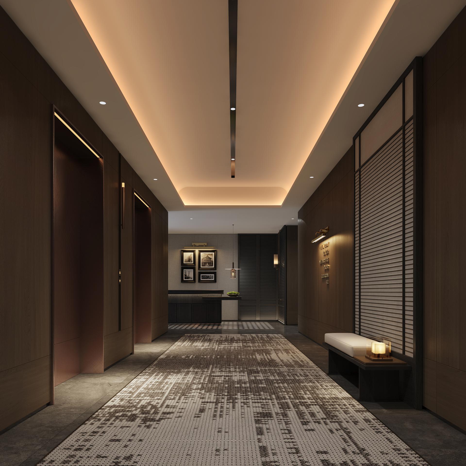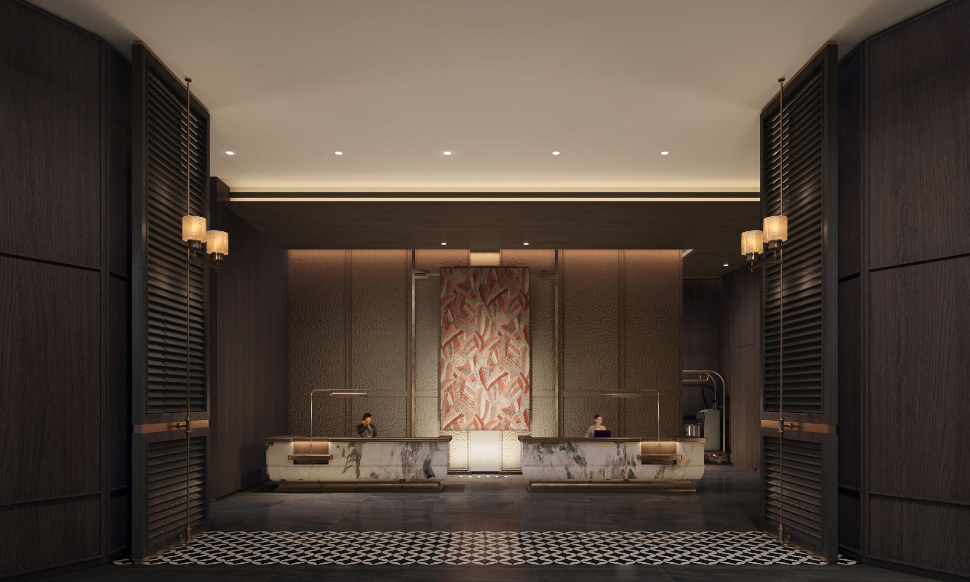 In the lobby, dark woods, matte stone, and hand-forged antique copper are boldly juxtaposed to create a rich textural contrast and an atmosphere of solemnity & elegance. The space achieves a careful balance of warm and cool tones, while a central floral arrangement and curated wall art soften its commercial feel, thus enhancing emotional connection.