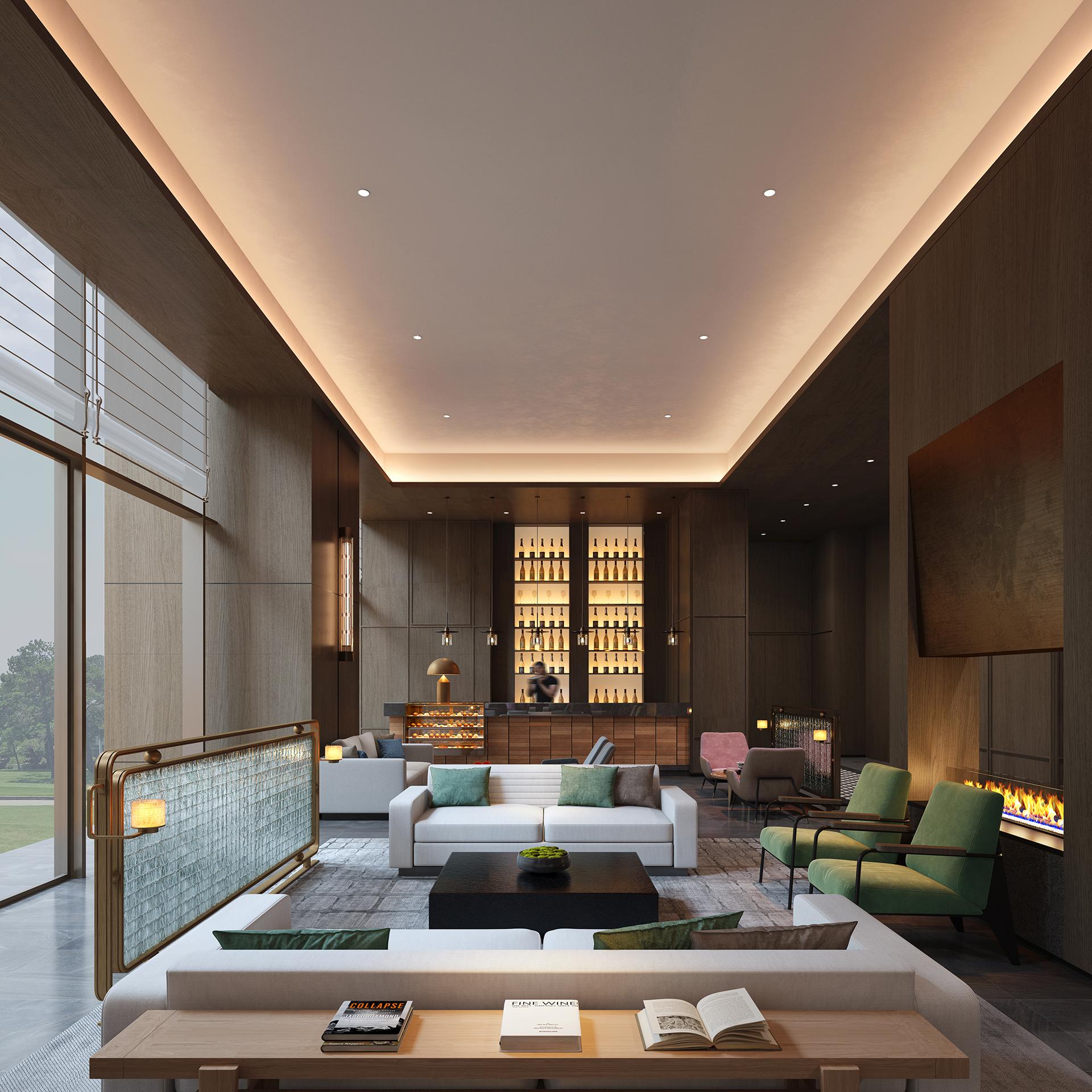 The lobby lounge reinterprets the essence of tea culture through a contemporary lens. Inspired by the traditional tea house, it merges vintage furnishings with modern art pieces. Mint-green armchairs paired with light-gray sofas introduce a fresh, layered aesthetic. The warm flicker of a fireplace and the ambient glow from the wine cabinet together compose a retro yet refined space for tea appreciation.