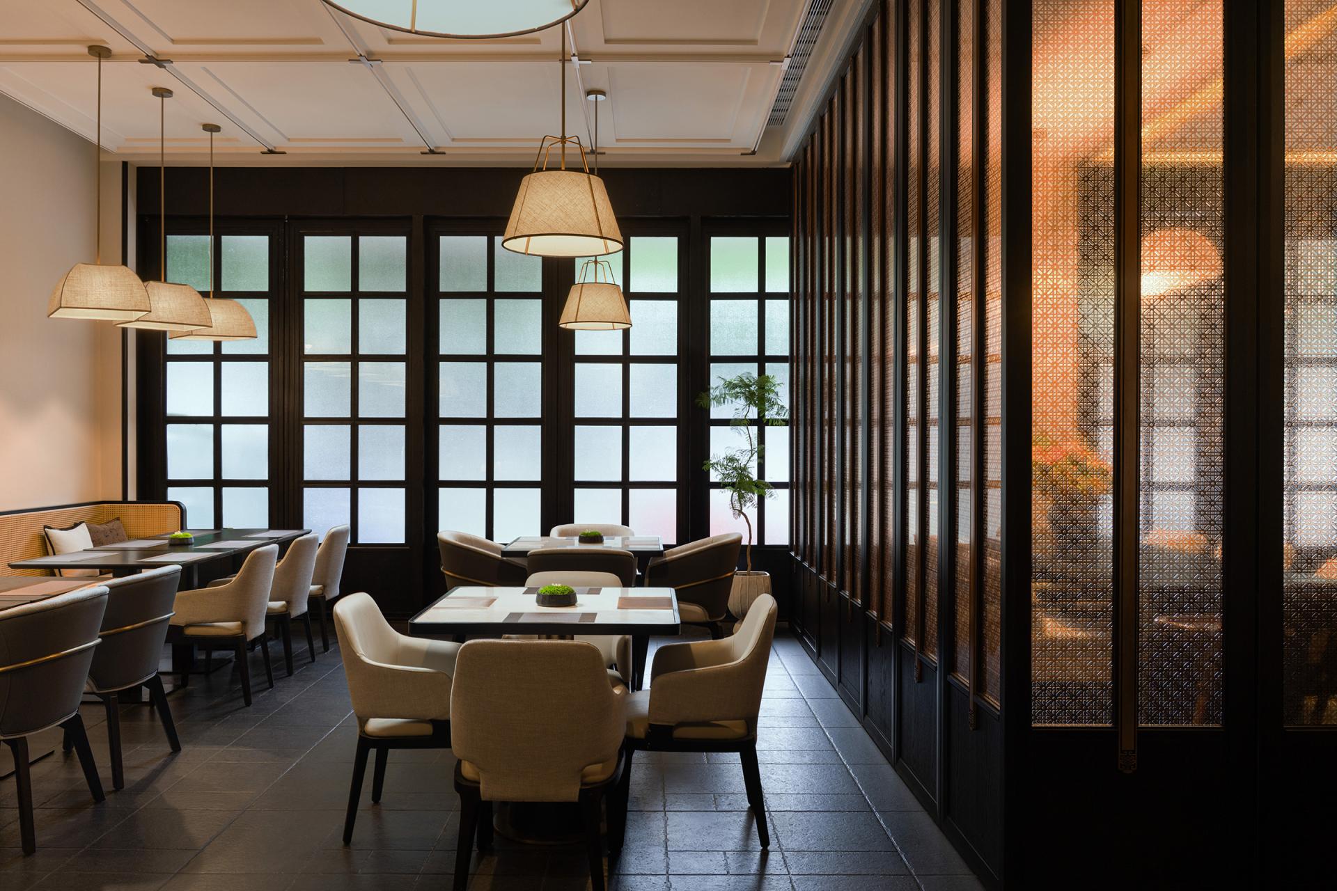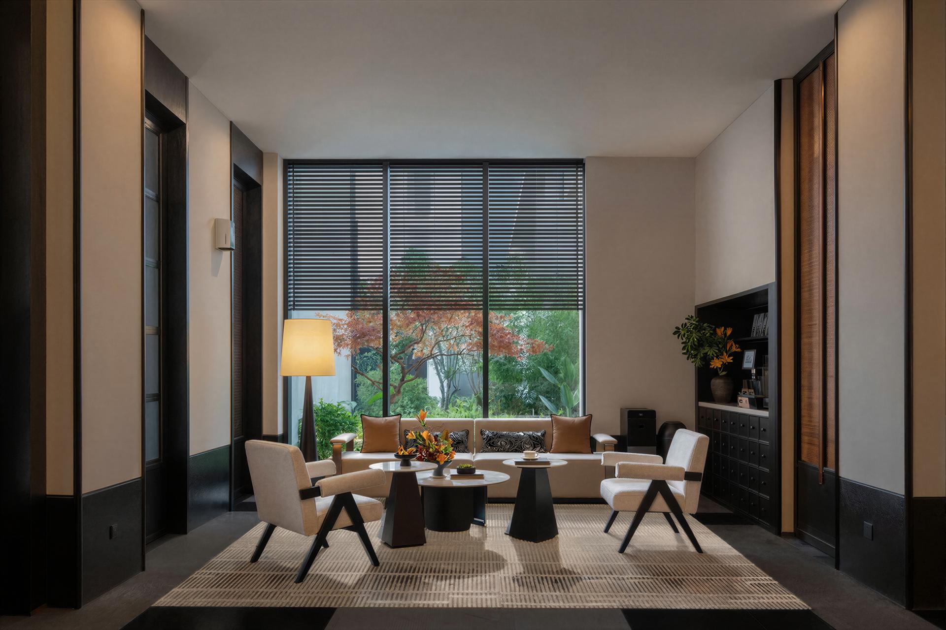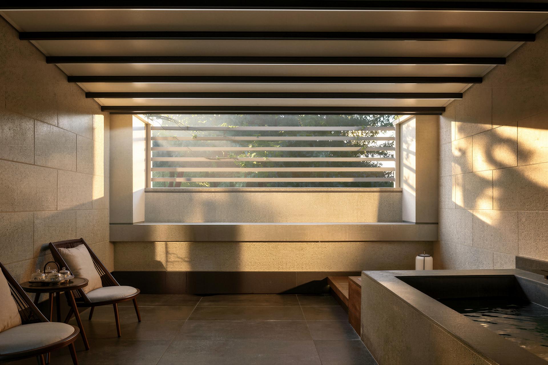 Spatially, the experience unfolds in sequence. The entrance uses water features and greenery as a buffer from the city. The lobby, defined by ink black and beige tones, carved window lattices, and lantern-like lighting, establishes a calm reception environment. The restaurant merges refined metal lines with bamboo textures and solid wood furniture, balancing Oriental character with modern comfort. Guest rooms are restructured to mitigate the oppressive effect of low beams and include private open-air hot spring courtyards, where bluestone pools and bamboo shadows foster retreat and seclusion.