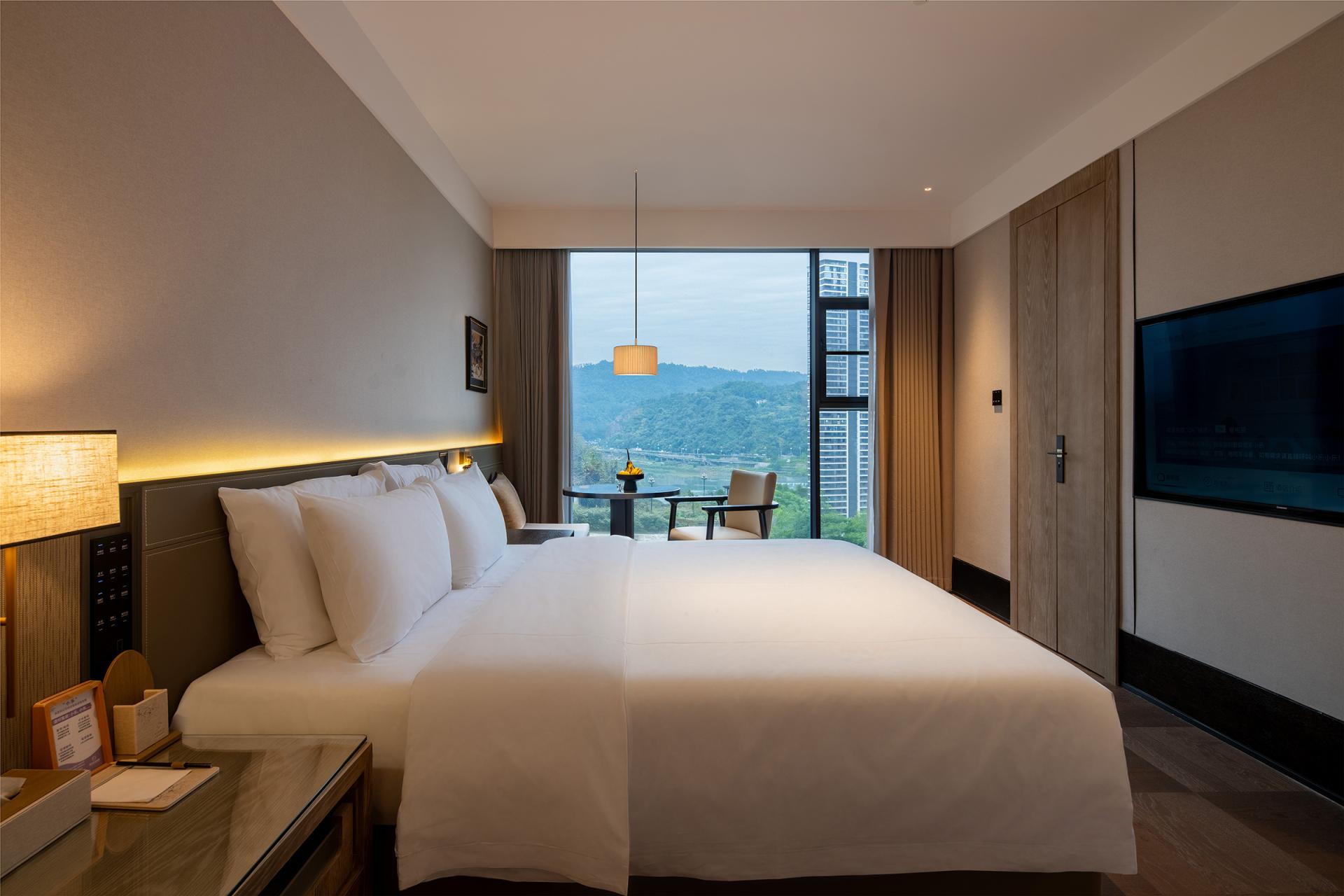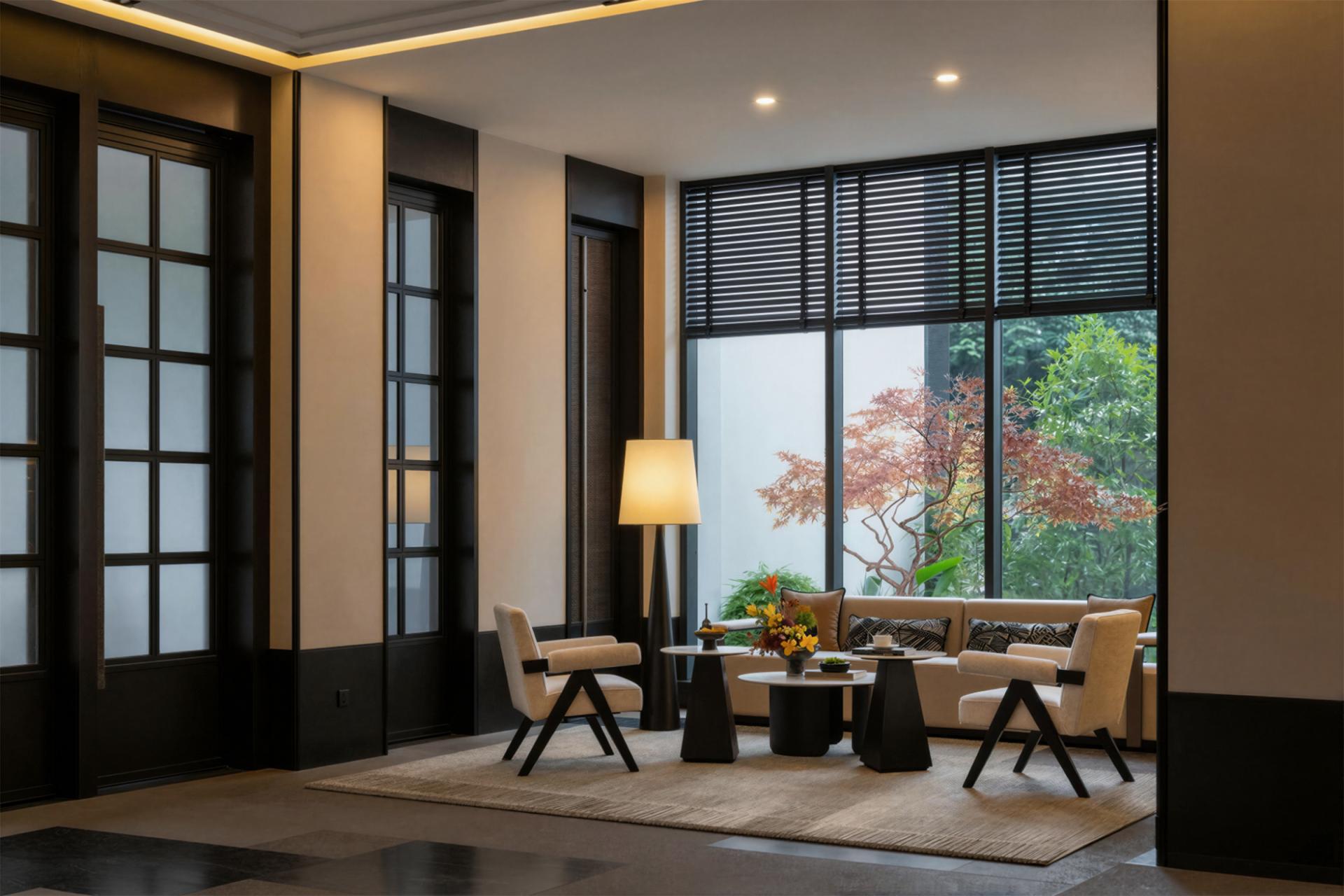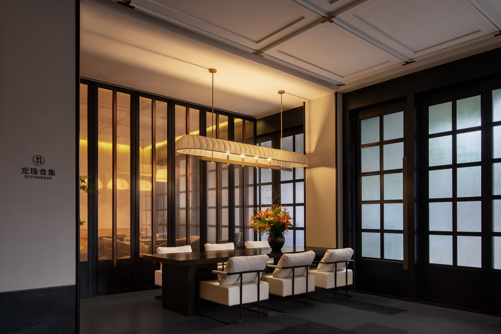 Spatially, the experience unfolds in sequence. The entrance uses water features and greenery as a buffer from the city. The lobby, defined by ink black and beige tones, carved window lattices, and lantern-like lighting, establishes a calm reception environment. The restaurant merges refined metal lines with bamboo textures and solid wood furniture, balancing Oriental character with modern comfort. Guest rooms are restructured to mitigate the oppressive effect of low beams and include private open-air hot spring courtyards, where bluestone pools and bamboo shadows foster retreat and seclusion.