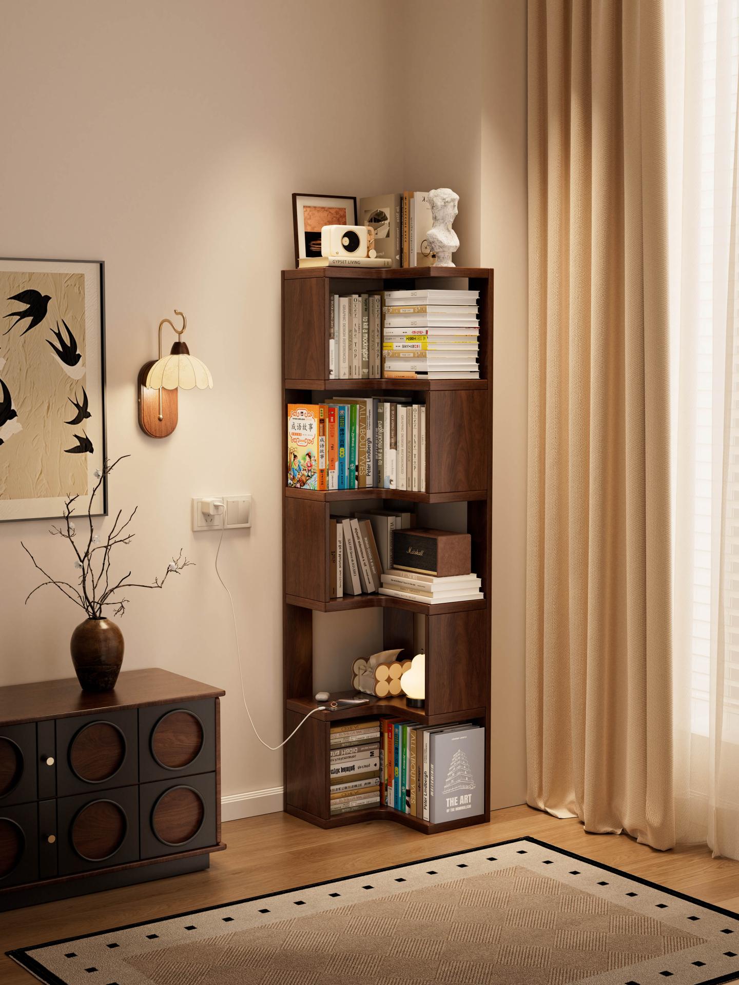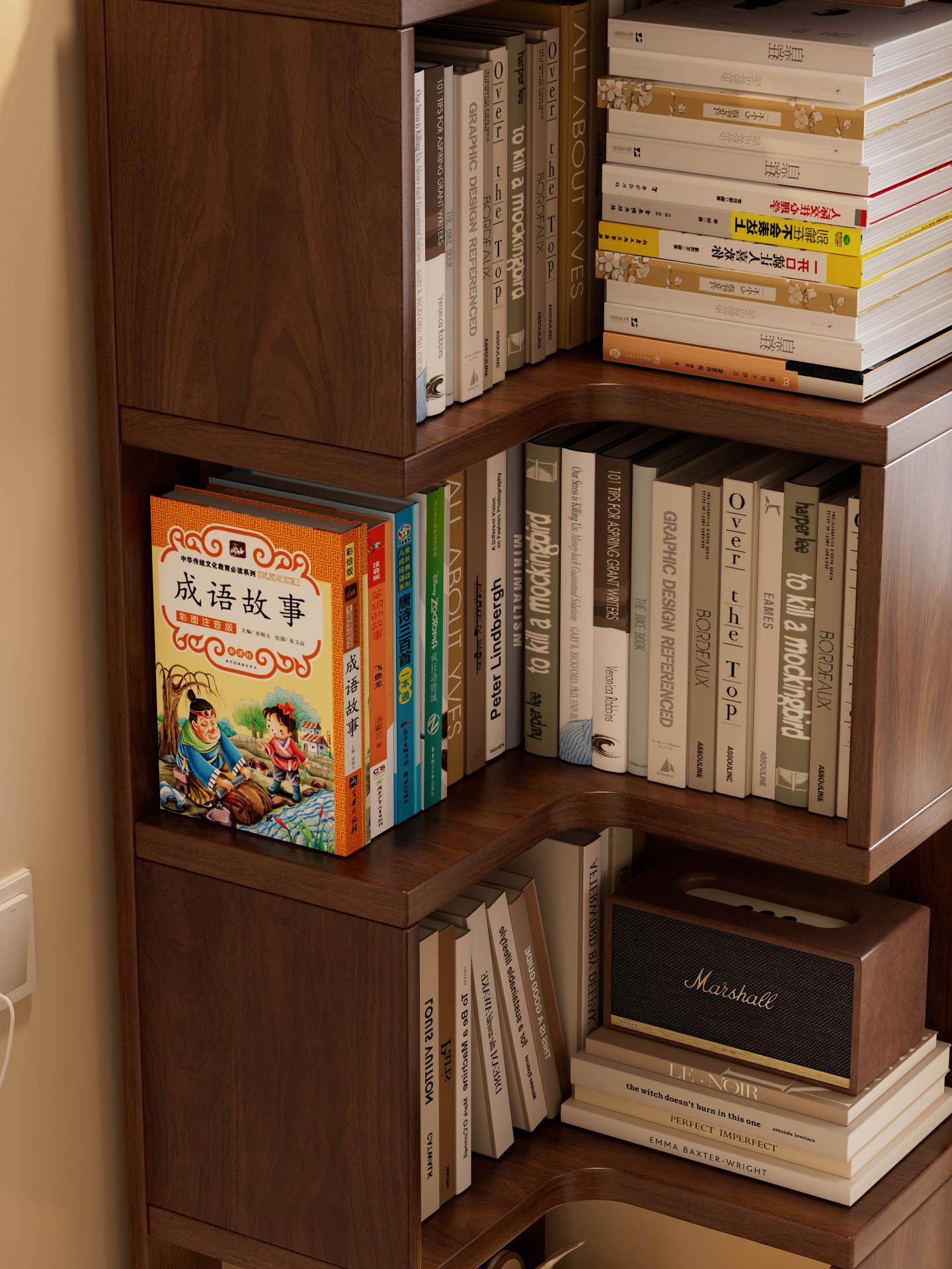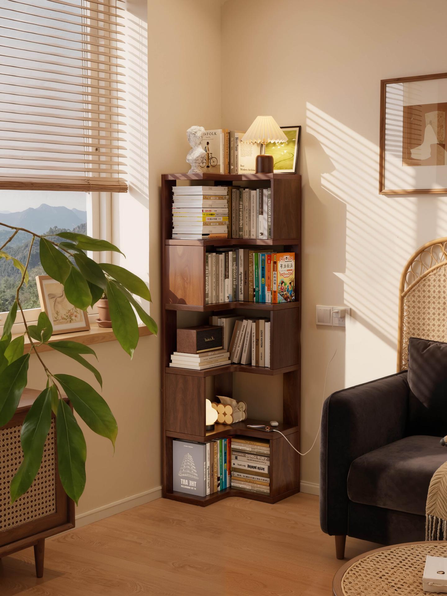 Visually, the bookshelf follows a design philosophy that blends natural aesthetics with practical functionality. The walnut-toned finish, a classic neutral color, highlights the natural grain and warm texture of solid wood while offering excellent stain resistance and versatility. It blends seamlessly with a variety of interior styles—including modern minimalist, Scandinavian, and Japanese styles. The well-proportioned L-shaped form harmonizes with surrounding walls and furniture, allowing the bookshelf to function not only as a storage unit but also as a warm visual focus point within the space. Smoothly rounded edges are finely polished to provide a smooth handfeel while minimizing the risk of accidental bumps or scratches, further enhancing user safety.