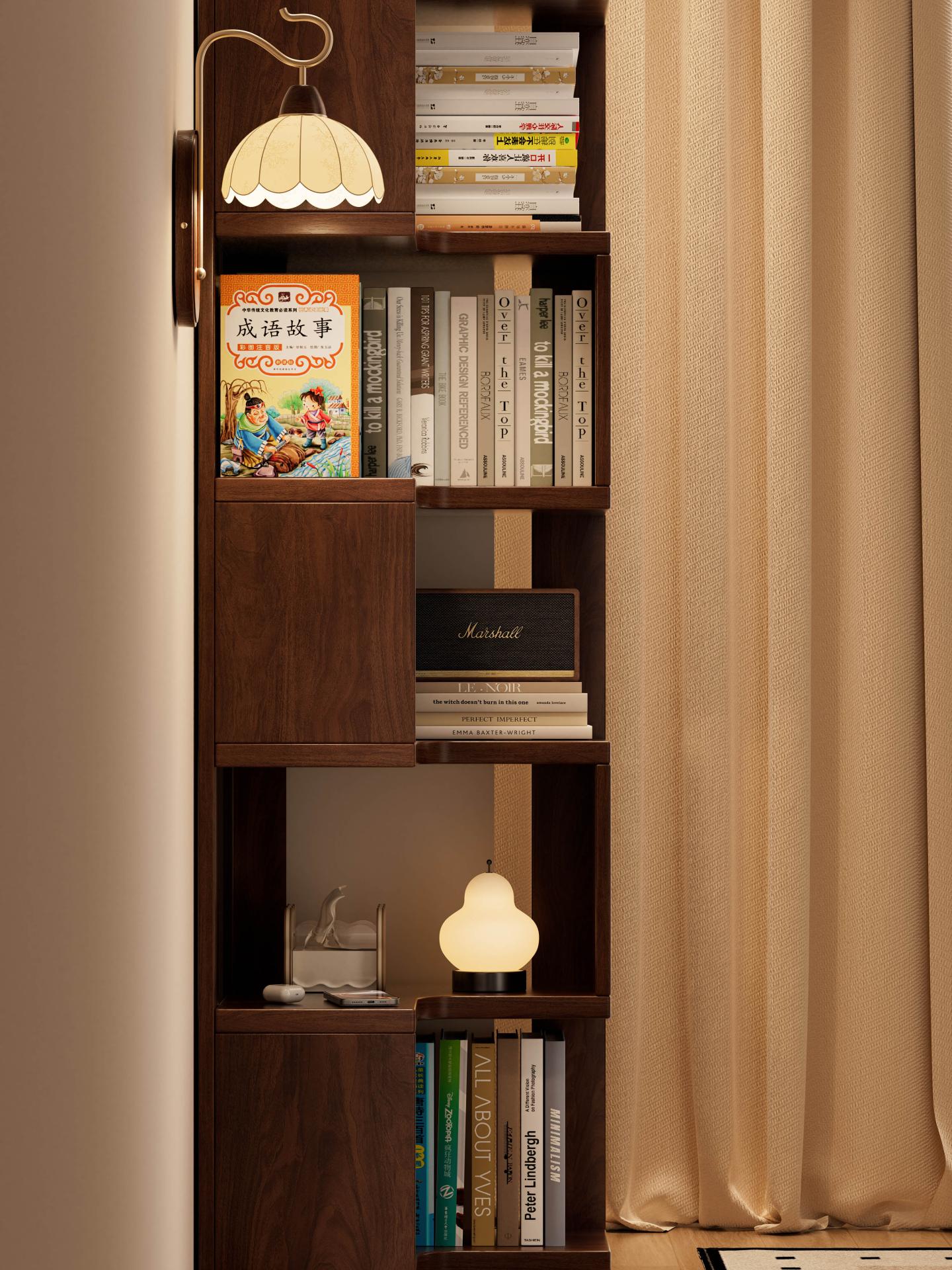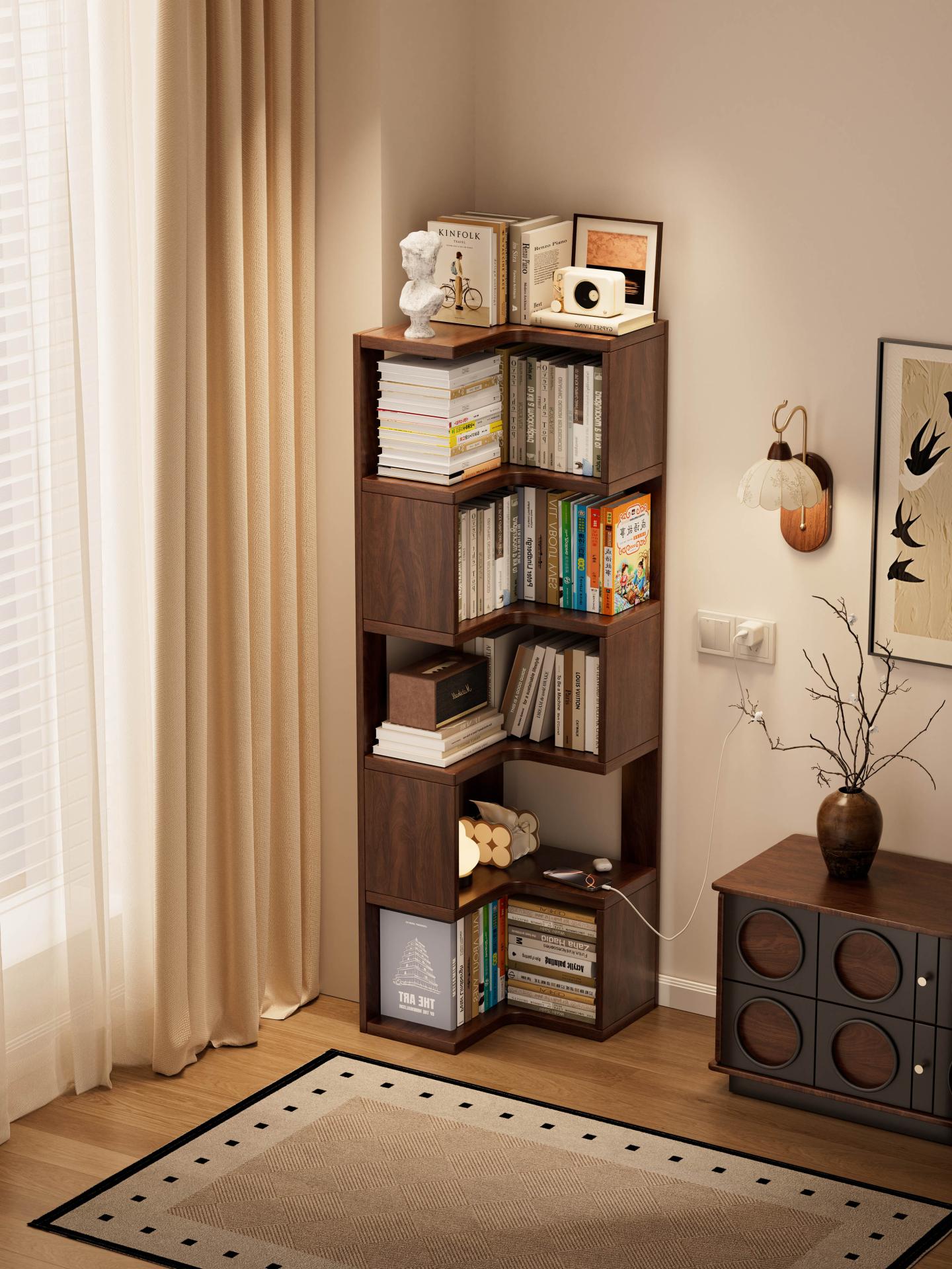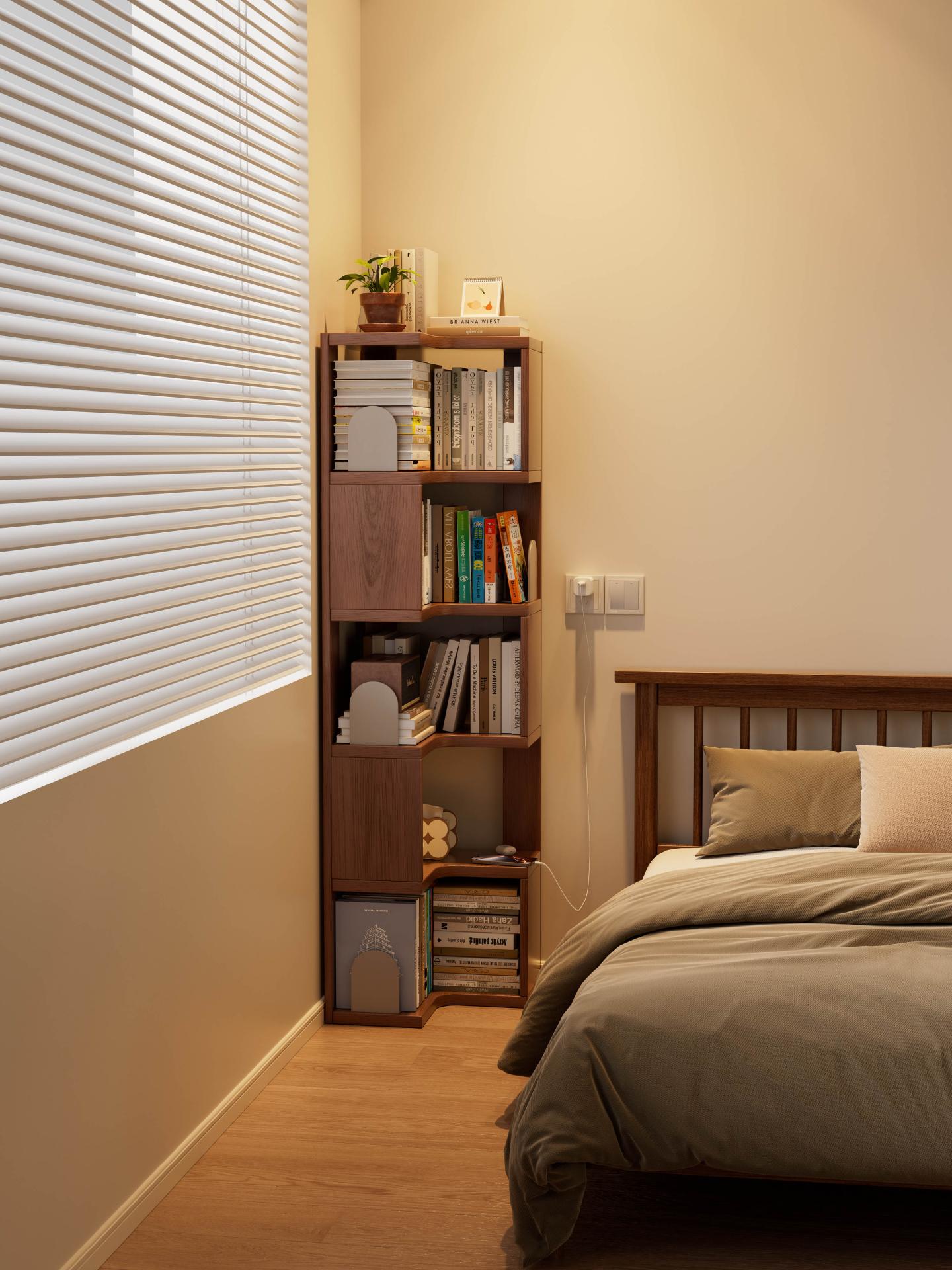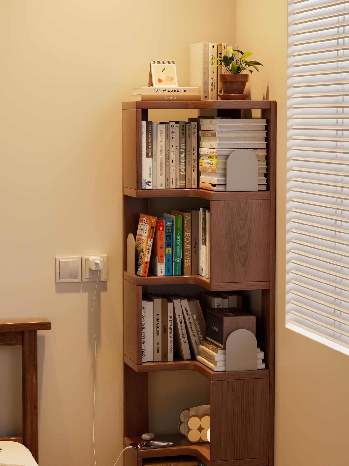 Visually, the bookshelf follows a design philosophy that blends natural aesthetics with practical functionality. The walnut-toned finish, a classic neutral color, highlights the natural grain and warm texture of solid wood while offering excellent stain resistance and versatility. It blends seamlessly with a variety of interior styles—including modern minimalist, Scandinavian, and Japanese styles. The well-proportioned L-shaped form harmonizes with surrounding walls and furniture, allowing the bookshelf to function not only as a storage unit but also as a warm visual focus point within the space. Smoothly rounded edges are finely polished to provide a smooth handfeel while minimizing the risk of accidental bumps or scratches, further enhancing user safety.