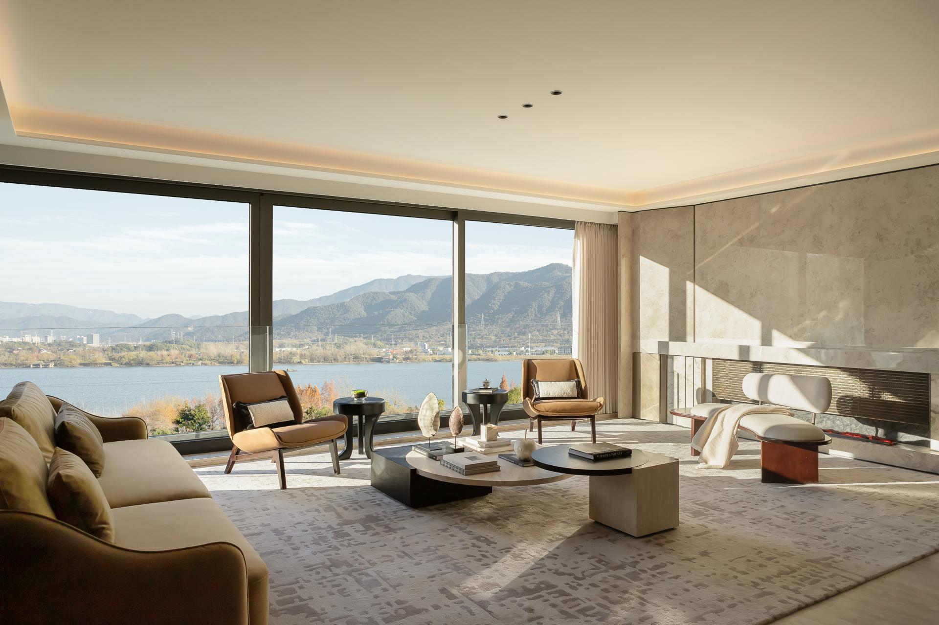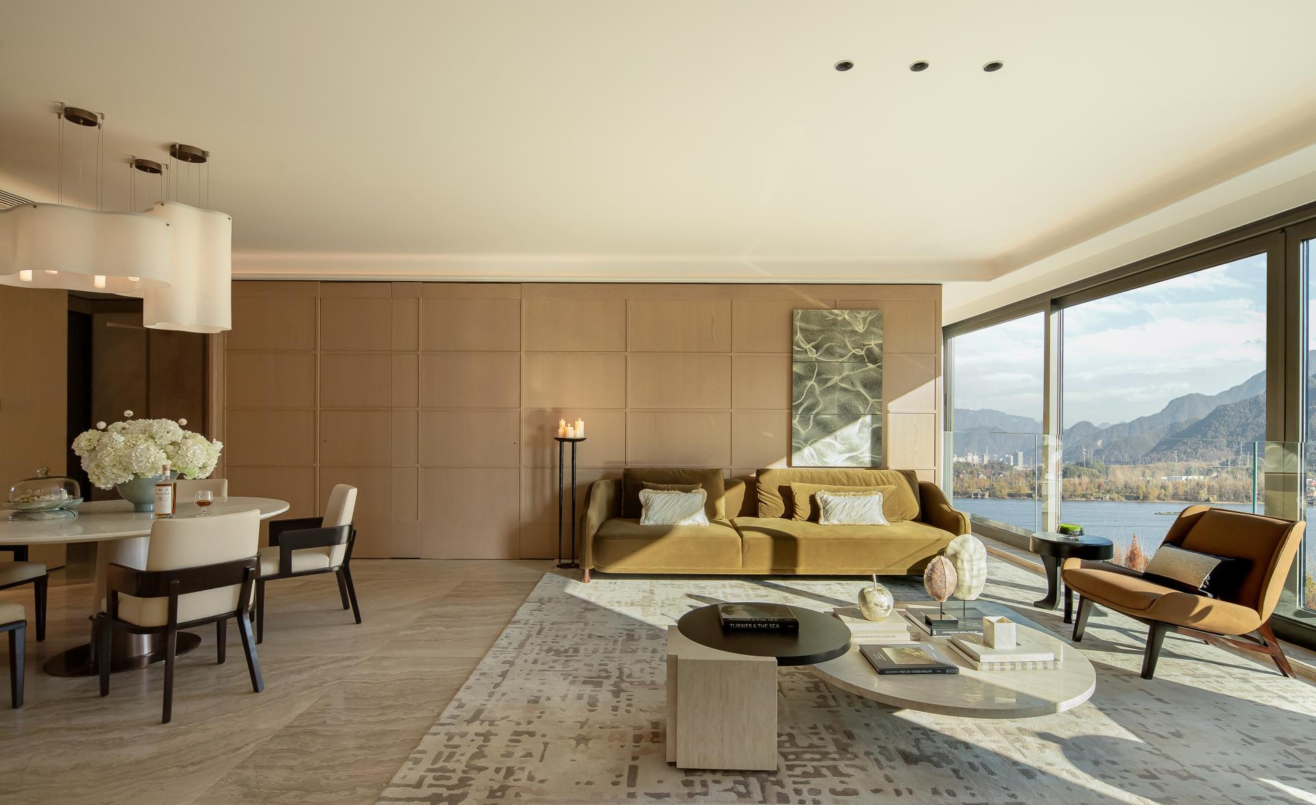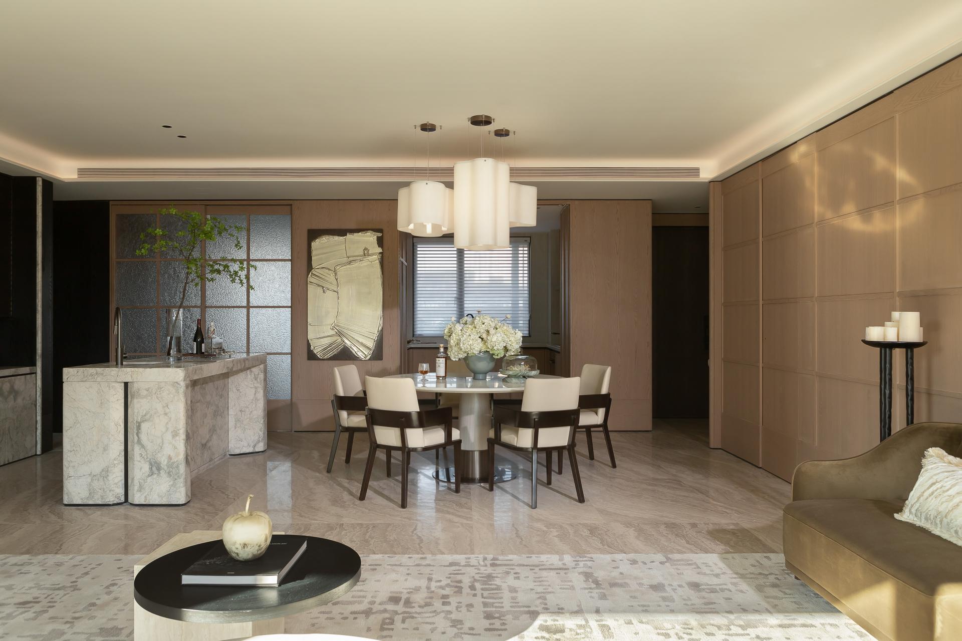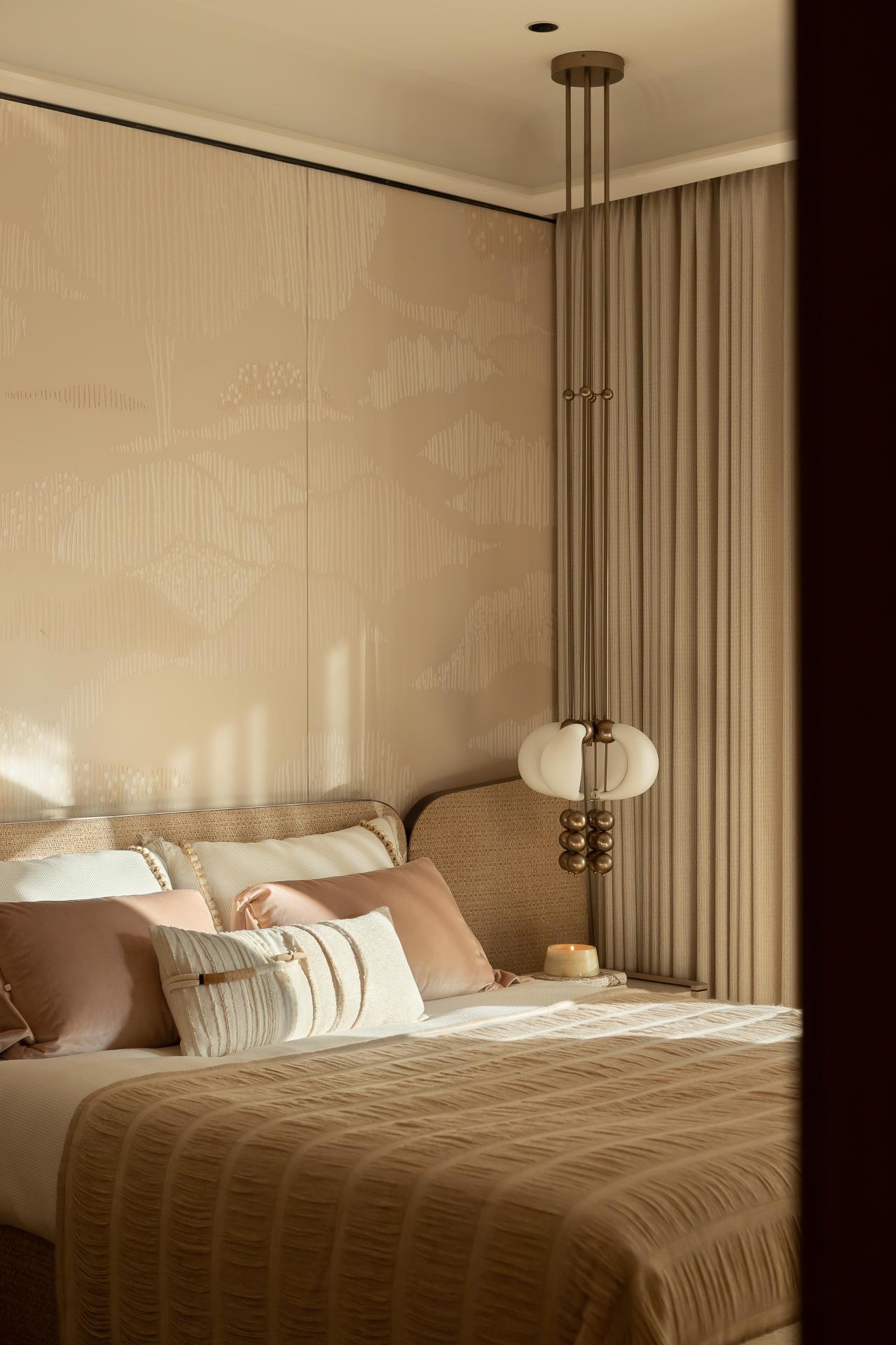 Guided by the spirit of "International Oriental," large floor-to-ceiling windows invite natural light, unfurling a scene of "Glistening Ripples." The flocculent veining within the jade seems to appear and disappear like moonlight on water, while travertine retains its natural texture. Olive green and pearl white complement each other. Materials respond in details—velvet, linen, and suede unfold across different corners, scales are intentionally slowed, and luxury lies hidden within proportions and textures.