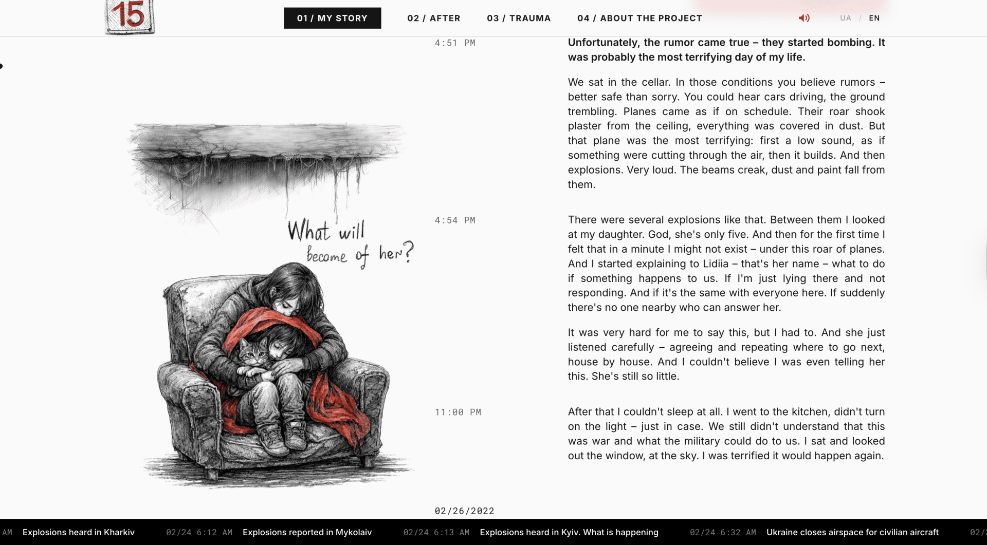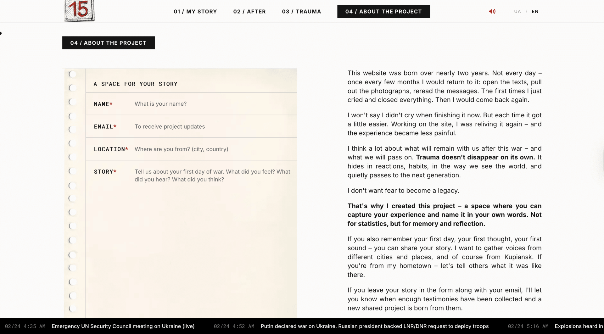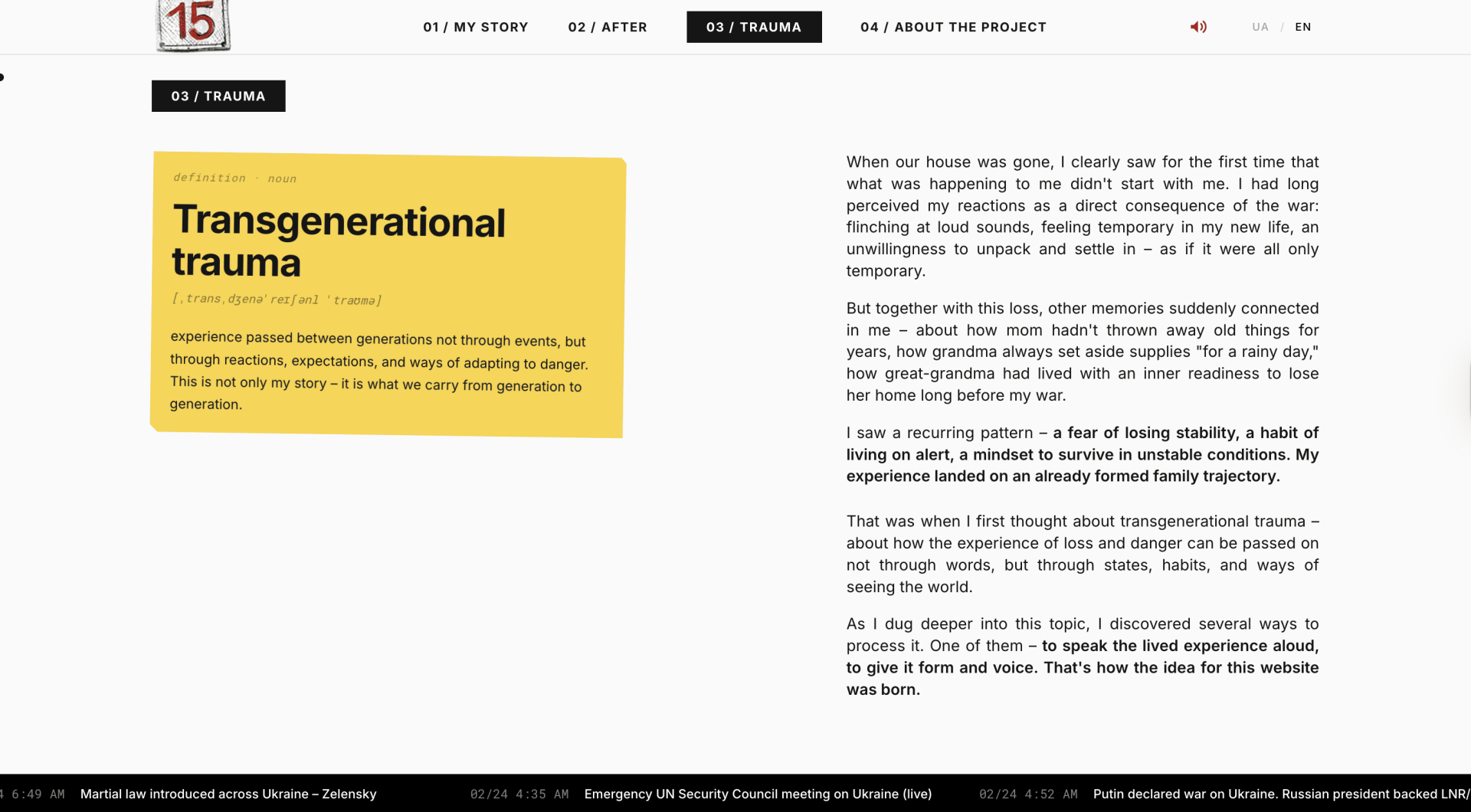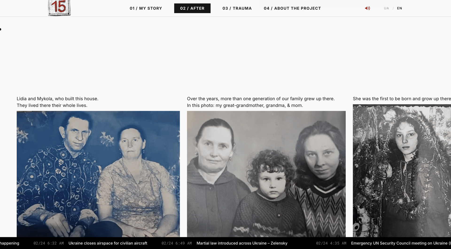 Beyond documenting one personal experience, the project reflects on transgenerational trauma: how events that happen during war continue to shape families and future generations. The final part of the website invites others to share their own stories, turning a personal narrative into a growing archive of collective memory.