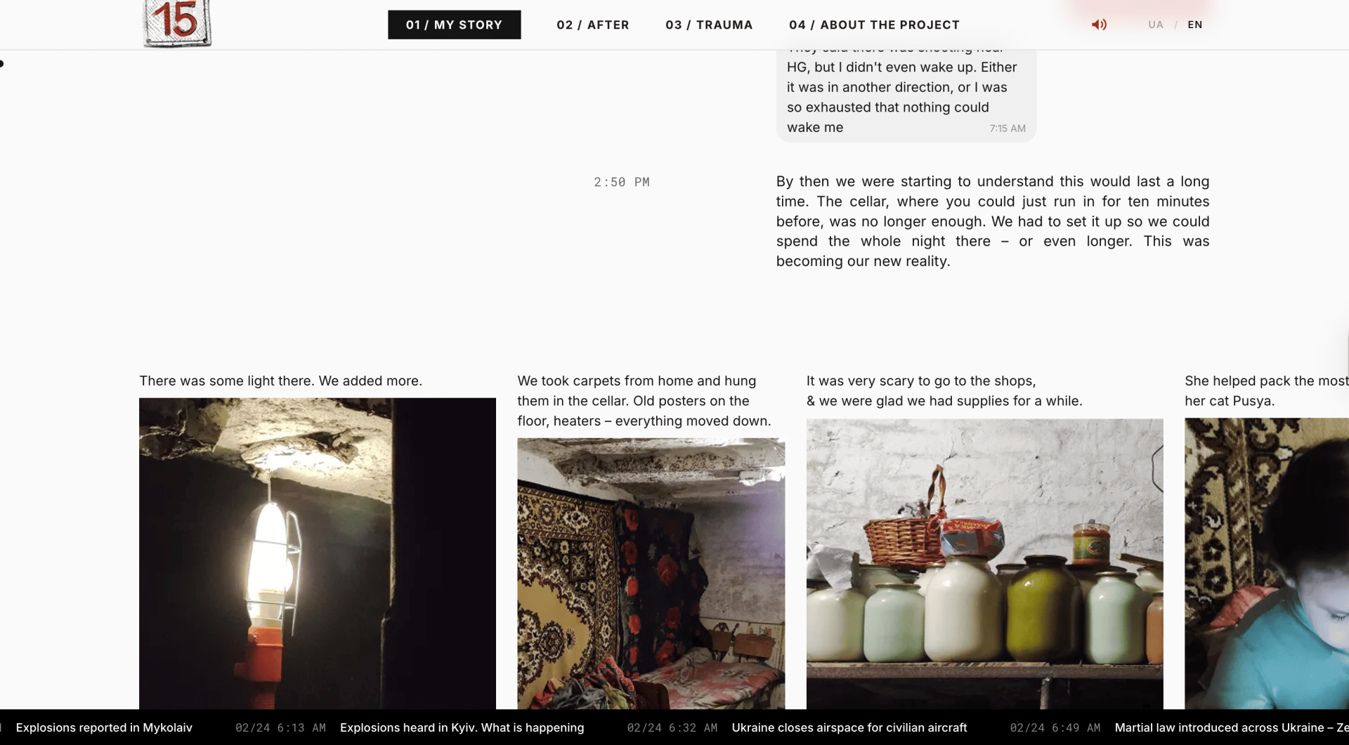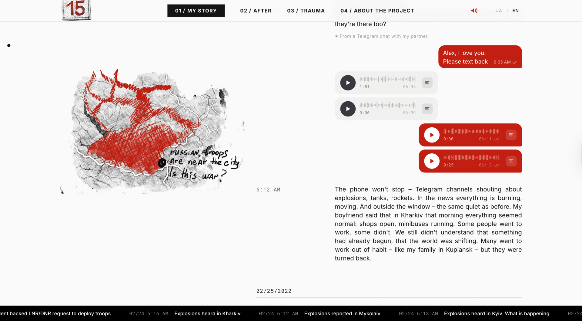 This website is a personal long-read about memory, war, and the traces these events leave long after the explosions stop. The story is based on my experience during the occupation of the Ukrainian city of Kupiansk in 2022. The project reconstructs the first months of the full-scale invasion through fragments of everyday life: notes written during the occupation, timestamps, photographs, and excerpts from conversations. Instead of a traditional narrative, the story unfolds like a timeline of memory, where small moments slowly form a larger picture.