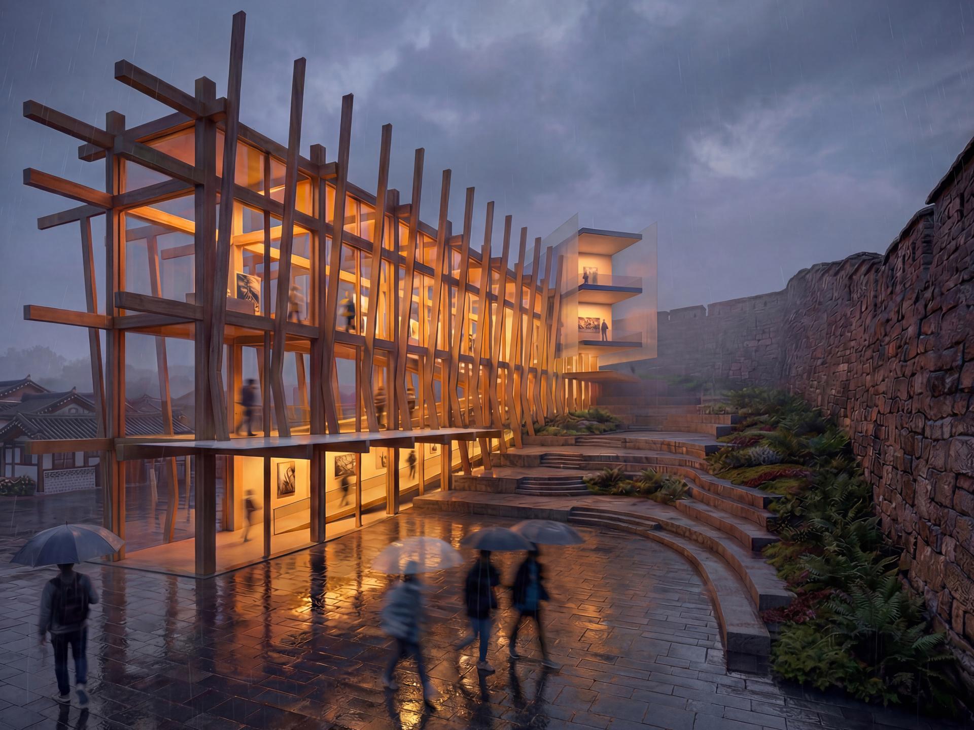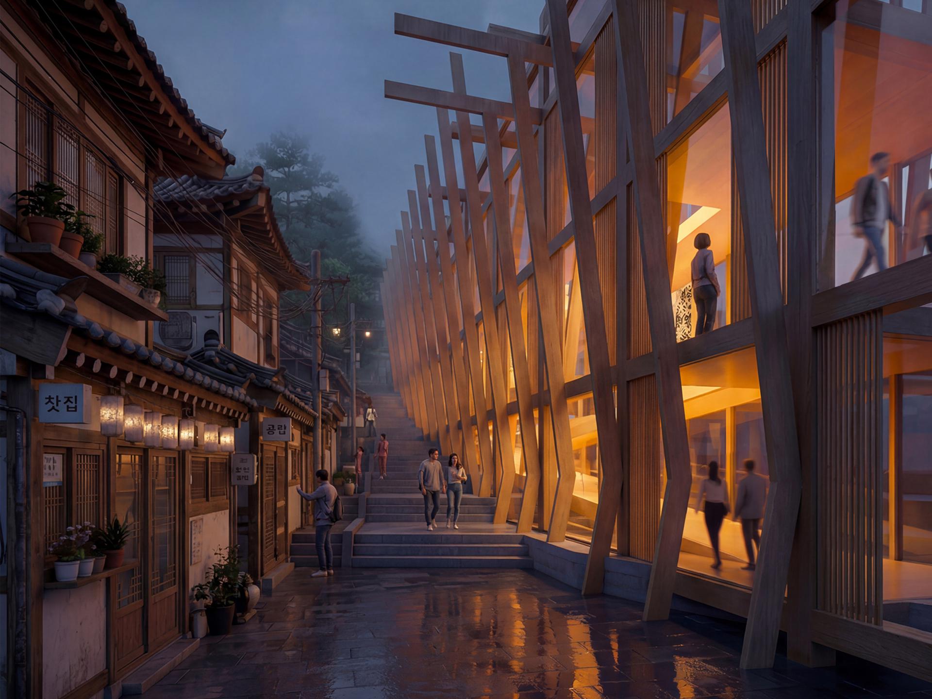 "Temporal Graft" is a timber armature mediating the threshold between the Seoul City Wall and the vulnerable golmok (alleyway) residential fabric. Unlike traditional preservation that displaces communities, this surgical intervention recycles the vernacular urban edge. It provides an ADA-compliant ramp for universal access while acting as a permeable buffer, shielding dwellers from tourist influx and fostering a symbiotic coexistence of the city's historic past and authentic present.