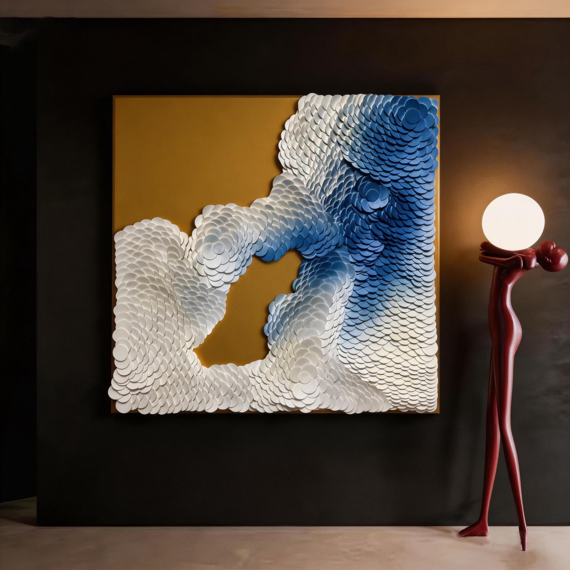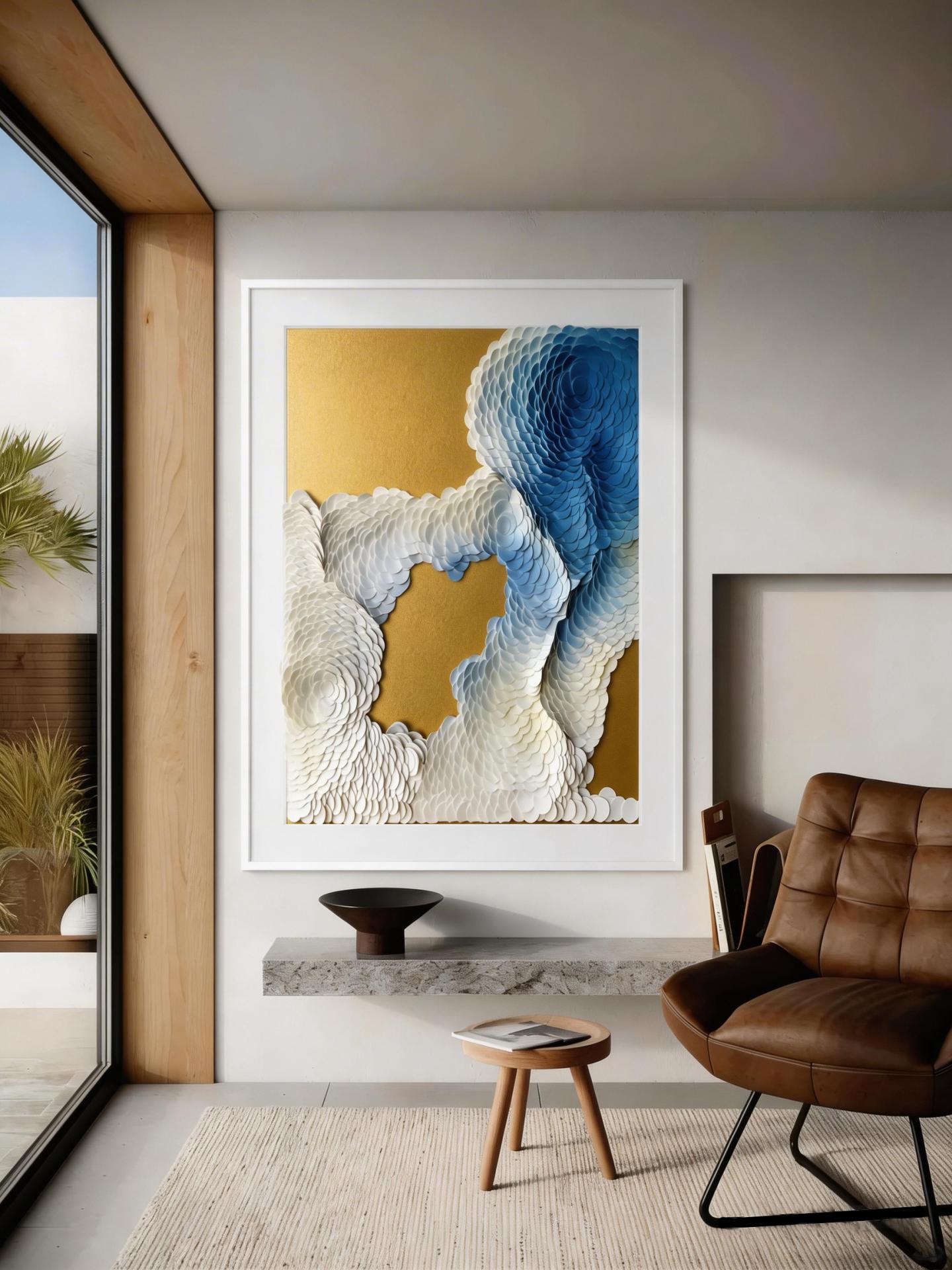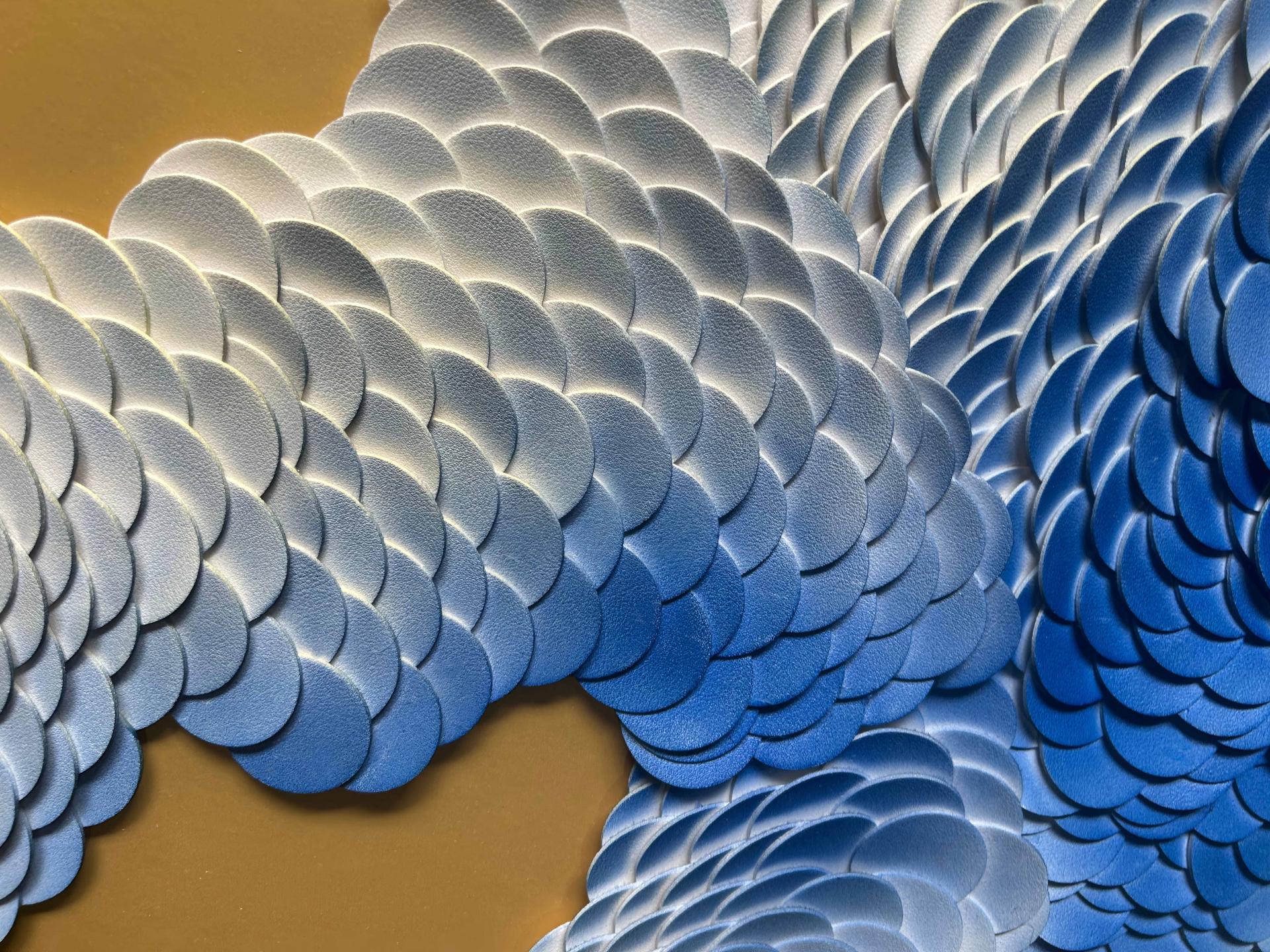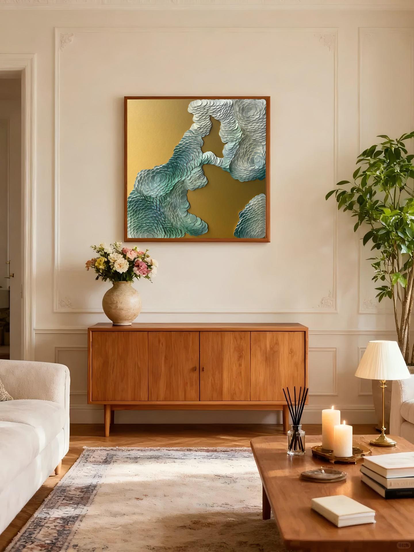 Continuous Field 1–10 is a series of three‑dimensional relief art pieces conceived for the modern home, composed of ten independent works. Each piece starts with a flat gold‑toned base panel, onto which numerous leather units of identical size are meticulously layered by hand. Through delicate color gradients and staggered arrangements, these units create airy, richly textured layers that seem to breathe. The artist’s subtle composition transforms the leather modules into shapes reminiscent of waves, clouds, or mountain ranges: azure “billows” surge from one corner of the picture, extending naturally into space, and forming a vivid contrast with silvery “foam” and the golden background, imbuing the static installation with a sense of flowing movement and visual tension.