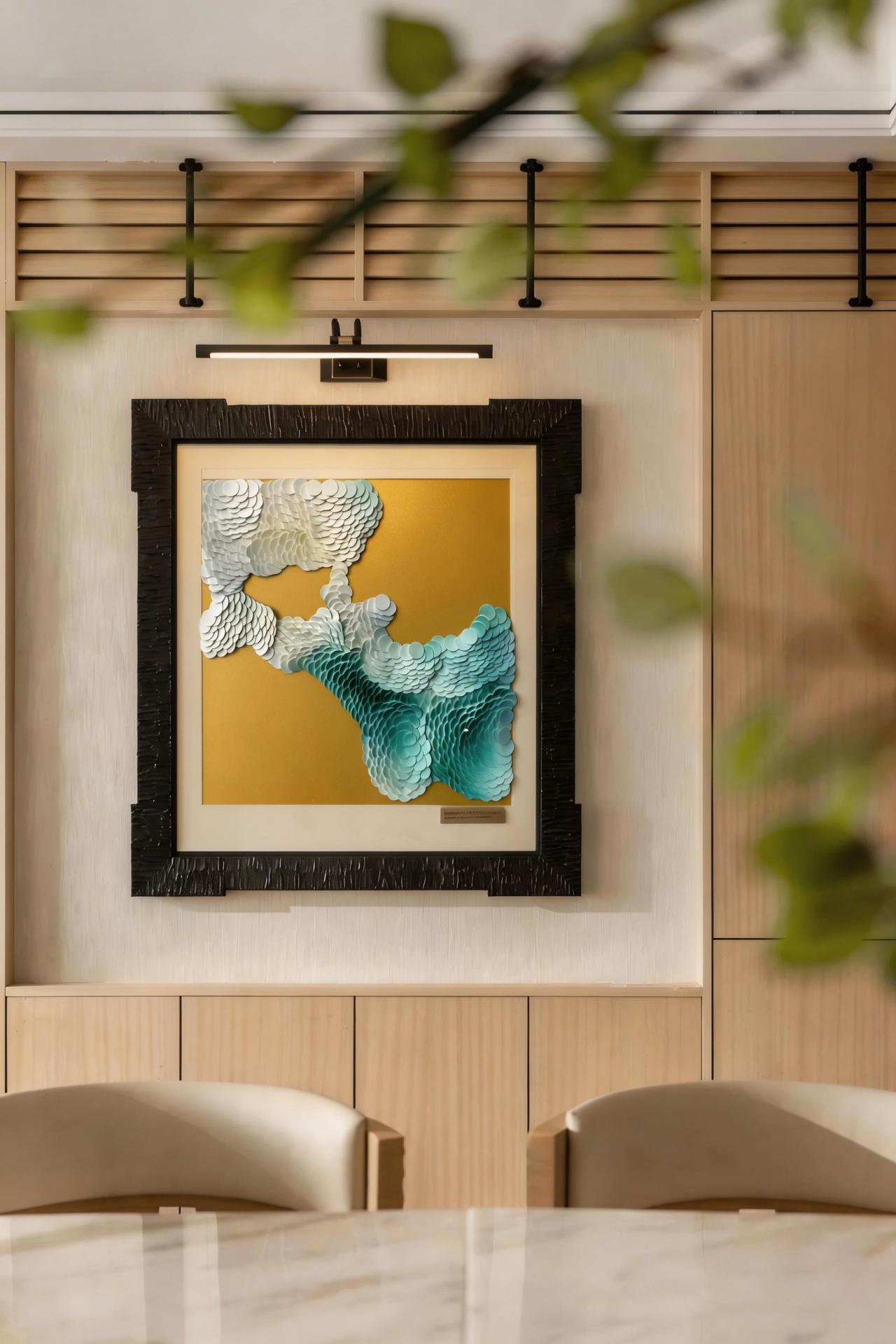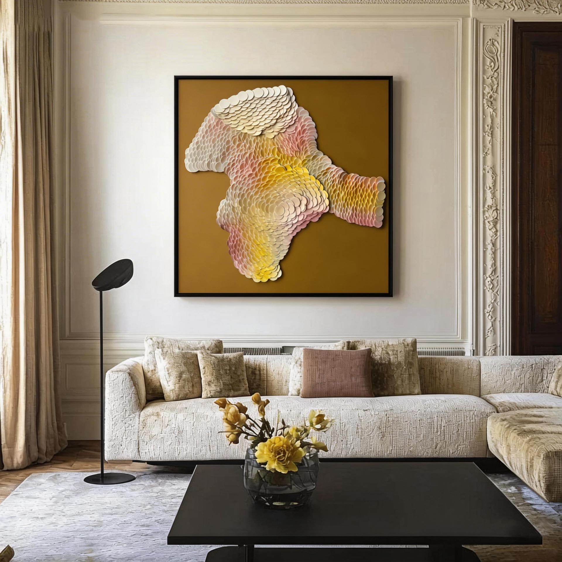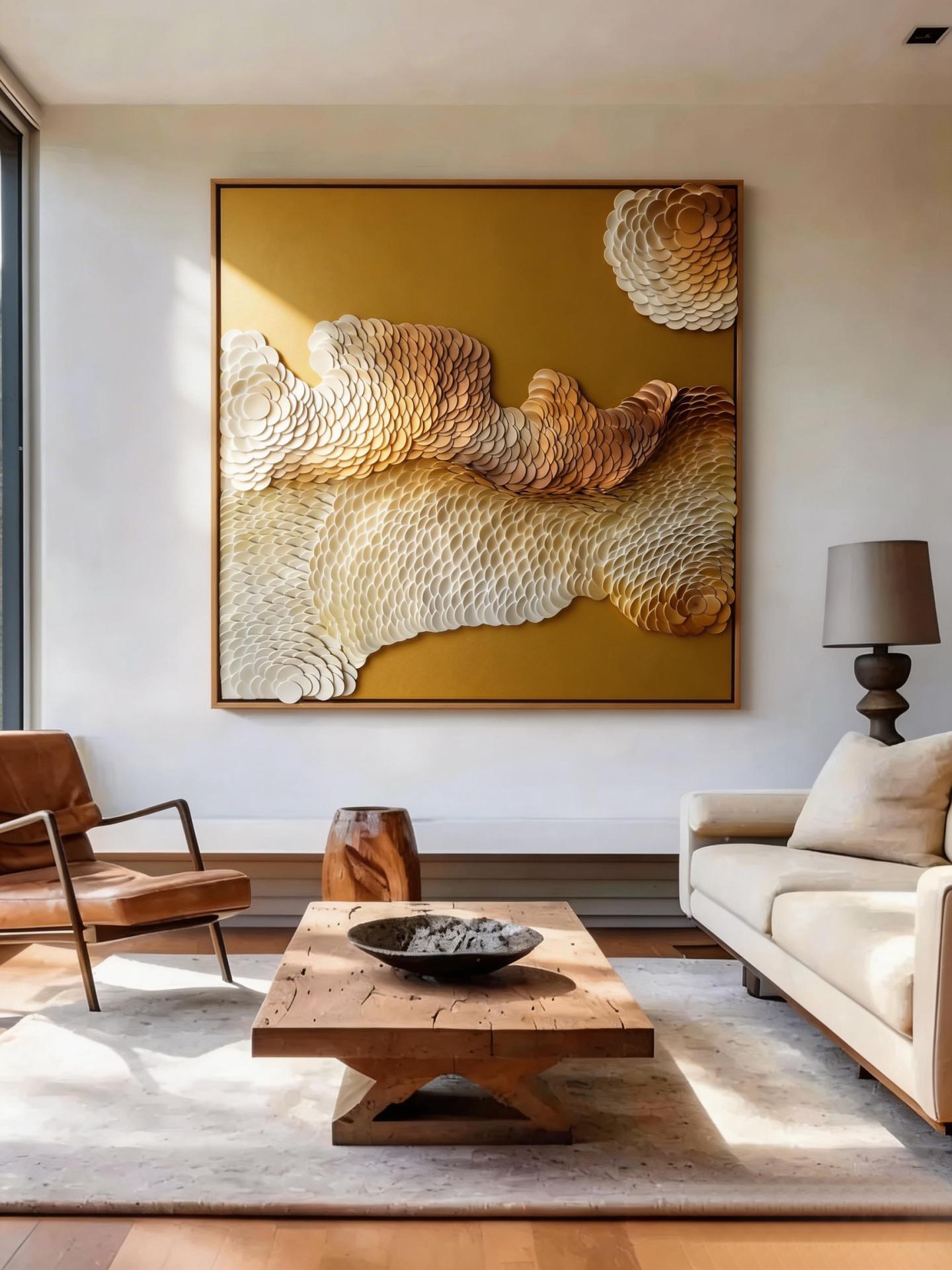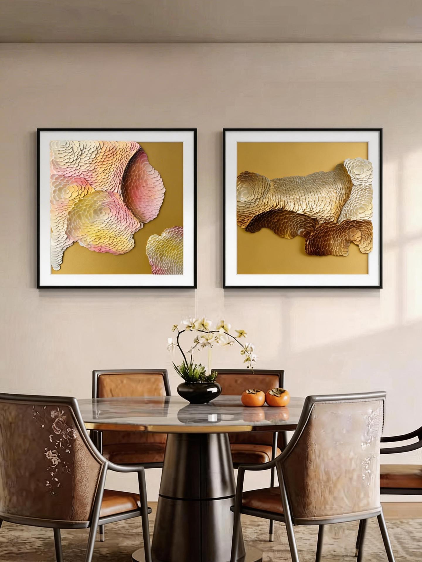 Continuous Field 1–10 is a series of three‑dimensional relief art pieces conceived for the modern home, composed of ten independent works. Each piece starts with a flat gold‑toned base panel, onto which numerous leather units of identical size are meticulously layered by hand. Through delicate color gradients and staggered arrangements, these units create airy, richly textured layers that seem to breathe. The artist’s subtle composition transforms the leather modules into shapes reminiscent of waves, clouds, or mountain ranges: azure “billows” surge from one corner of the picture, extending naturally into space, and forming a vivid contrast with silvery “foam” and the golden background, imbuing the static installation with a sense of flowing movement and visual tension.