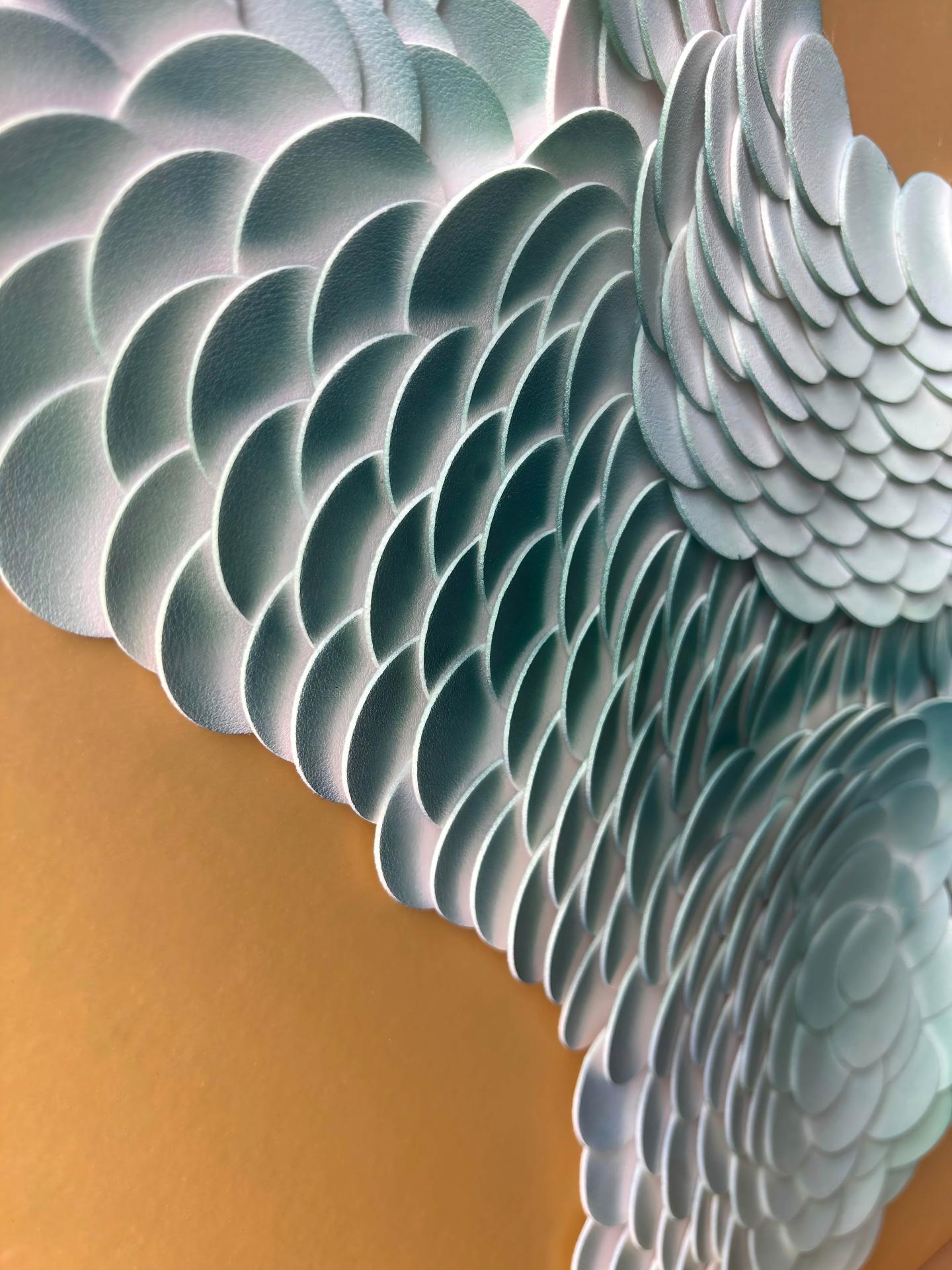 The core allure of the work lies in its intense tactile quality. The stacked leather elements generate a play of light and shadow; under illumination, the lamellae reflect light at different angles, producing a luster of distinct gradations, as if inviting one to touch their soft yet resilient texture.