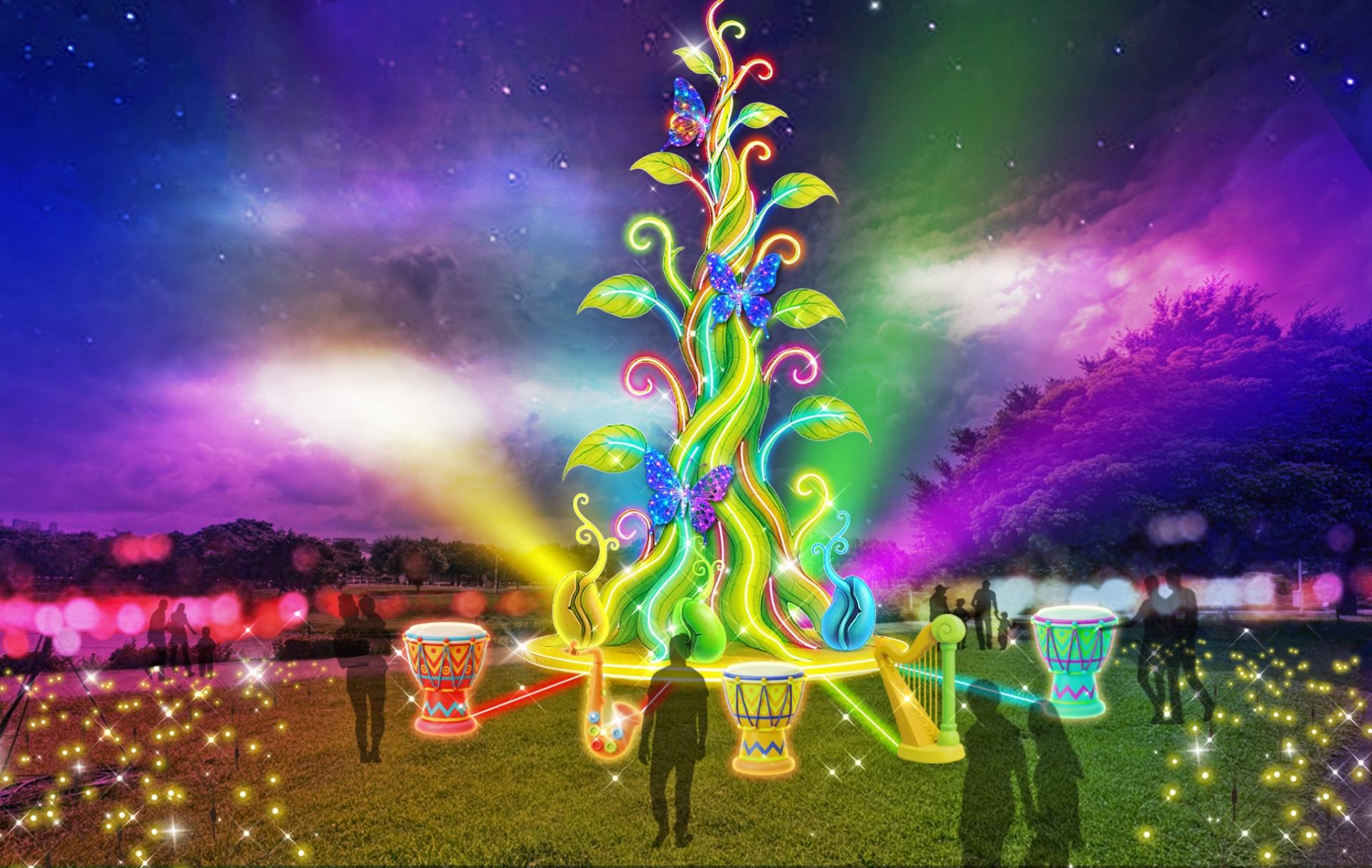 Interactive elements are a major highlight of the zone. An infrared-sensing saxophone plays melodies when activated, while a harp and drum surfaces trigger lighting effects. Sound and light synchronize and transmit toward the central installation, the Tree of Dream Pursuit, transforming the entire area into a collaborative light-and-sound performance created by visitors themselves.