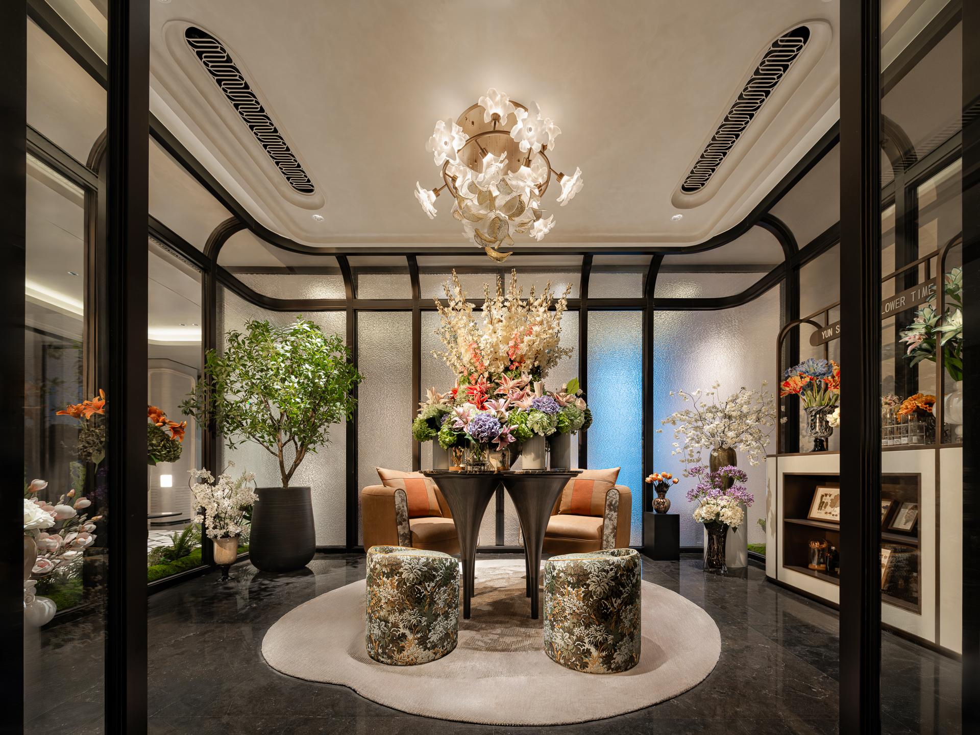 4.Condensed Fragrance and Quiet Reflection**: The artistic corridor continues the symbolic spirit with lily flower arrangements and transparent spaces; the tea room subtly reflects the inclusiveness of 'jade' and the elegance of 'lily', serving as the living core of the project.