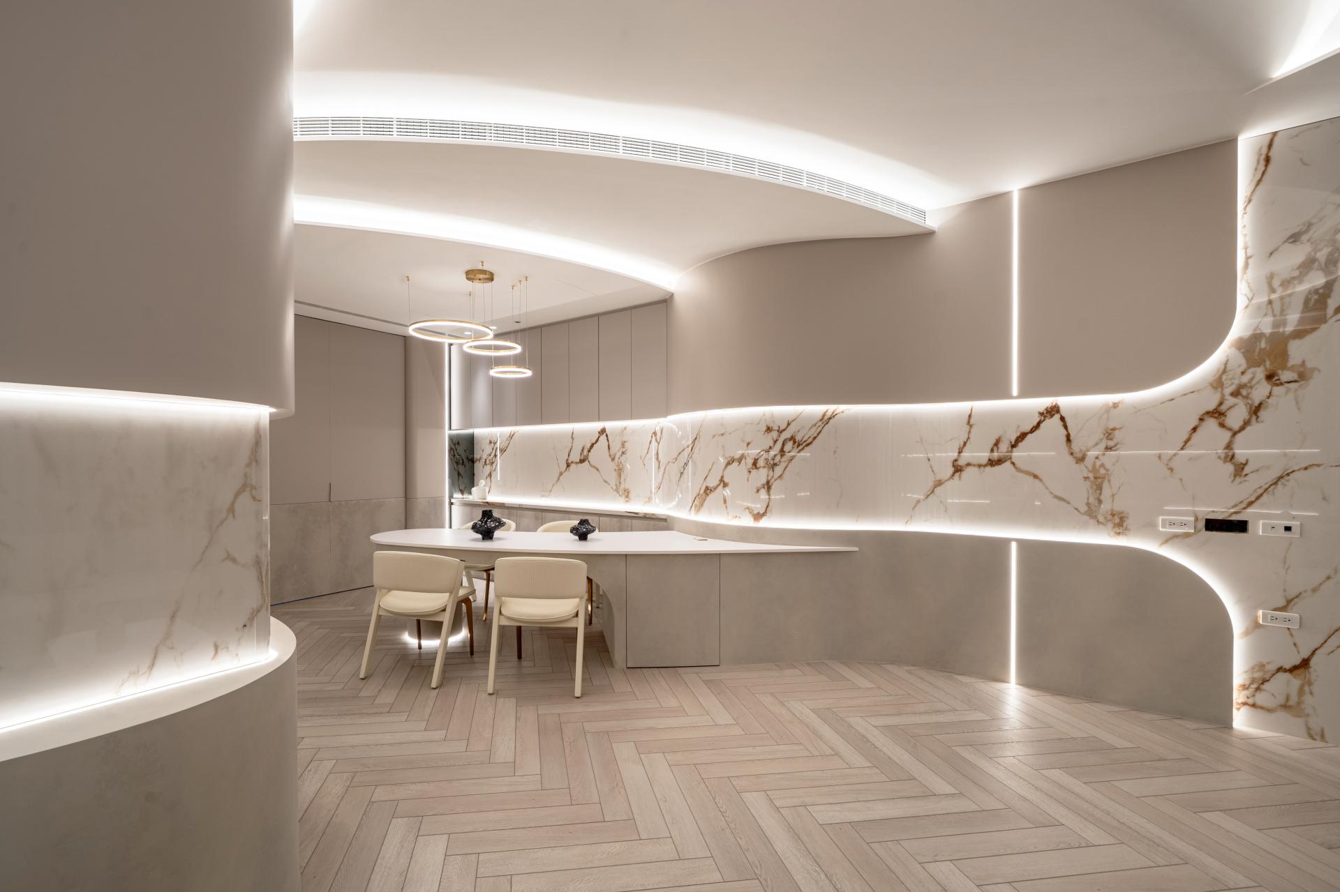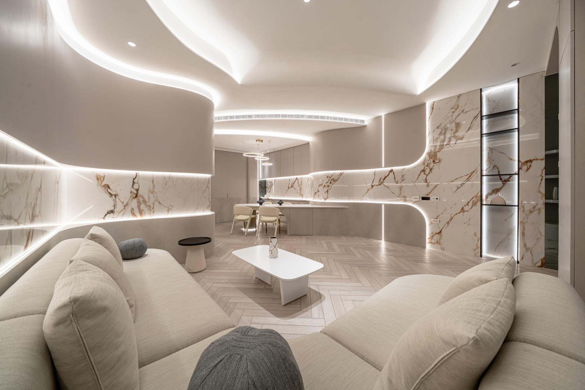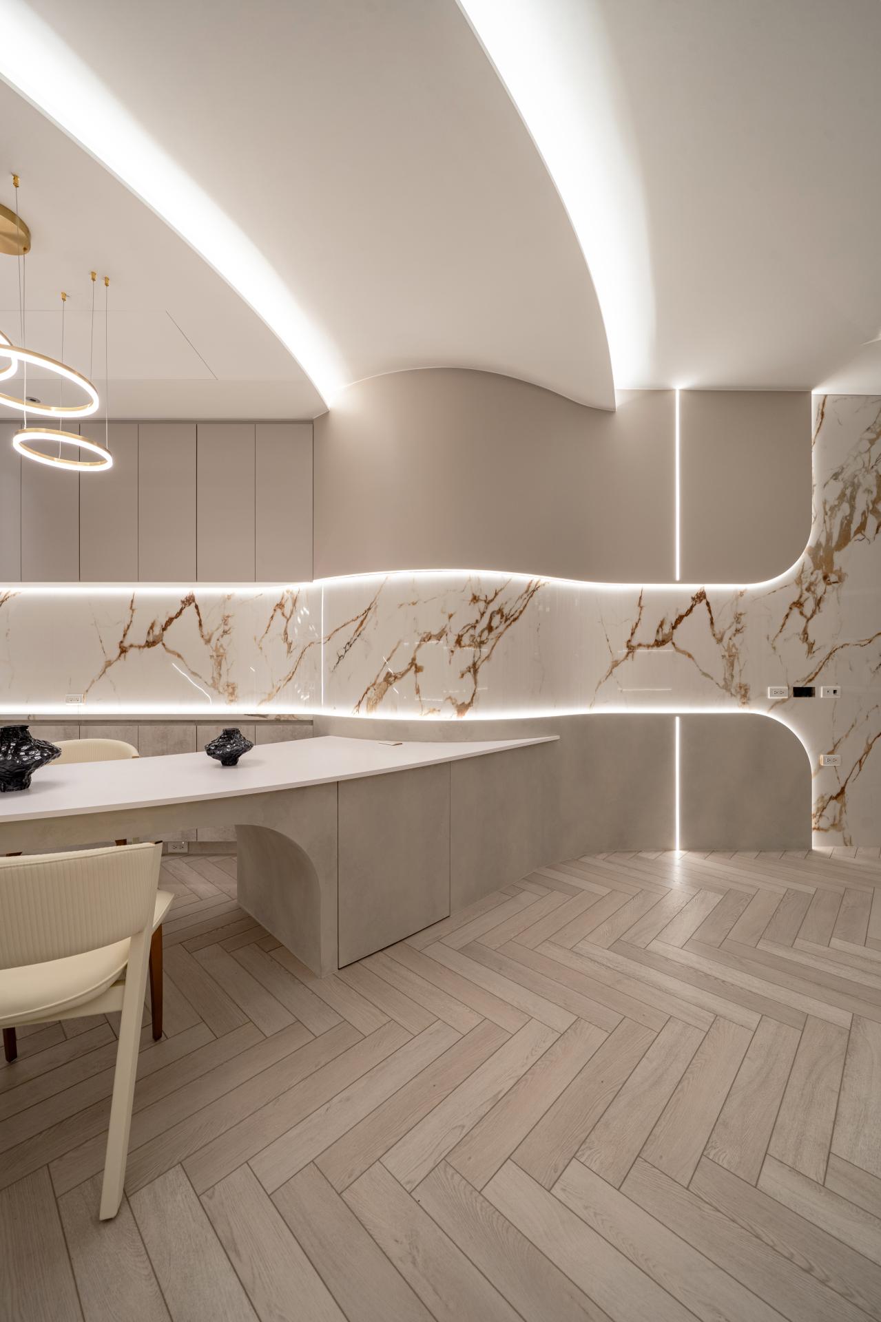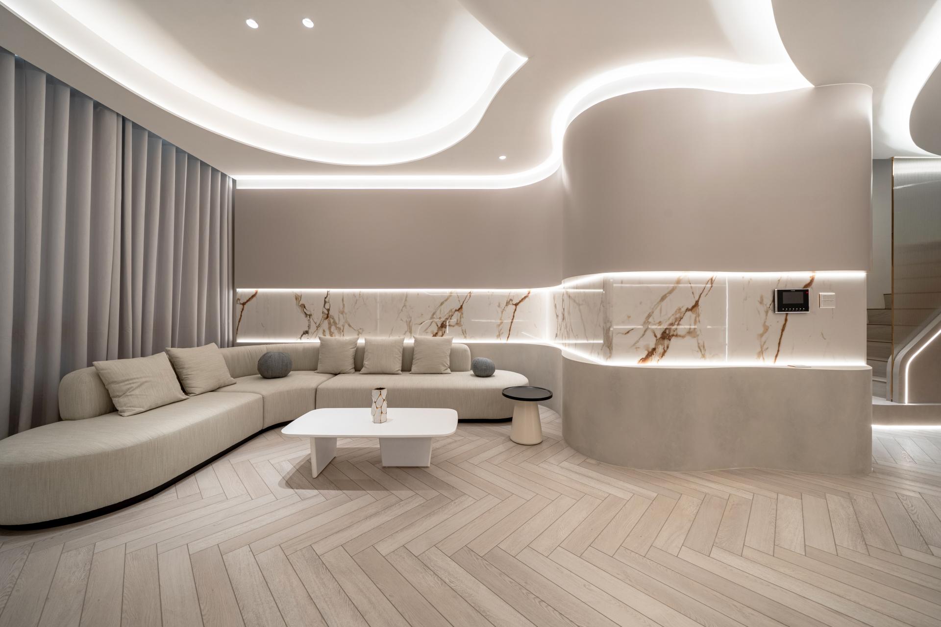 Natural materials and warm neutral tones reinforce the softness of the design. Marble surfaces with delicate veining interact with indirect lighting to produce subtle reflections and depth, while light wood flooring laid in a herringbone pattern introduces rhythm and tactile warmth. Curved furniture and custom-built elements echo the architectural language, creating continuity between structure and interior objects.