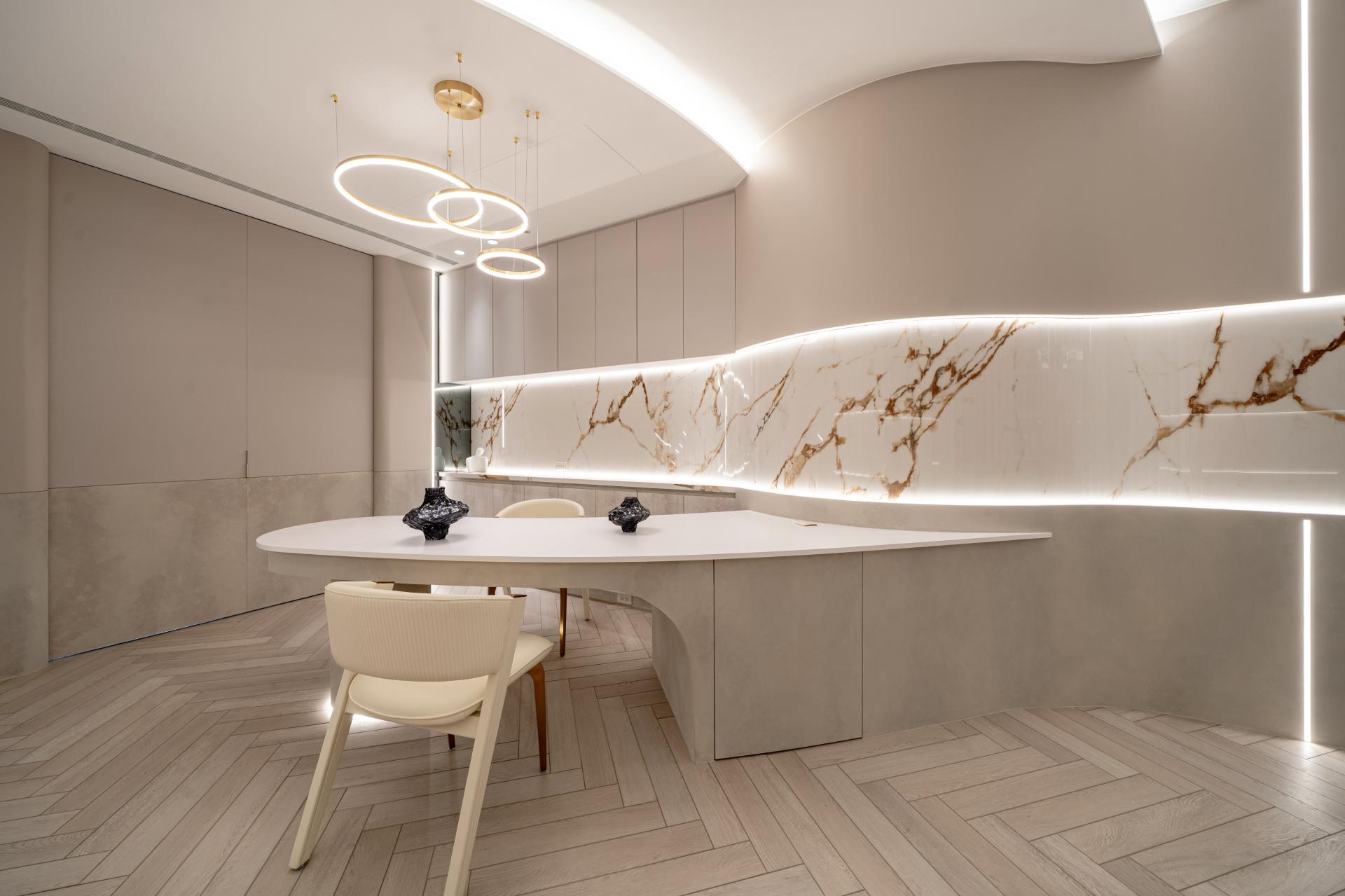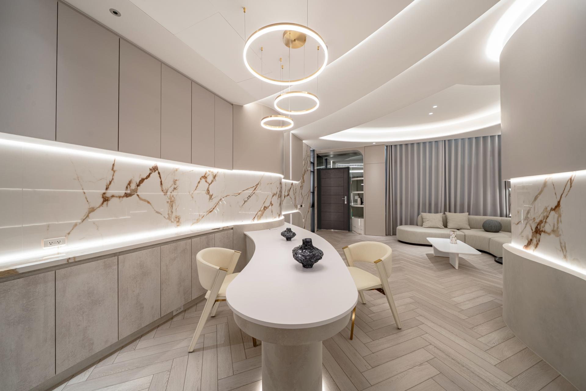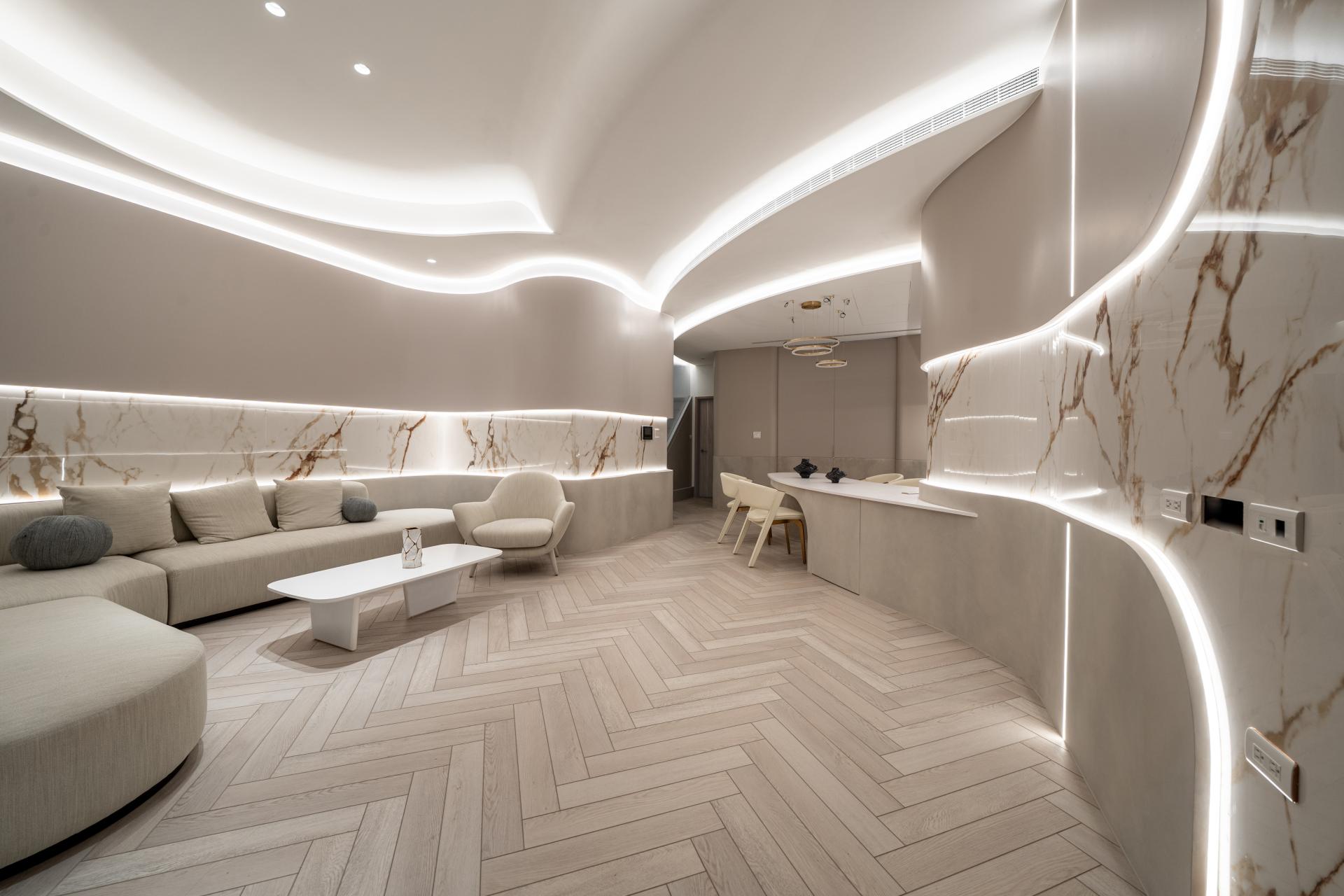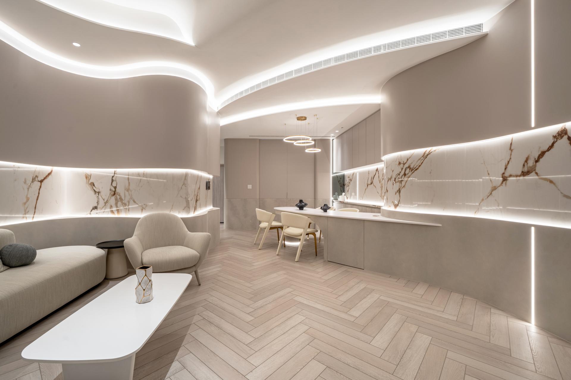 Natural materials and warm neutral tones reinforce the softness of the design. Marble surfaces with delicate veining interact with indirect lighting to produce subtle reflections and depth, while light wood flooring laid in a herringbone pattern introduces rhythm and tactile warmth. Curved furniture and custom-built elements echo the architectural language, creating continuity between structure and interior objects.