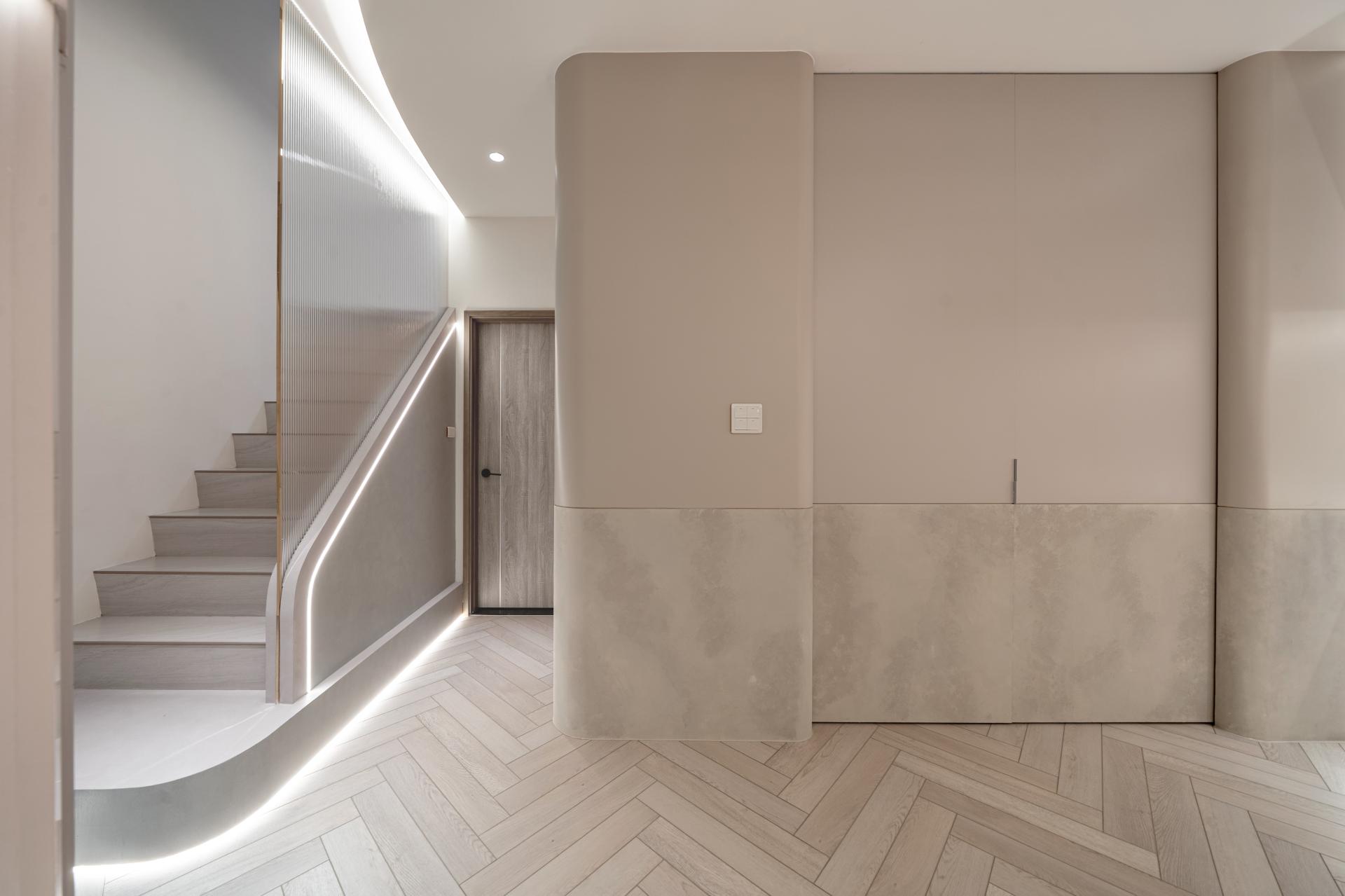 The spatial composition emphasizes the balance between sculptural form and livable comfort. Hidden lighting, seamless detailing, and carefully composed geometry work together to create a serene environment that feels both contemporary and timeless. Through the choreography of light and form, the interior becomes an immersive spatial experience where illumination and movement coexist in quiet harmony.