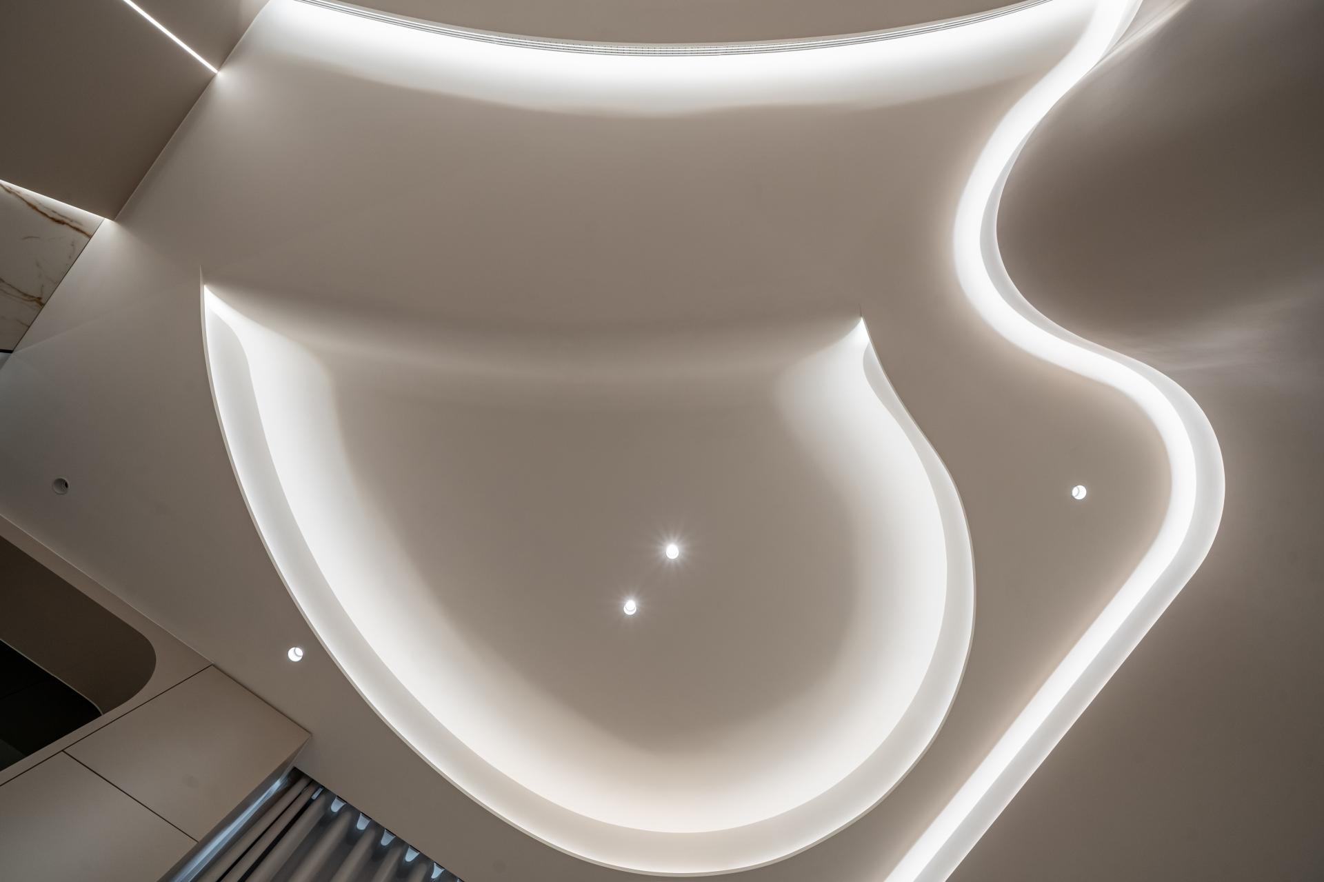 The ceiling becomes a flowing canvas where concealed linear lighting traces organic paths, creating a dynamic composition reminiscent of light in motion. These illuminated curves extend across walls and architectural surfaces, visually connecting different zones while maintaining spatial openness and harmony. The result is a calm yet expressive environment where light appears to glide effortlessly through the space.