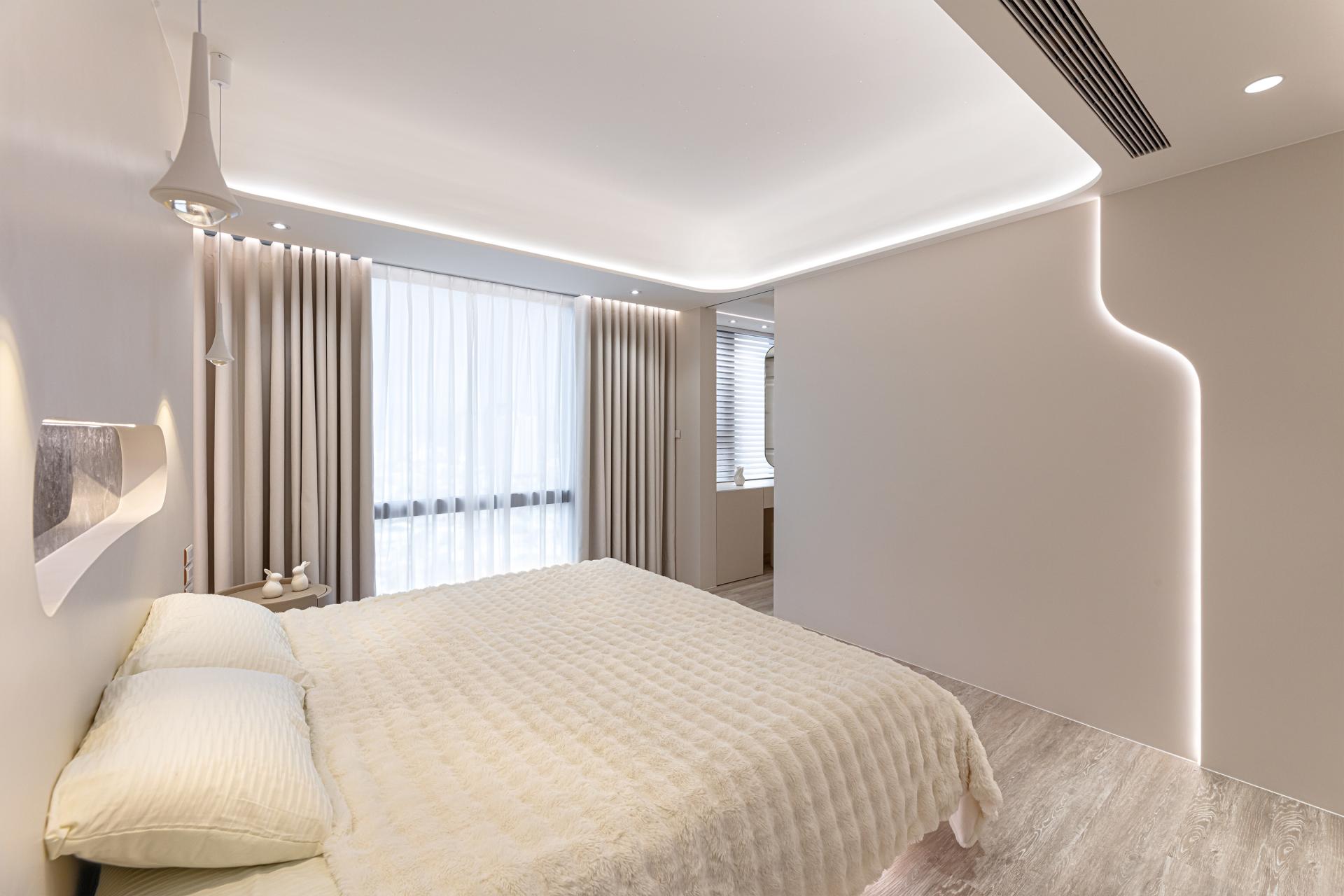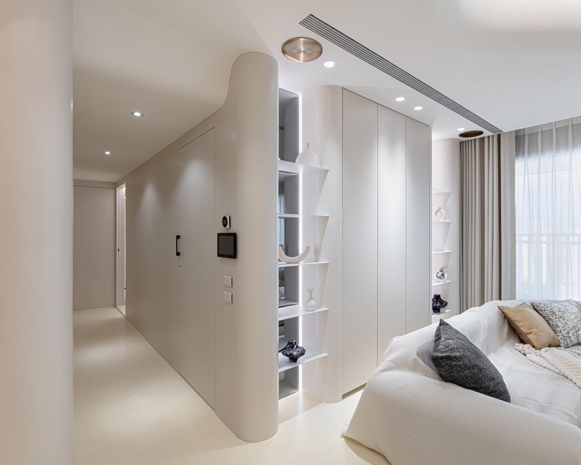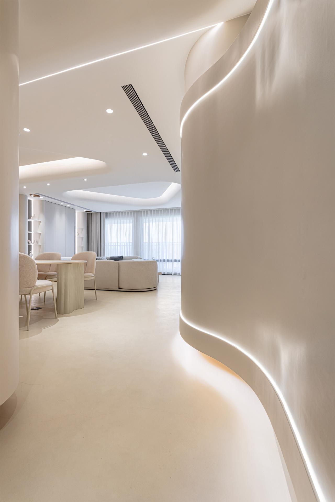 A palette of beige, creamy white, and warm gray shapes a calm and harmonious environment. Rounded architectural edges soften the boundaries between walls, cabinetry, and furniture, allowing elements to appear as though they grow naturally from the same spatial language.