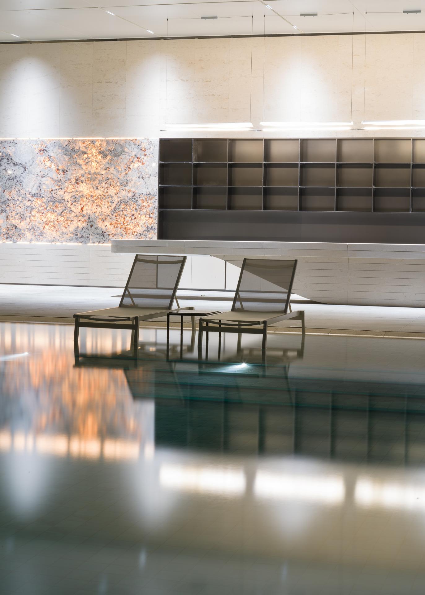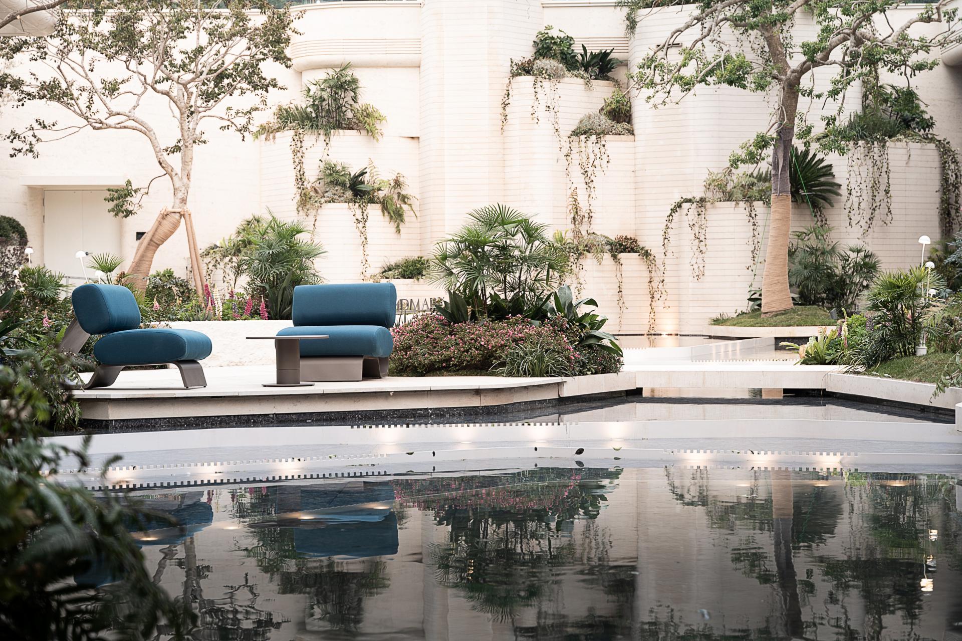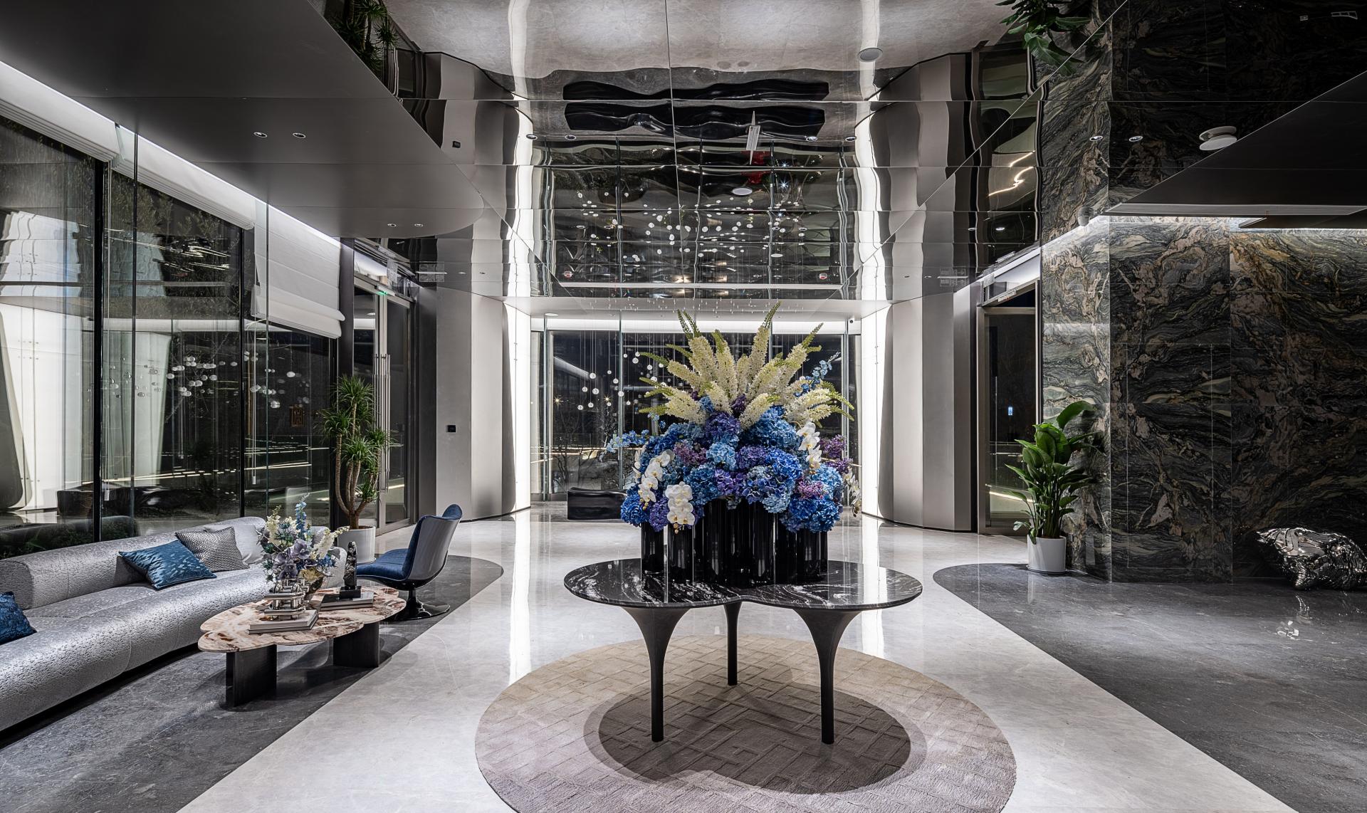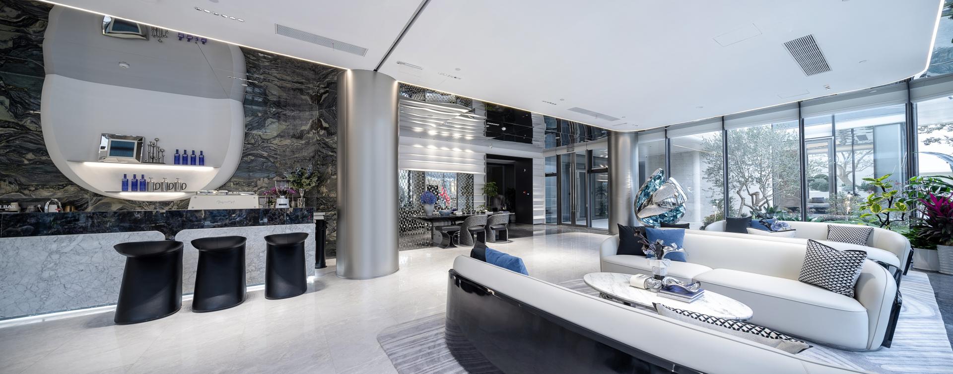 Rooted in the philosophy of “coexisting with nature,” the exterior design adopts a sophisticated palette of light neutral tones, silver mirror finishes, and blue accents to cultivate an atmosphere that is serene, elegant, and futuristic. The spatial proportions adhere to the classical aesthetic principle of “valuing void as much as solid,” striking a delicate balance between visual richness and purity. This intentionality extends to the material use, where the interplay of mirror-finish metal, aquatex glass, marble, and leather orchestrates a rich sensory narrative. Moreover, the project meticulously balances aesthetics with performance. Refined craftsmanship, seen in laser-perforated metal and double-sided mirror-finish screens, elevates the visual impact; yet this beauty is anchored by rigorous engineering. Through the use of impregnating sealers for stone and weather-resistant treatments for metal, the design ensures long-lasting durability, transcending superficial decoration to achieve enduring performance.