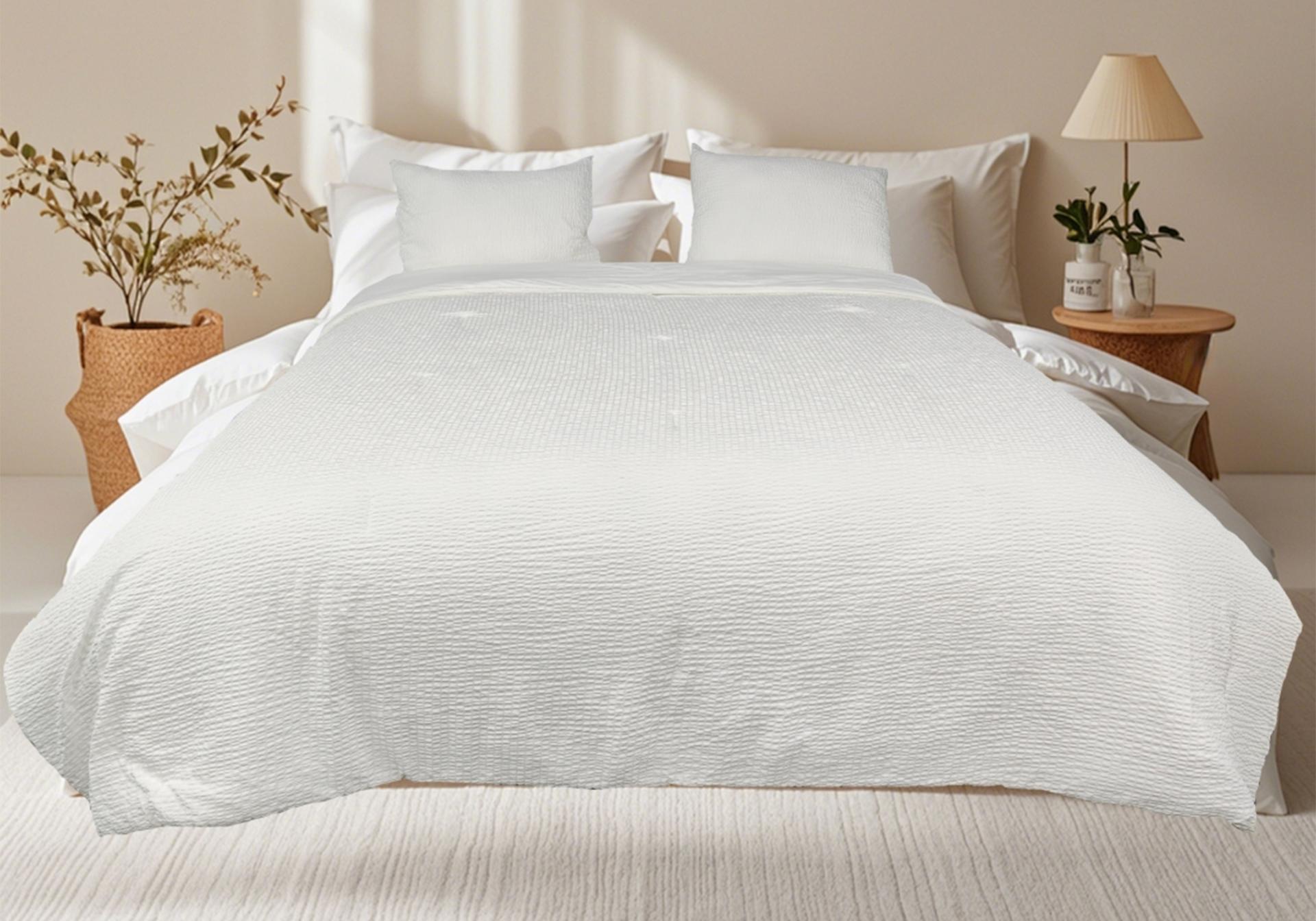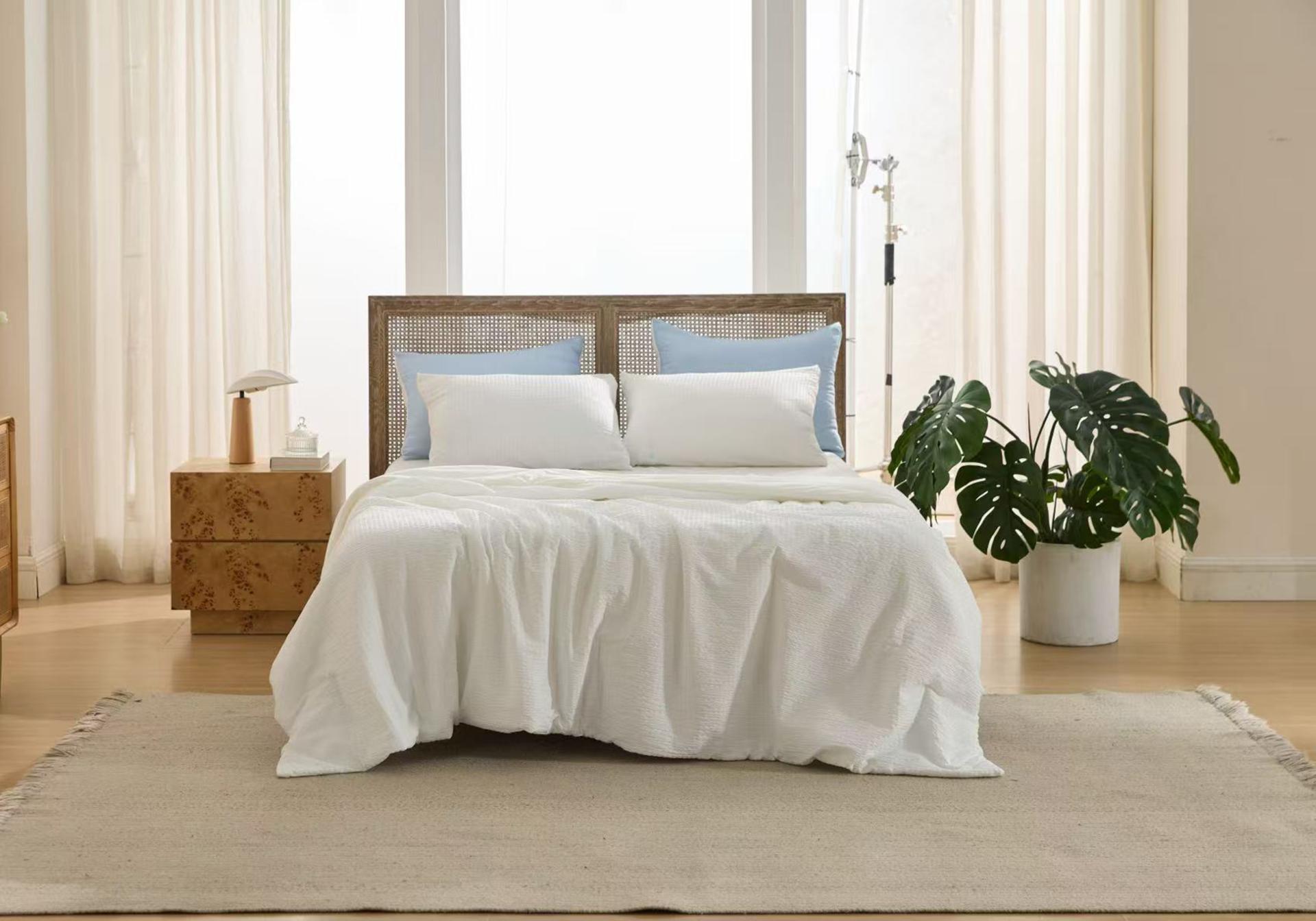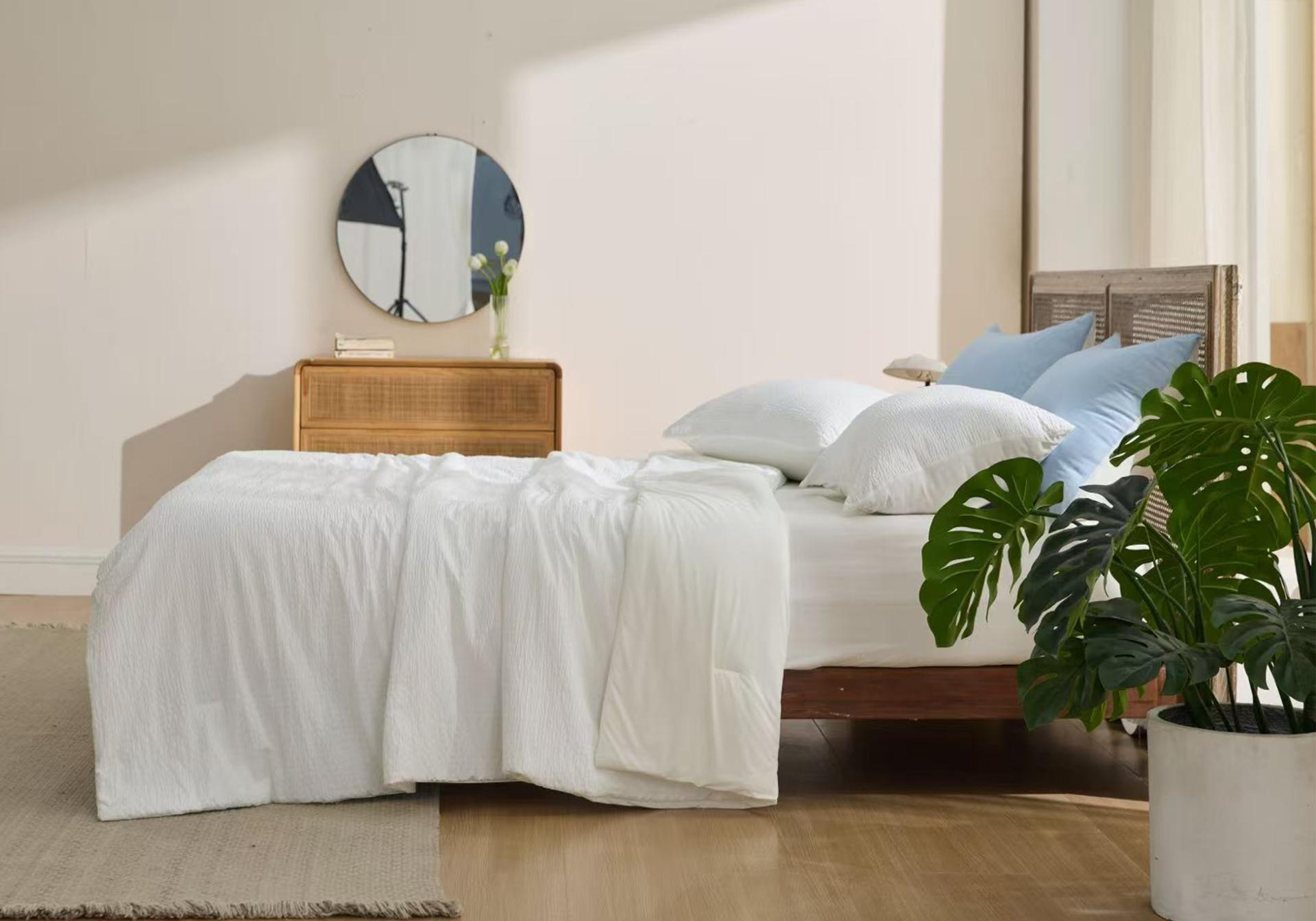 The dual-sided structure precisely caters to different comfort needs, allowing users to switch sides according to the environment. Side A uses a three-dimensional seersucker structure. Its raised texture reduces skin contact area and creates natural airflow channels that enhance heat dissipation, delivering a dry and breathable feel. Side B incorporates Rudolph temperature-regulating technology, achieving a high Q-Max value (>0.4) for fast and long-lasting cooling. In addition, the fabric is treated with anti-odor technology that can break down the four main chemical components of sweat, keeping the quilt fresh. Thanks to the hydrophilicity of CASTOR fiber, the fabric overcomes the slow absorption of conventional synthetic fibers, allowing detergent to quickly penetrate deep into the fibers for efficient removal of sweat and stains, addressing hygiene concerns during long-term use.