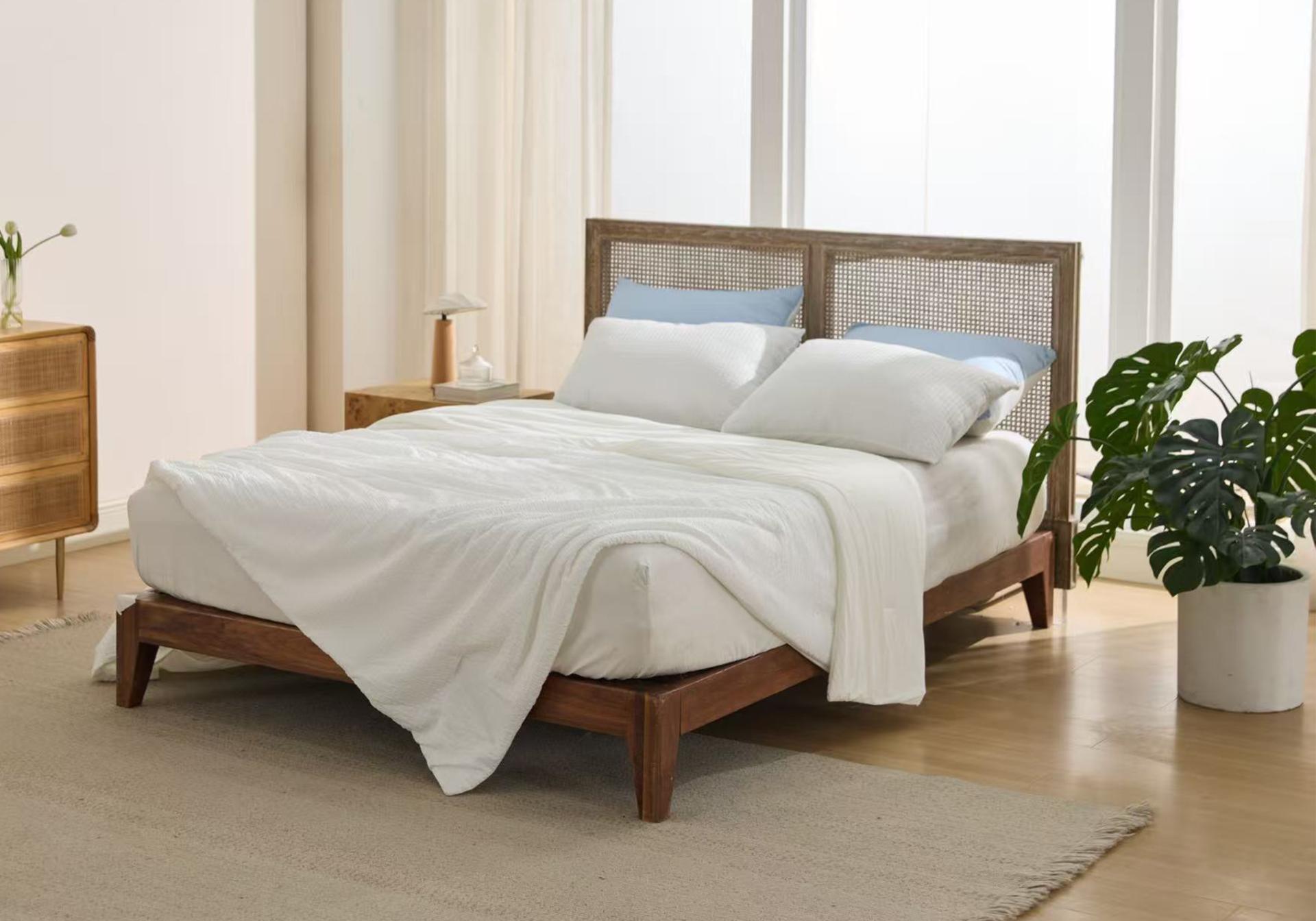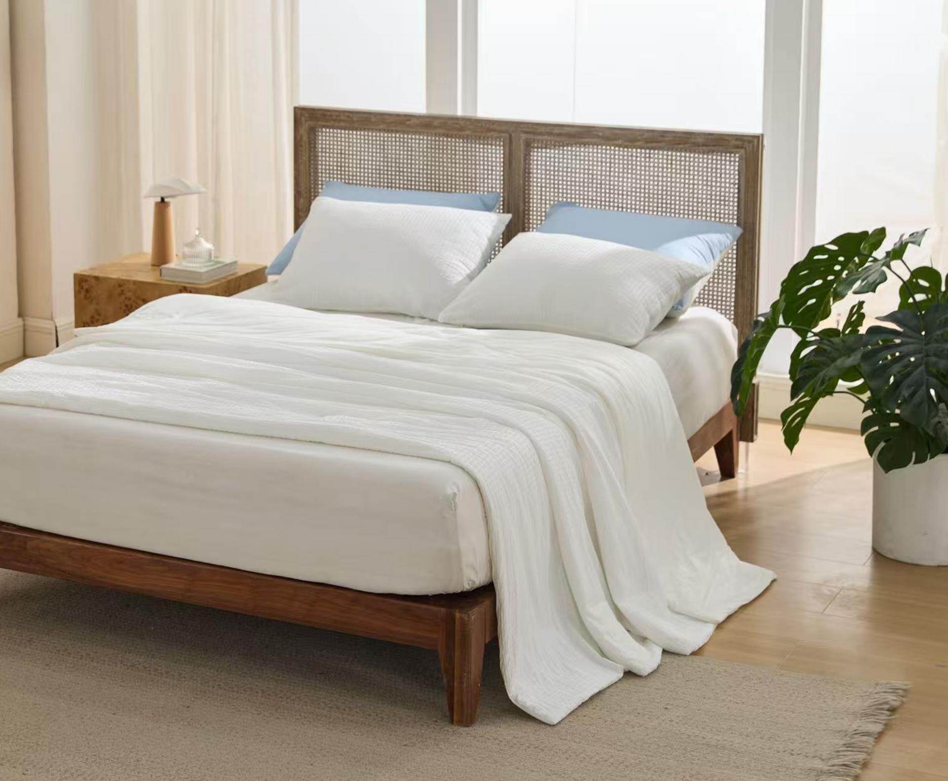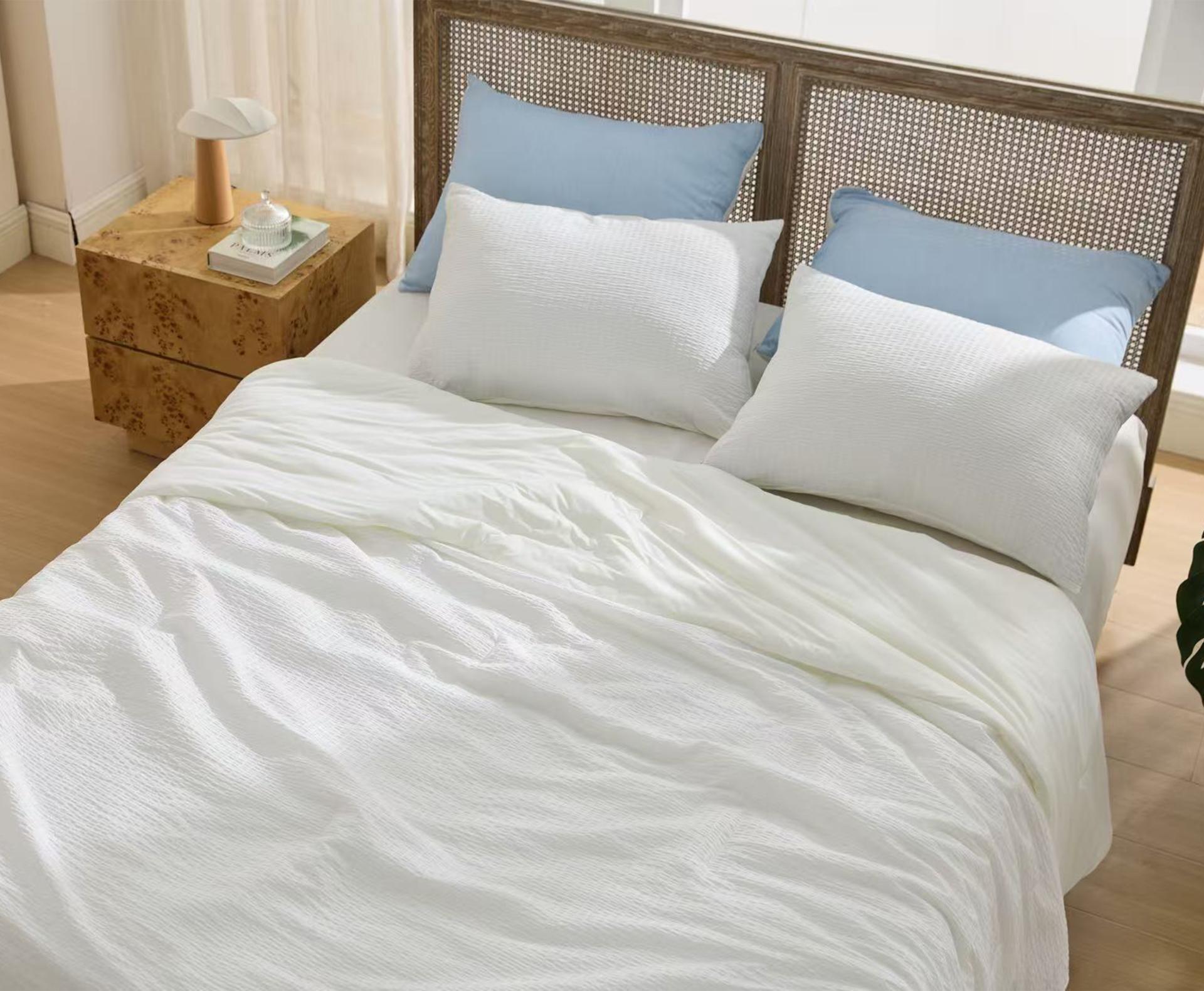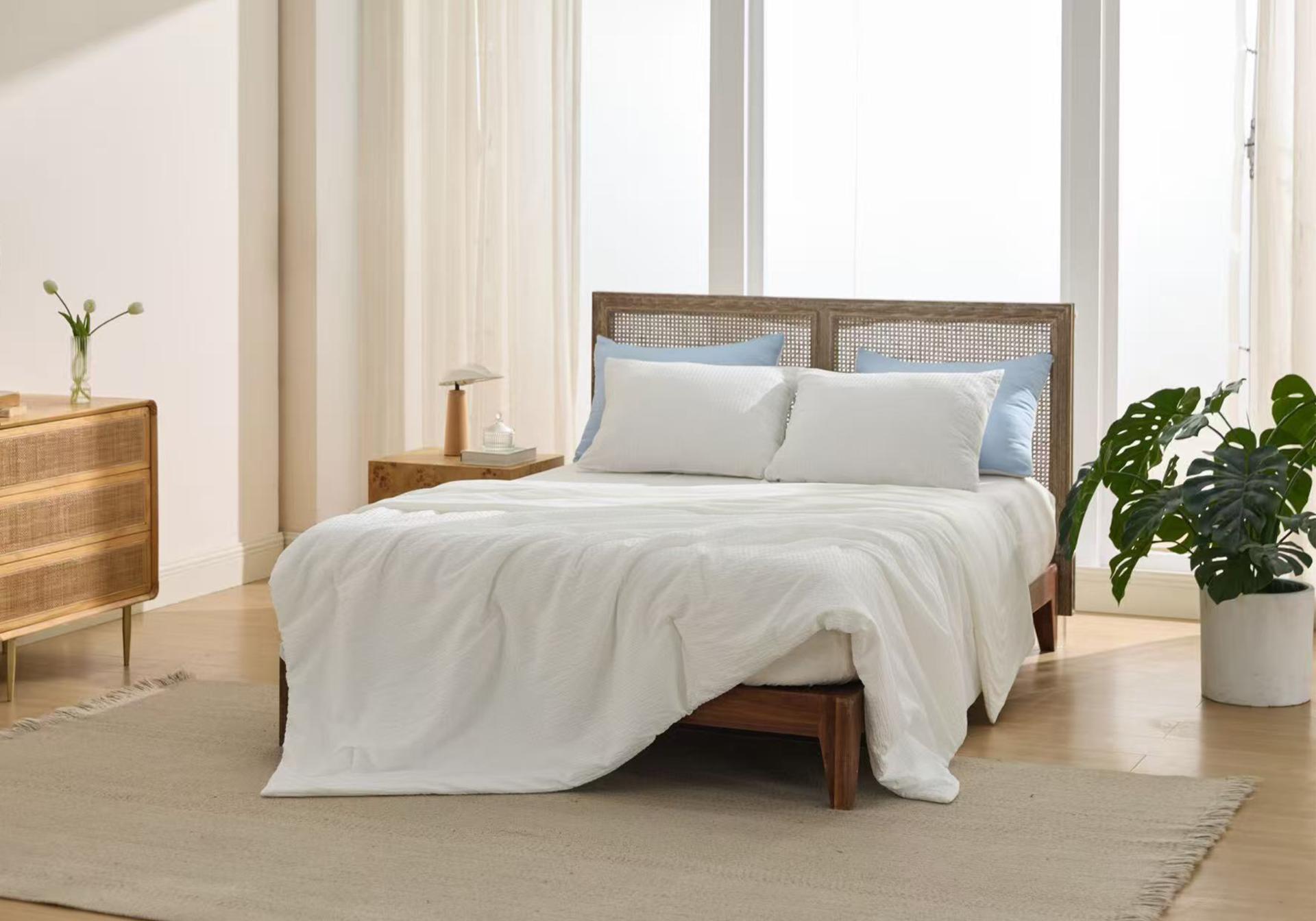The dual-sided structure precisely caters to different comfort needs, allowing users to switch sides according to the environment. Side A uses a three-dimensional seersucker structure. Its raised texture reduces skin contact area and creates natural airflow channels that enhance heat dissipation, delivering a dry and breathable feel. Side B incorporates Rudolph temperature-regulating technology, achieving a high Q-Max value (>0.4) for fast and long-lasting cooling. In addition, the fabric is treated with anti-odor technology that can break down the four main chemical components of sweat, keeping the quilt fresh. Thanks to the hydrophilicity of CASTOR fiber, the fabric overcomes the slow absorption of conventional synthetic fibers, allowing detergent to quickly penetrate deep into the fibers for efficient removal of sweat and stains, addressing hygiene concerns during long-term use.