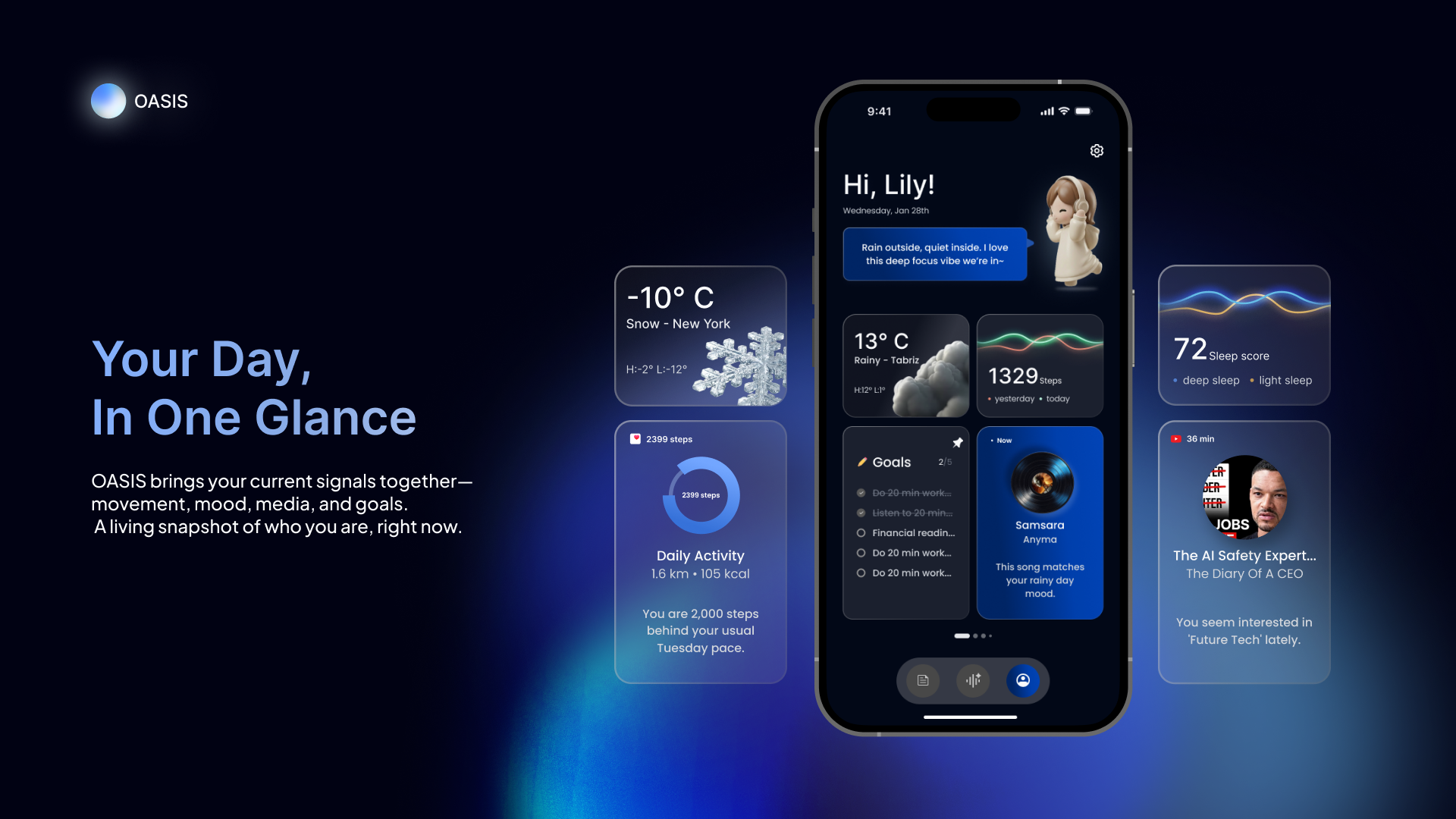 Rather than functioning as a task manager or habit tracker, OASIS integrates real-time behavioral data—such as app usage, screen time, physical movement, music activity, and environmental context—into conversational AI. By synthesizing these signals, OASIS provides insights grounded in lived experience. A simple question like “How’s my week going?” becomes a contextual dialogue informed by focus duration, movement levels, emotional tone, and routine patterns.