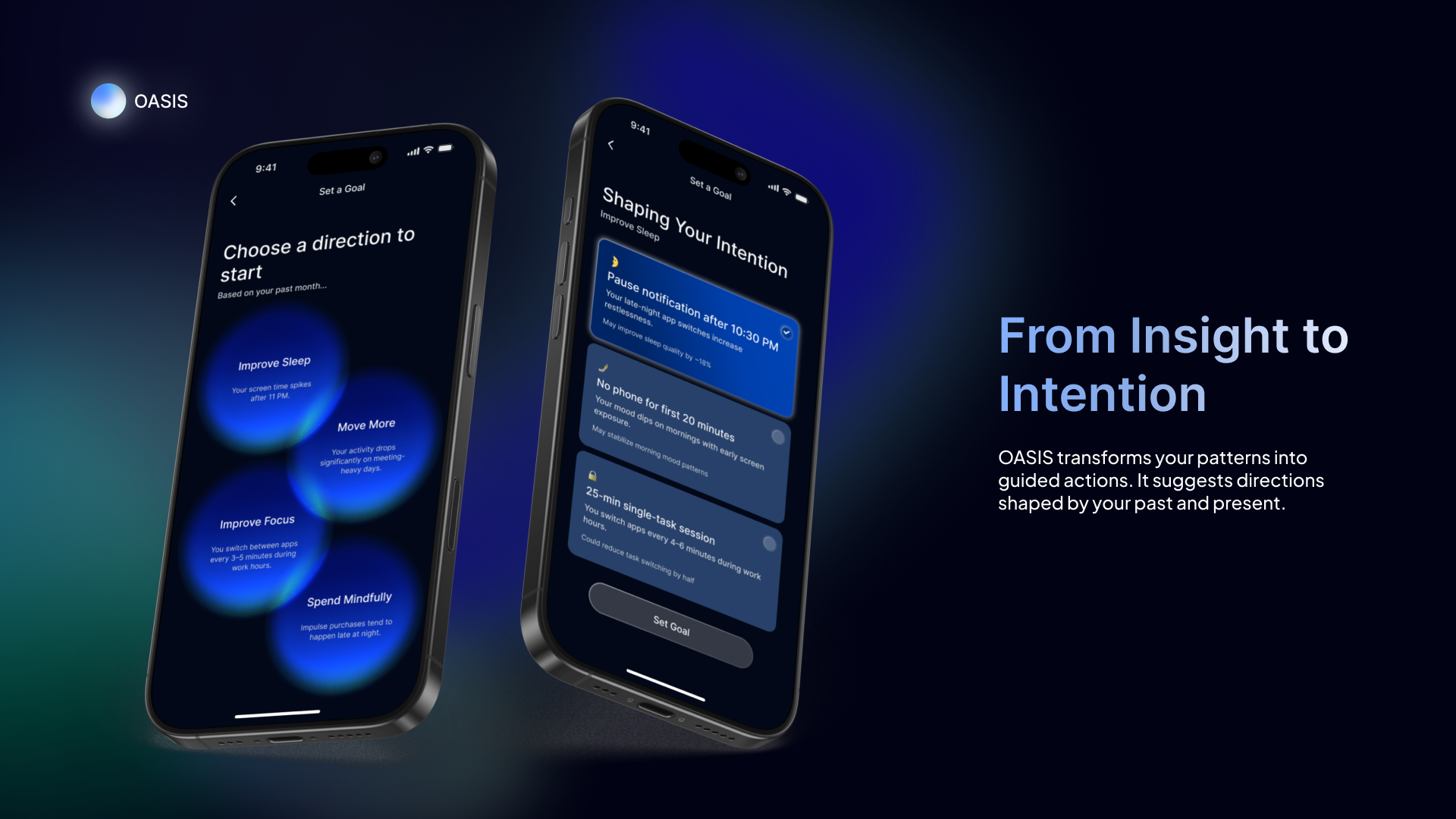 The system reframes goal-setting as intention-setting. Without streaks, penalties, or gamified pressure, users can gently anchor intentions within conversation or on their dashboard. OASIS emphasizes awareness over optimization.