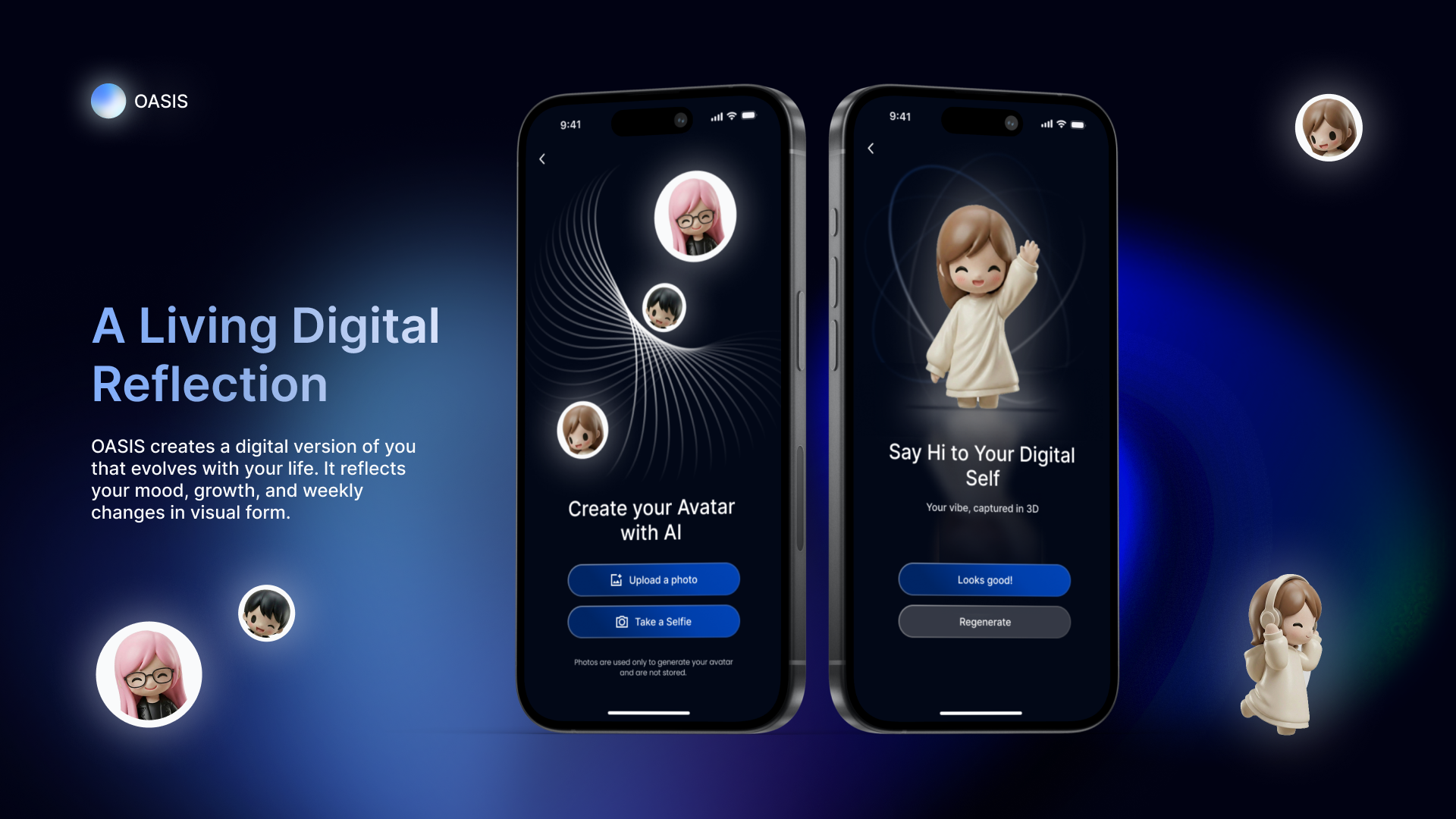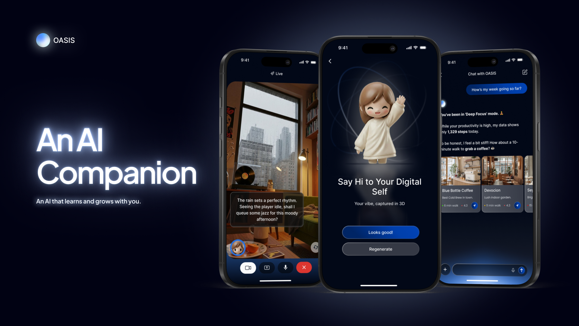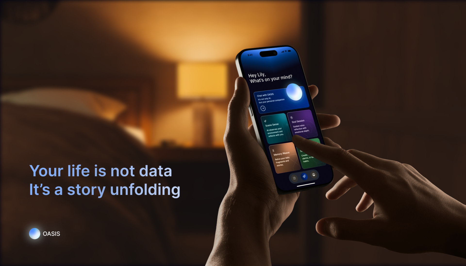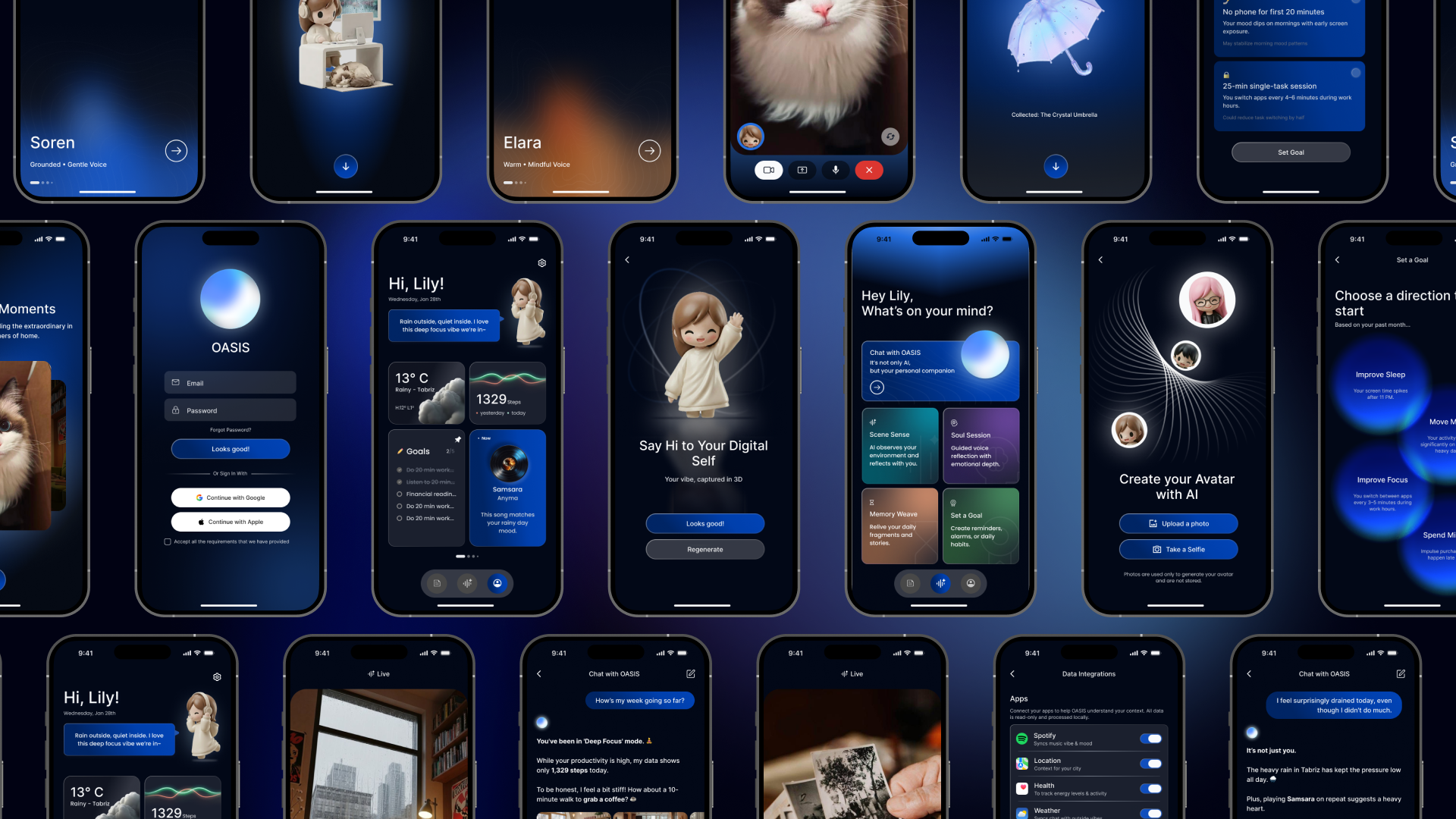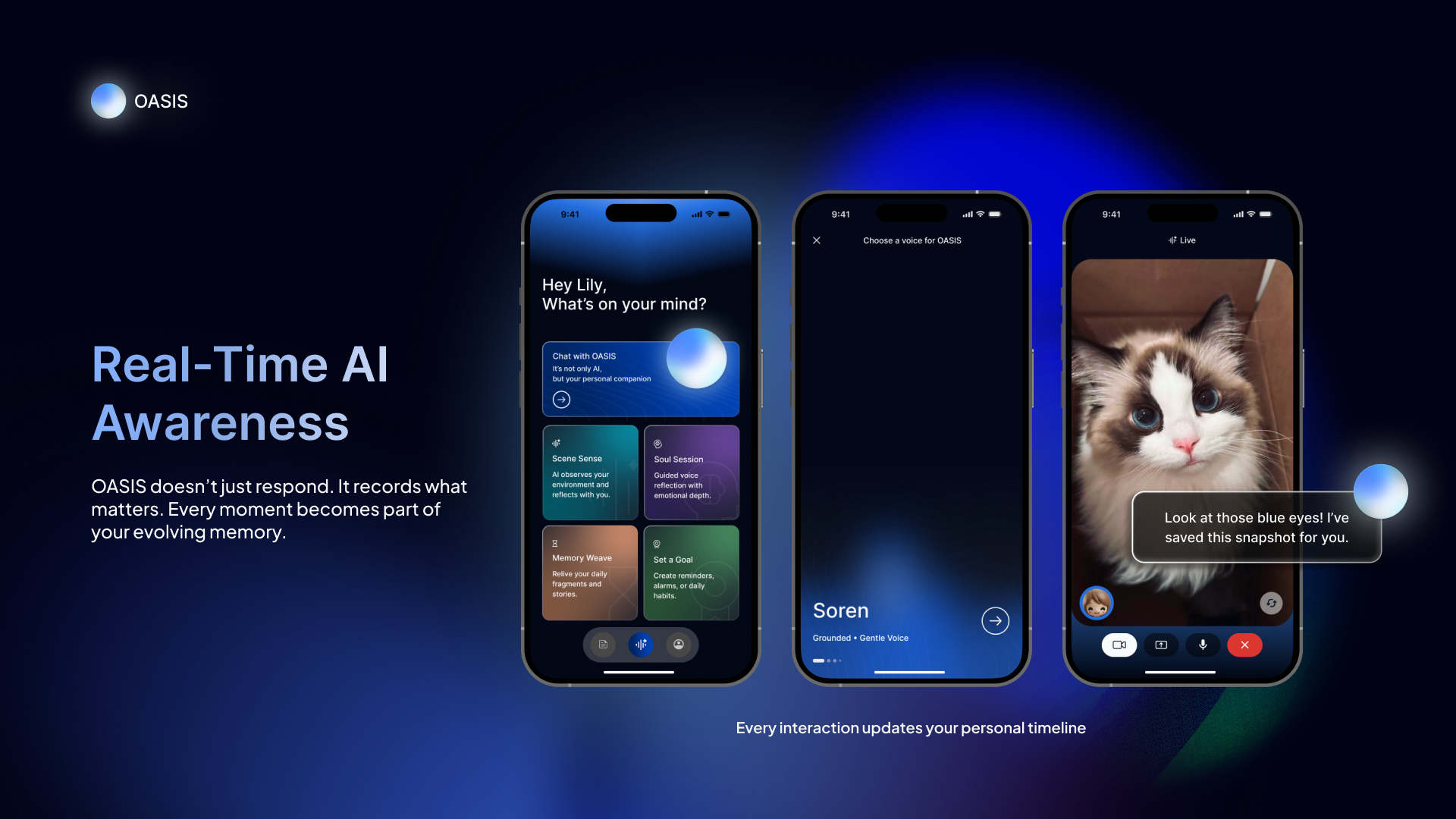 OASIS also introduces live conversational interaction through voice and camera engagement. With selectable personalities such as Soren (Grounded, Gentle) and Elara (Warm, Mindful), the AI responds dynamically to environmental cues, visible behaviors, and emotional context—creating a sense of presence beyond static chat.