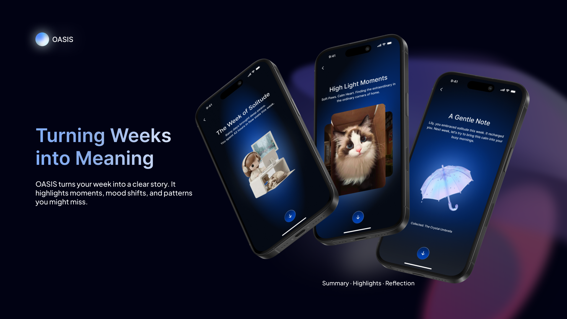 OASIS is an AI companion designed to transform everyday digital behavior into meaningful self-awareness. In a world saturated with productivity tools and performance metrics, OASIS reimagines artificial intelligence as a reflective presence—one that listens, interprets, and responds with empathy.