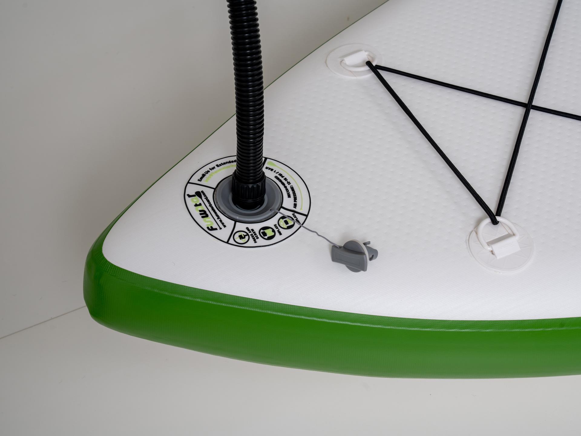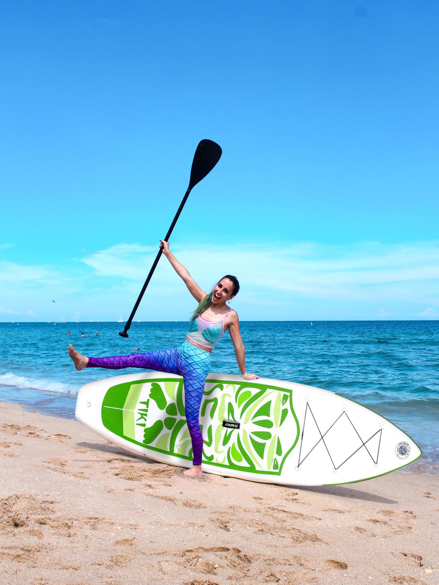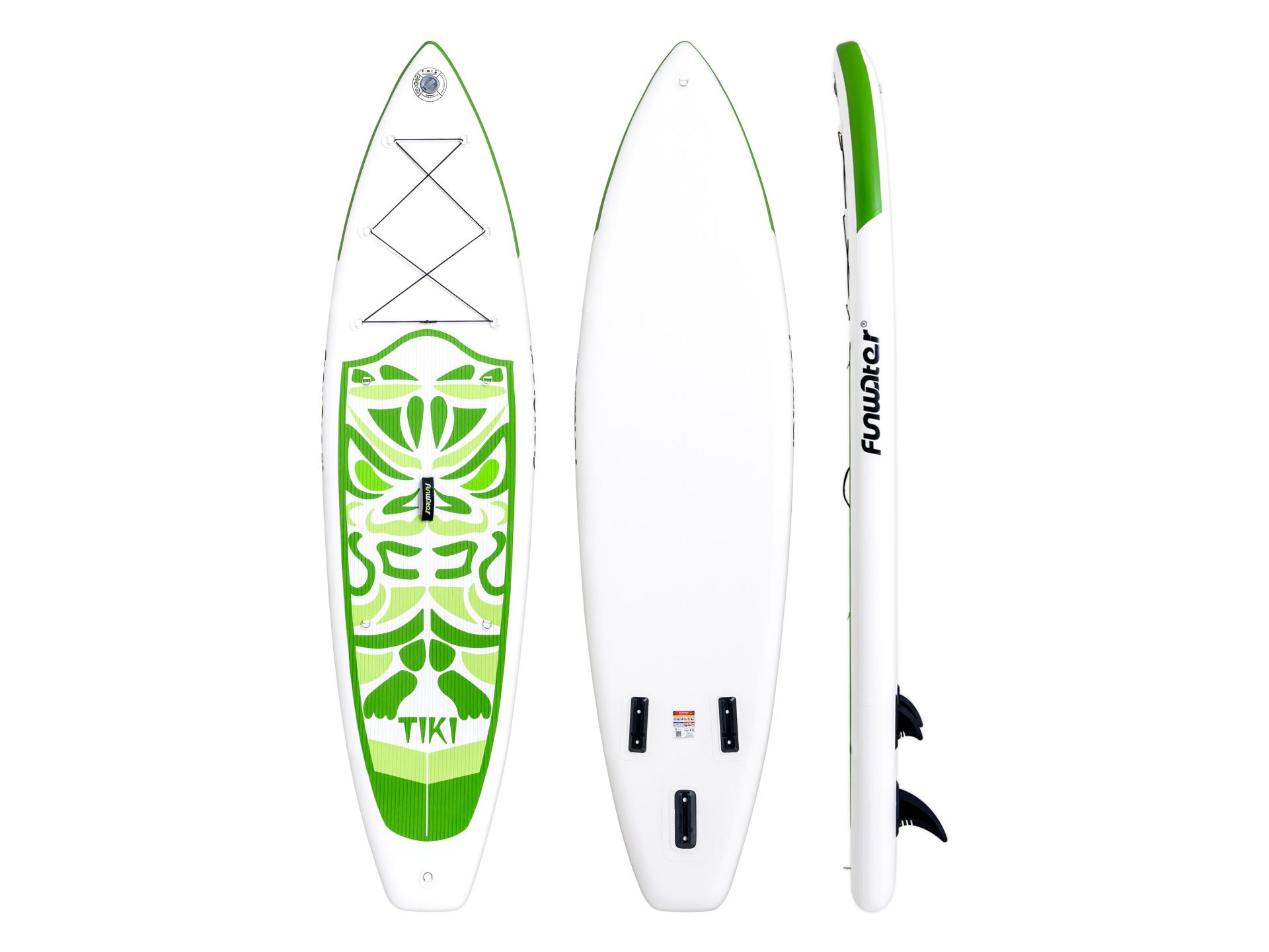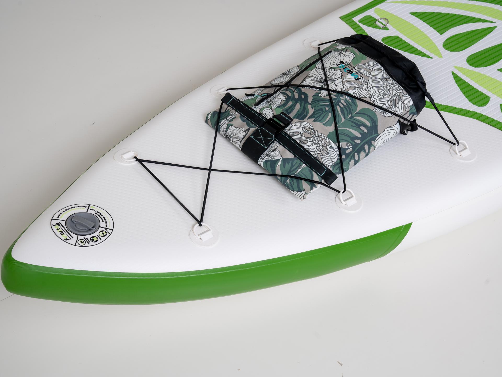 Functionally, Tropical Tiki is equipped with multi-functional stainless steel D-rings, high-elastic bungee cords, and three removable fins, enabling flexible attachment of accessories such as foot straps and seats to accommodate diverse usage scenarios. Made from double-layer reinforced PVC, it is resistant to impact, tearing, extreme temperatures, and UV exposure, while offering excellent airtightness and durability. The sides are hand-bonded with eco-friendly adhesive, making the entire surfboard fully waterproof, safe, and environmentally friendly. Thanks to a one-button high-pressure valve, the surfboard can be inflated or deflated quickly and folded neatly for convenient transport and storage.