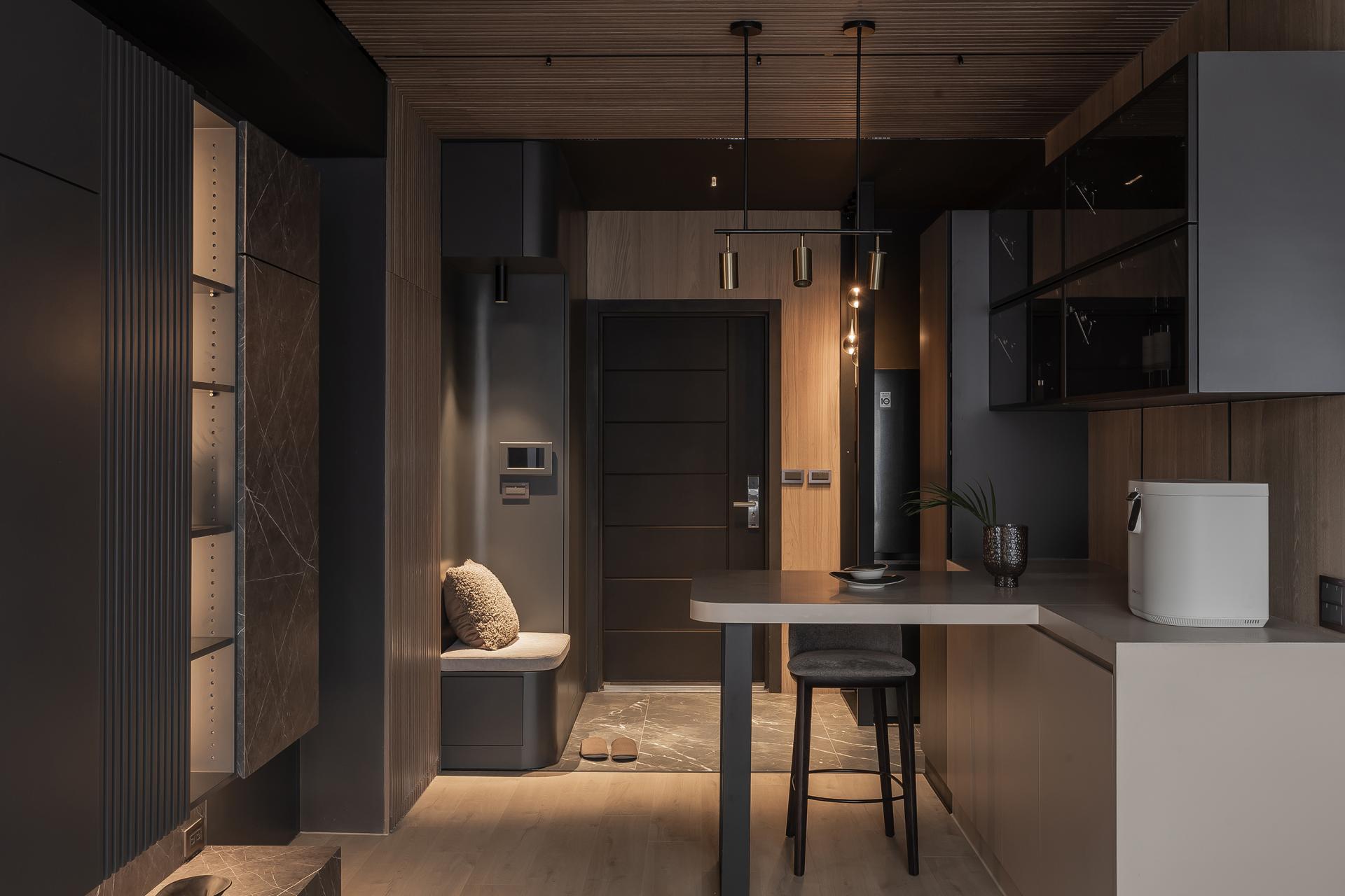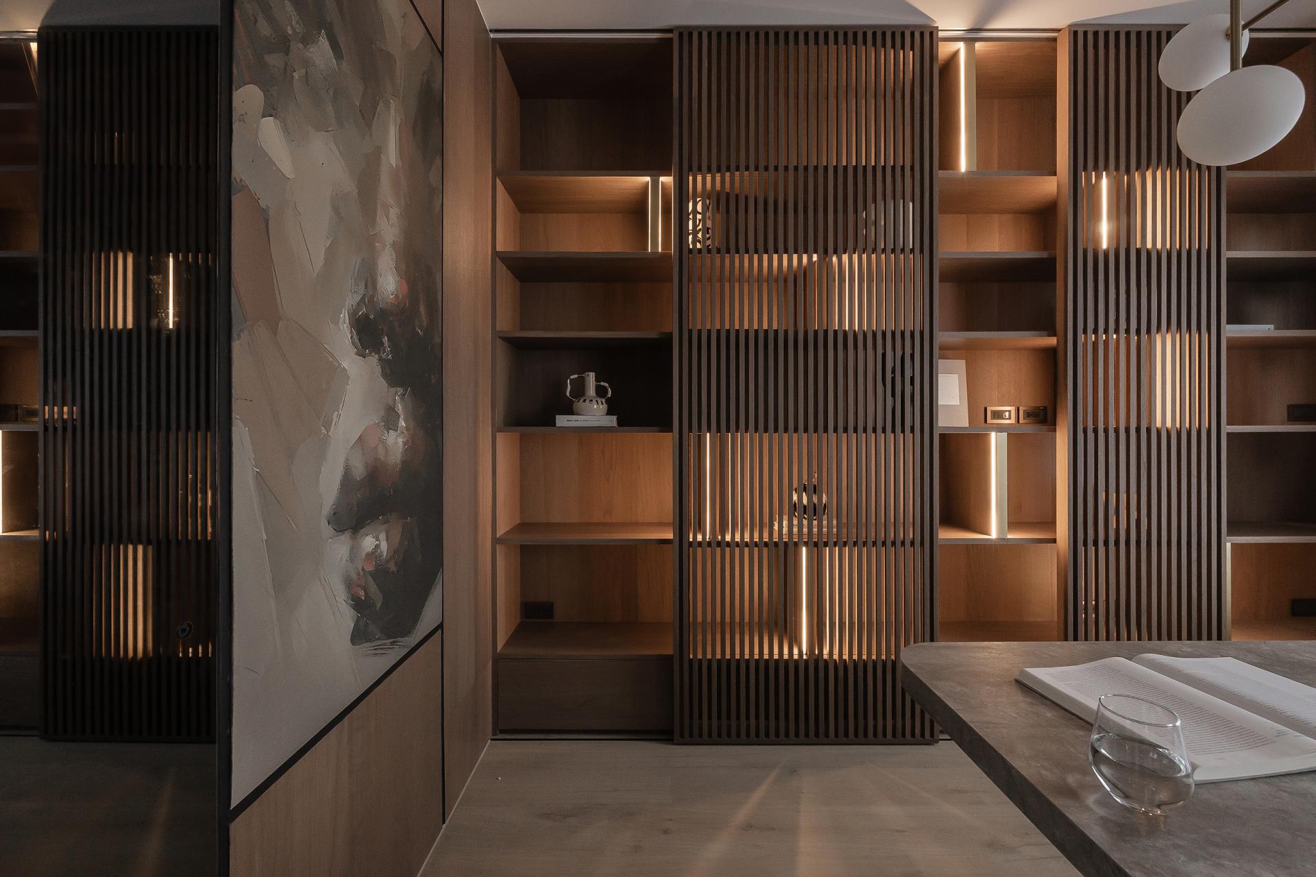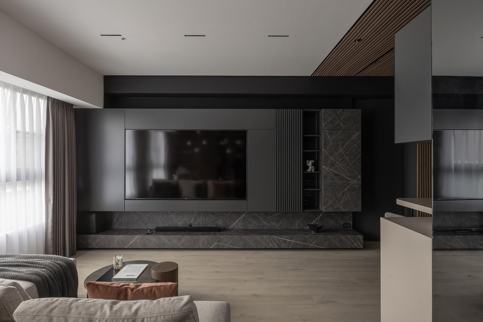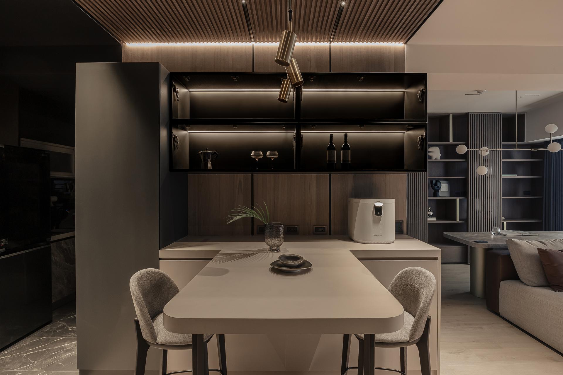 Proportional rhythm was a critical focus to avoid falling into formulaic “Muji-style” impressions. Wooden grilles paired with black-painted finishes and veneer panels layer the entryway and dining area, while the study and living room were opened into a space featuring gray mirrors and metallic paint to convey understated luxury. Ceiling beams were visually dissolved with mirrored treatments, transforming interruptions into extensions. The designer believes that “the meaning of home is not simply to provide shelter, but to weave daily life into memorable light and shadow.” In this way, rest and memory intertwine to define home, growing with the family over time.