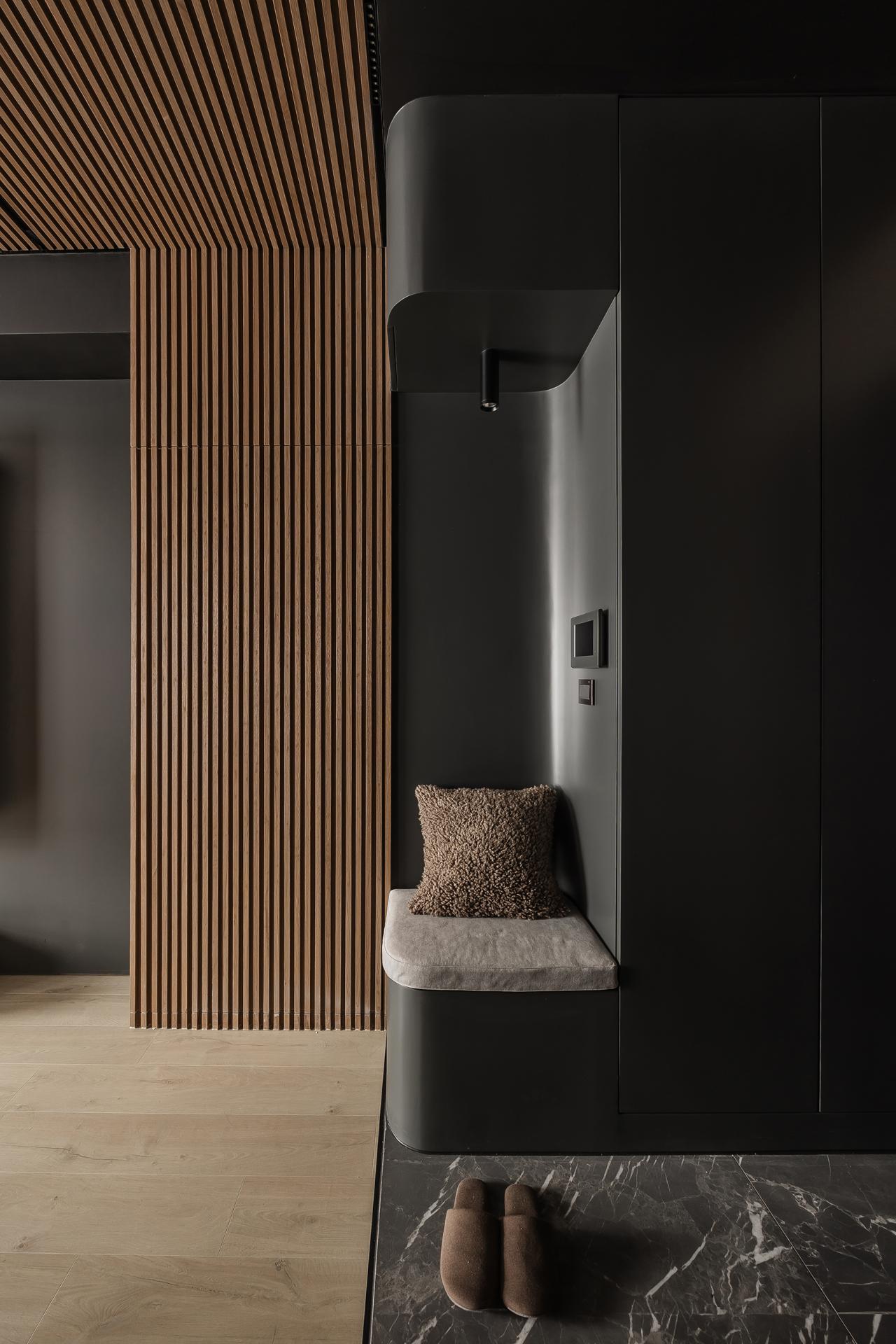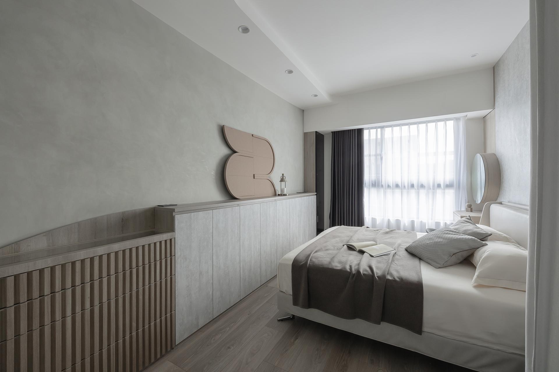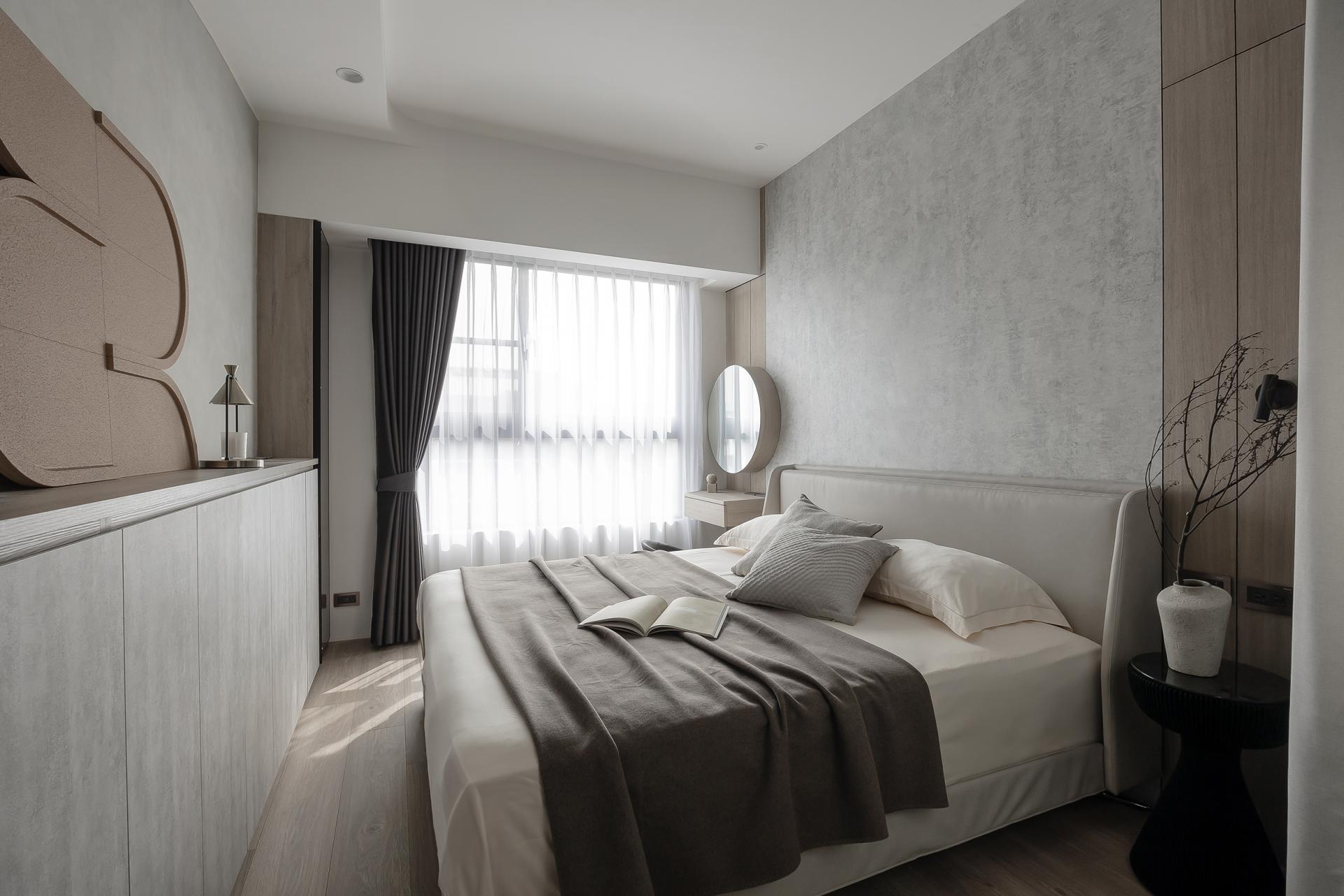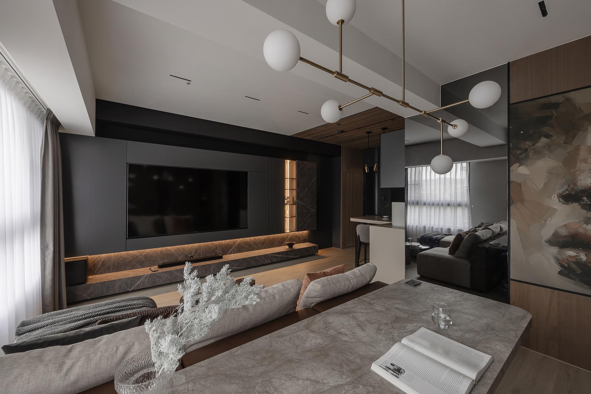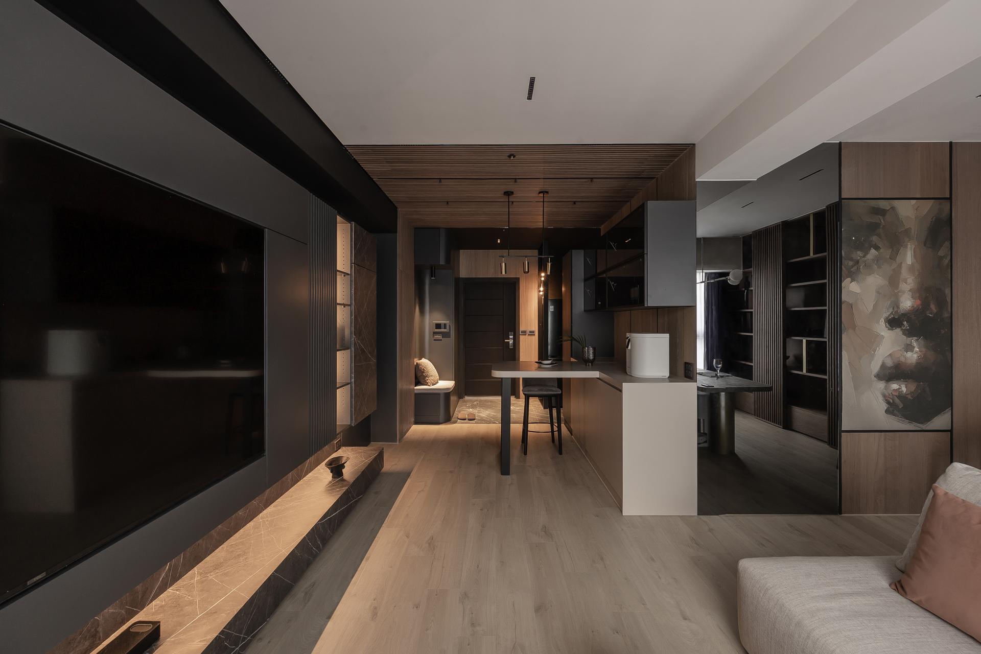 Proportional rhythm was a critical focus to avoid falling into formulaic “Muji-style” impressions. Wooden grilles paired with black-painted finishes and veneer panels layer the entryway and dining area, while the study and living room were opened into a space featuring gray mirrors and metallic paint to convey understated luxury. Ceiling beams were visually dissolved with mirrored treatments, transforming interruptions into extensions. The designer believes that “the meaning of home is not simply to provide shelter, but to weave daily life into memorable light and shadow.” In this way, rest and memory intertwine to define home, growing with the family over time.