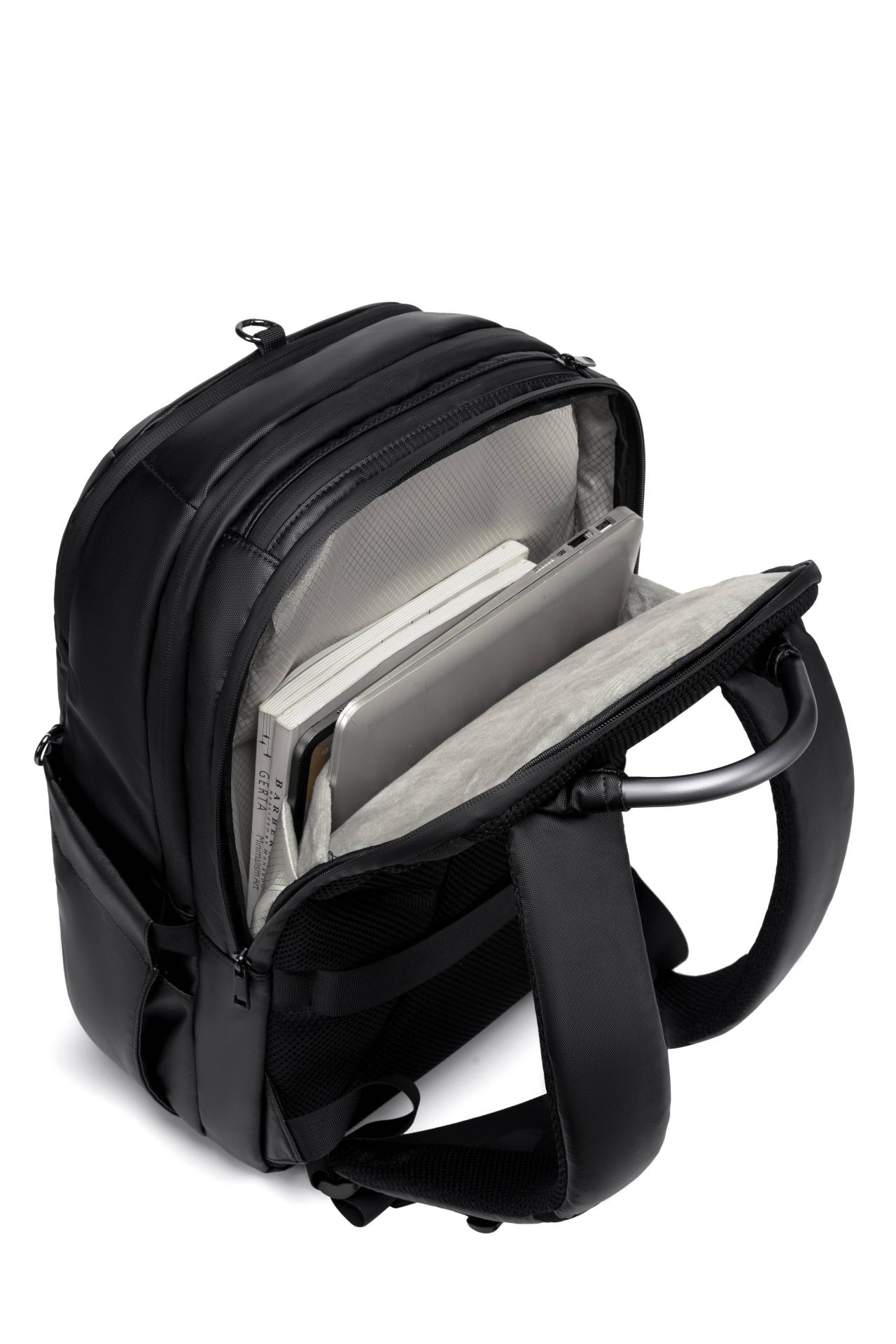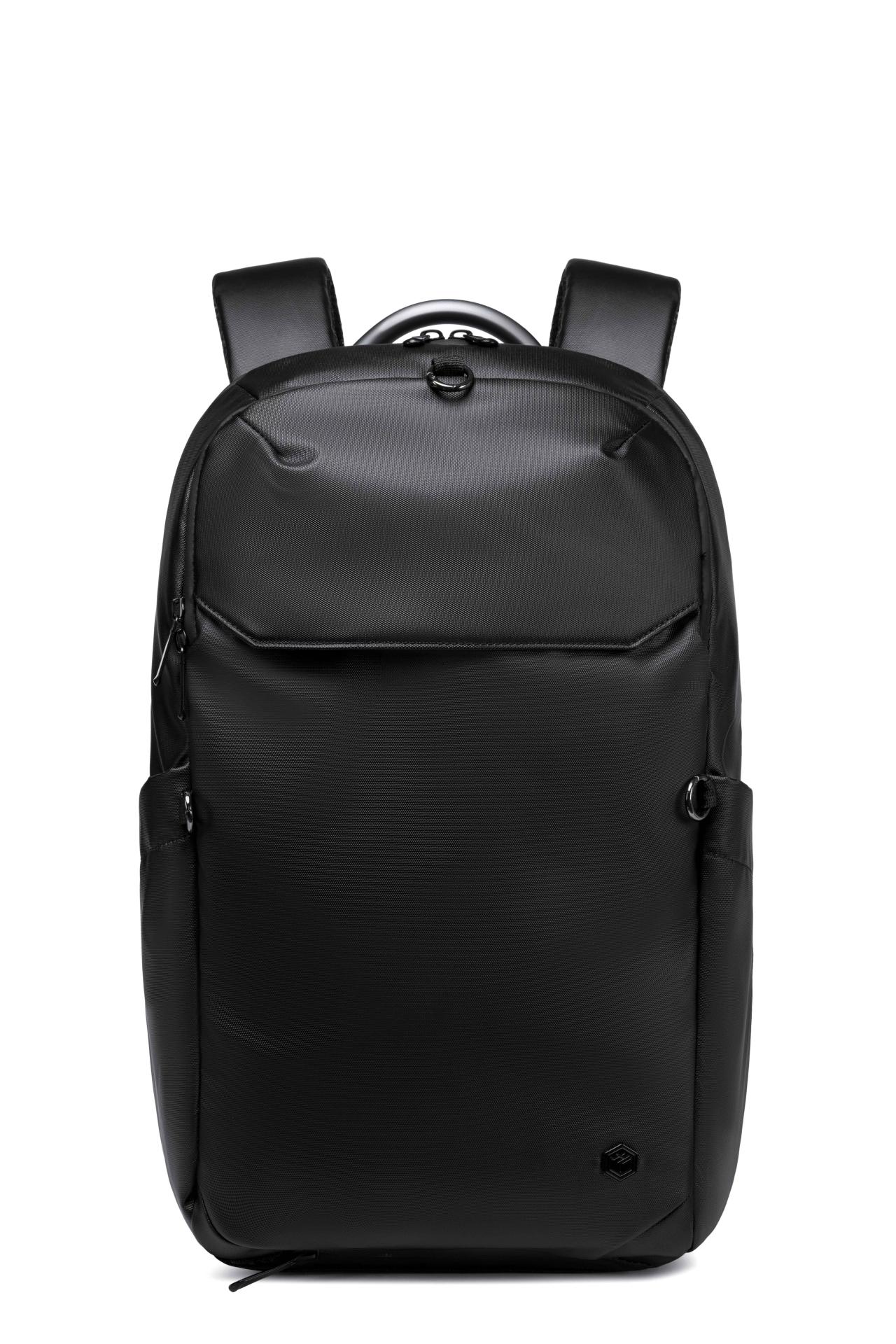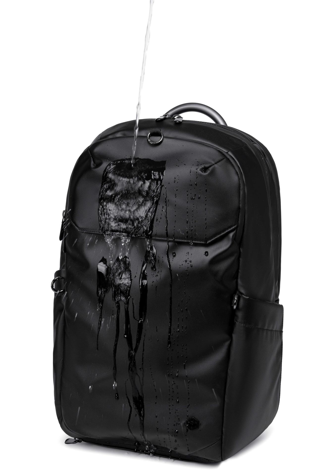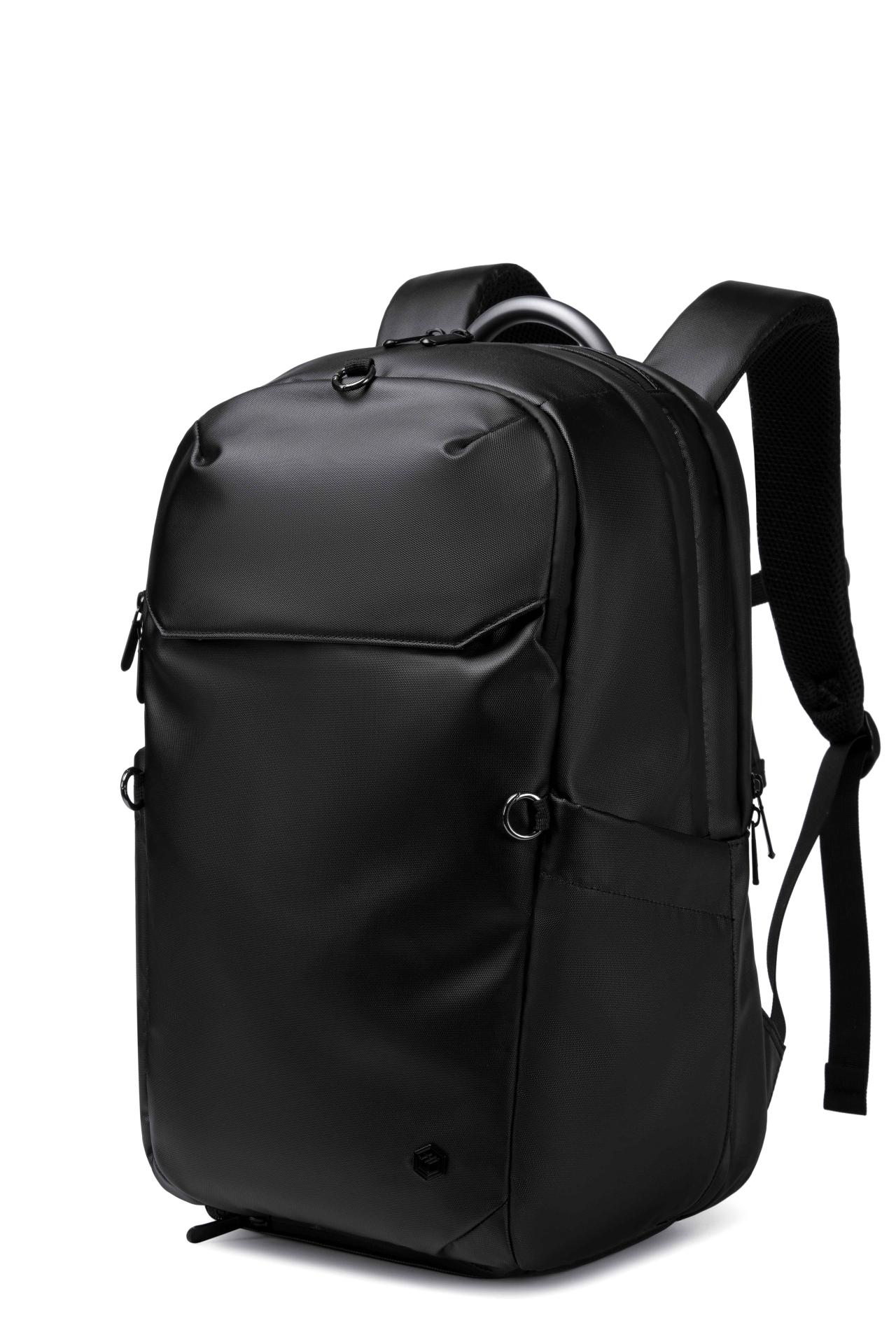 The design features a primarily black color with minimalist geometric design. Its sharp, three-dimensional rectangular shape, designed with golden-ratio proportions, creates a modern, understated, and sophisticated aesthetic. The backpack is crafted from functional Oxford fabric with a subtle sheen, complemented by water-resistant zippers and gunmetal hardware, offering both refined texture and durability. Its visual and tactile qualities reflect functional aesthetics and a modern tech vibe, making it suitable for office, outdoor, and other settings.