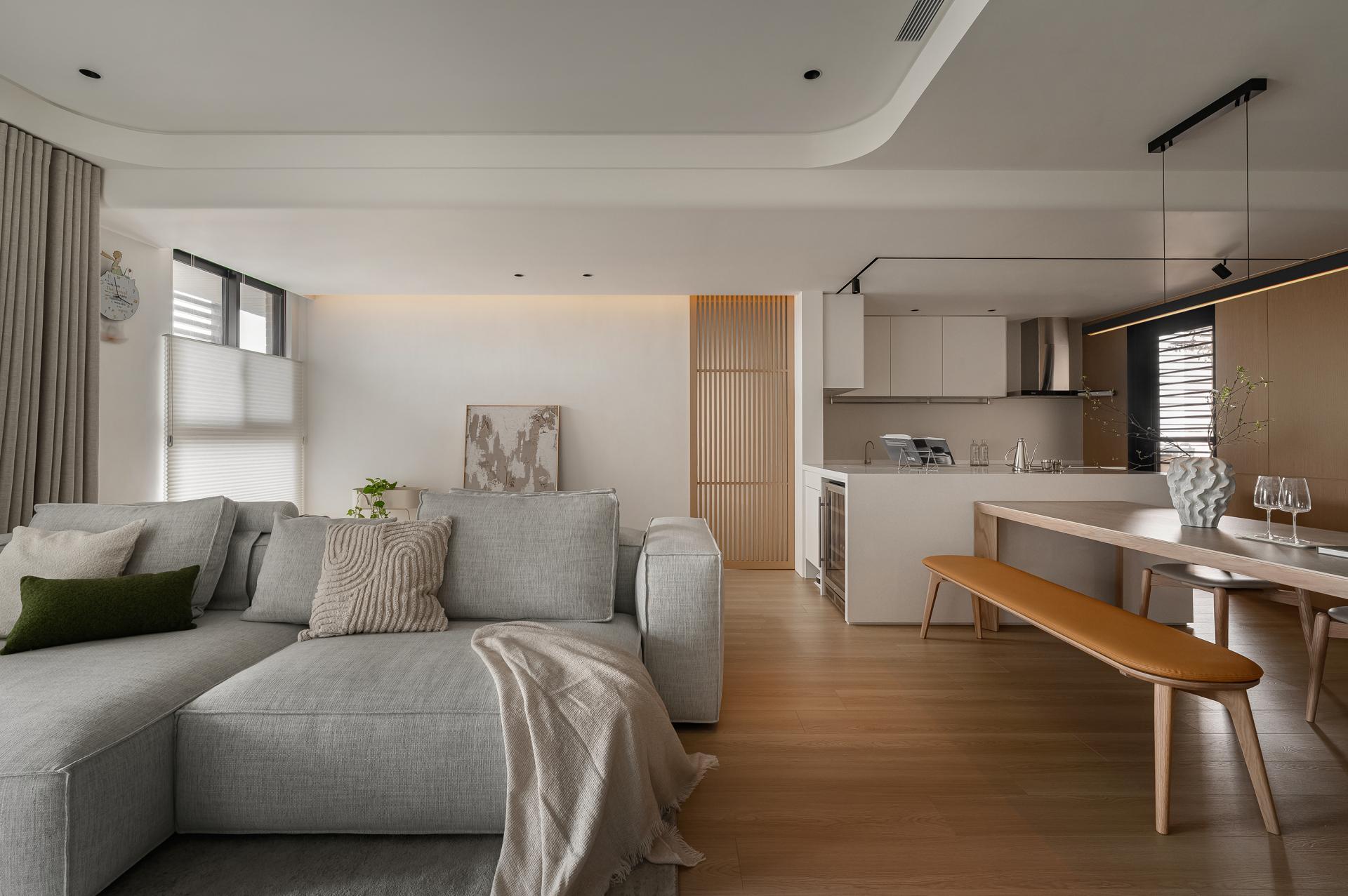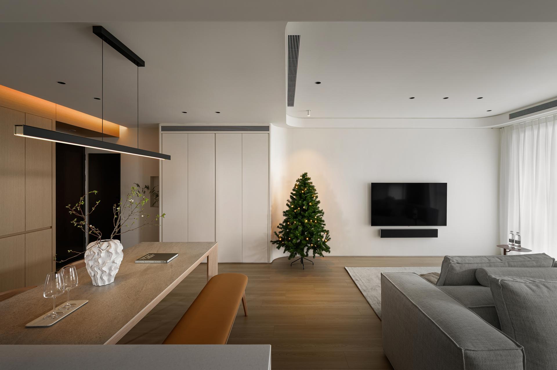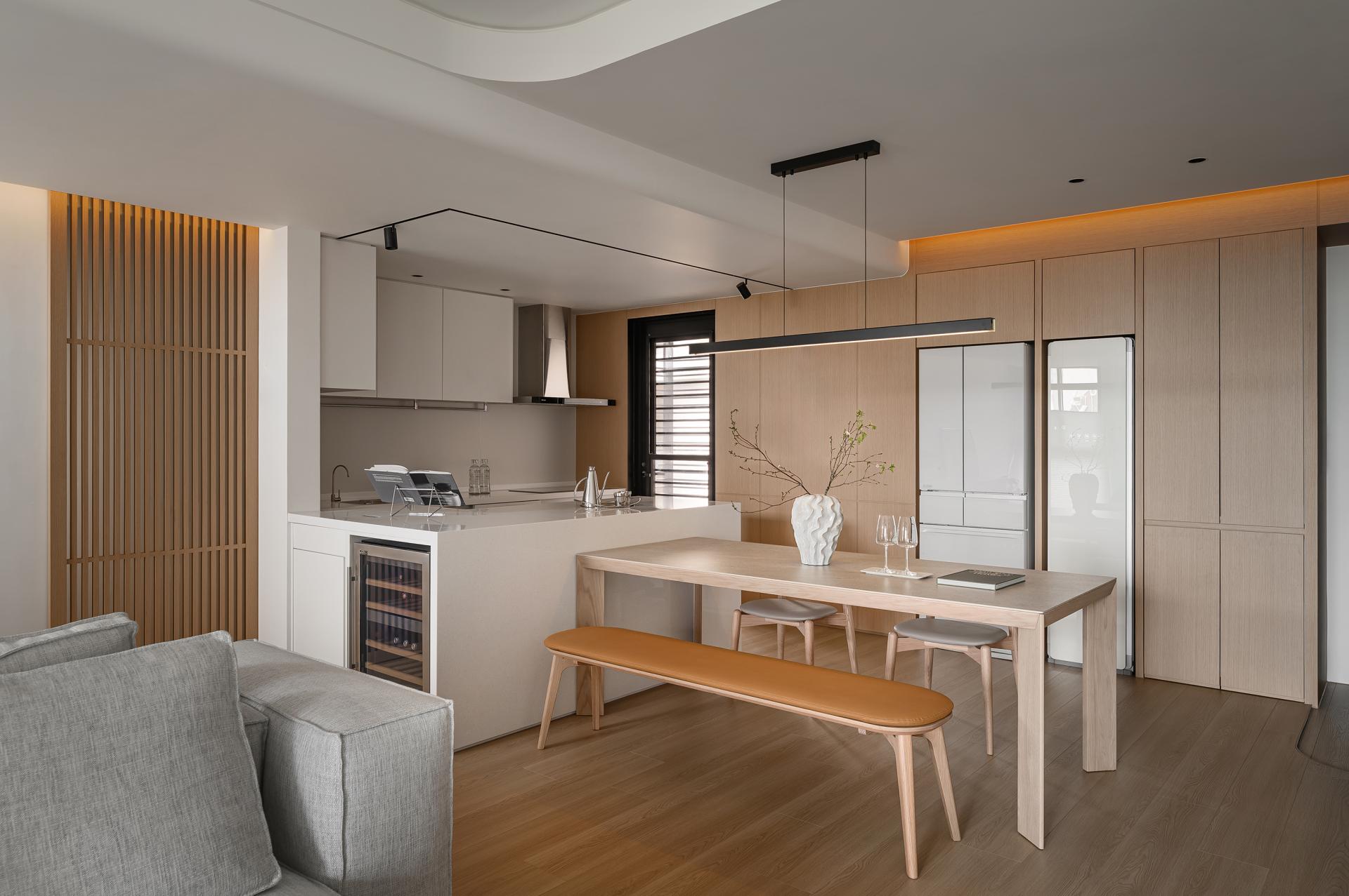 In response to the need for looking after children while cooking, the kitchen island serves as the central workstation, incorporating an oven, rice cooker, wine fridge, and a docking station for the robot vacuum cleaner. Kept the existing engineered stone countertop from the developer to maintain a consistent kitchen system. Cabinet doors are finished in a soft ivory tone, reflecting the homeowner’s preferences. From the entryway to the dining area, warm wood veneer defines the main feature wall, reinforcing spatial accents.